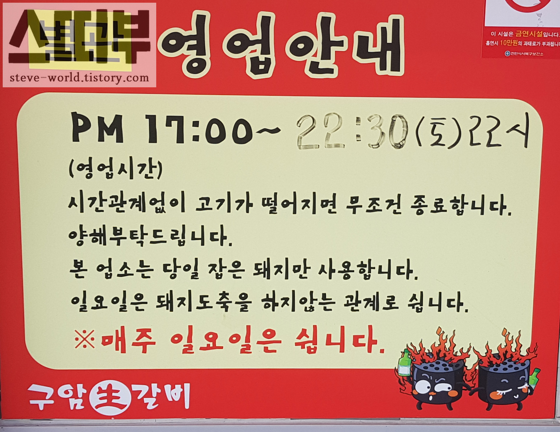 영업시간 : 평일 17:00 ~ 22:30, 토요일 17:00 ~ 22:00, 일요일 휴무