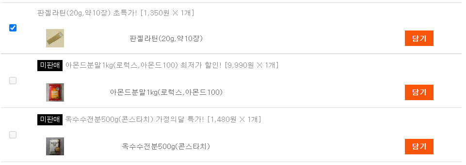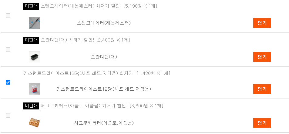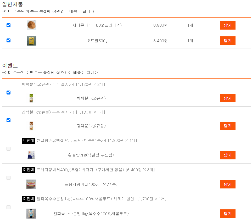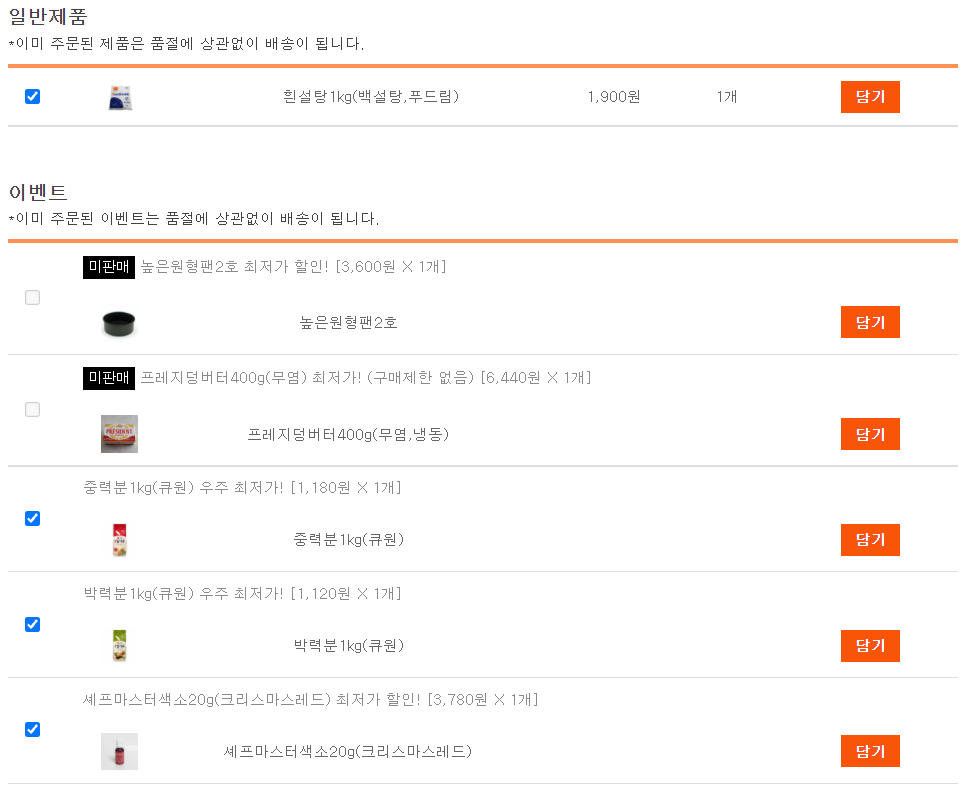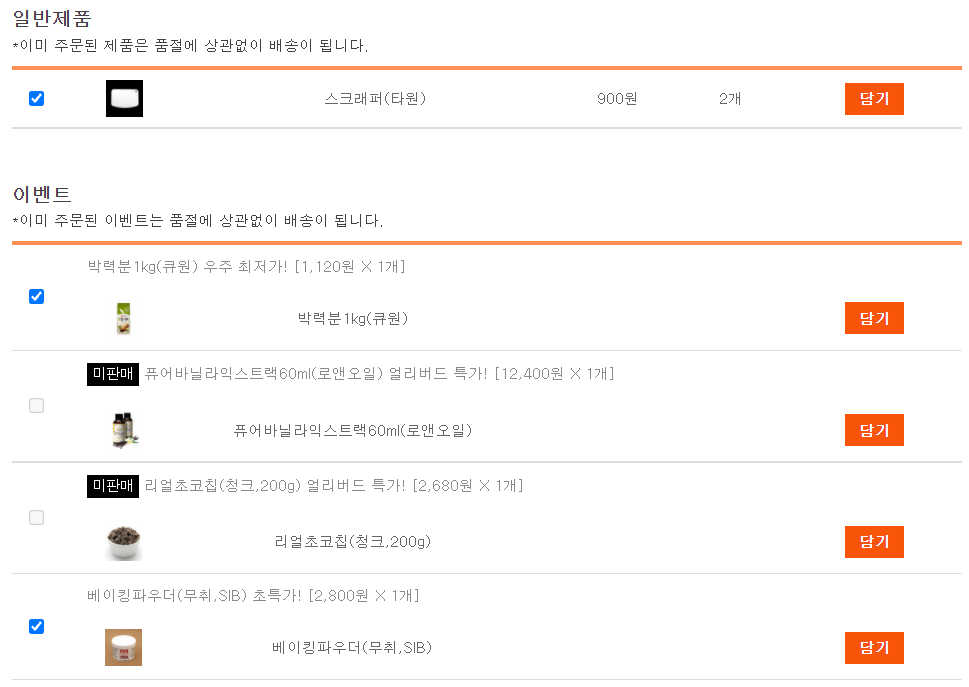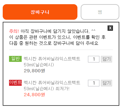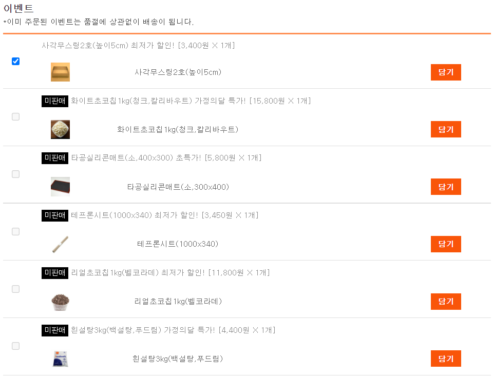 ① 이벤트 가격의 제품 구매베이킹스쿨의 제품은 일반제품과 이벤트제품으로 나뉘는데, 같은 품목의 제품이더라도 이벤트가 진행되고 있다면 훨씬 저렴하게 구매할 수 있습니다. 아래 사진과 같이 장바구니 버튼을 클릭하면, 일반가로 구입할지 이벤트가로 구입할지 선택할 수 있습니다.