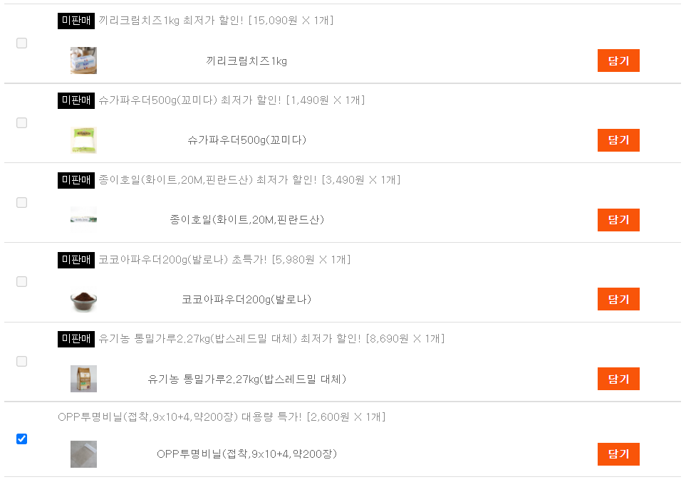 레드벨벳크림치즈쿠키, 바스크치즈케이크, 생크림케이크, 통밀스콘 등을 위해 구입한 재료입니다. 주변 사람들에게 베이킹 결과물을 나눠주기 위해 OPP 투명비닐도 구입했습니다.