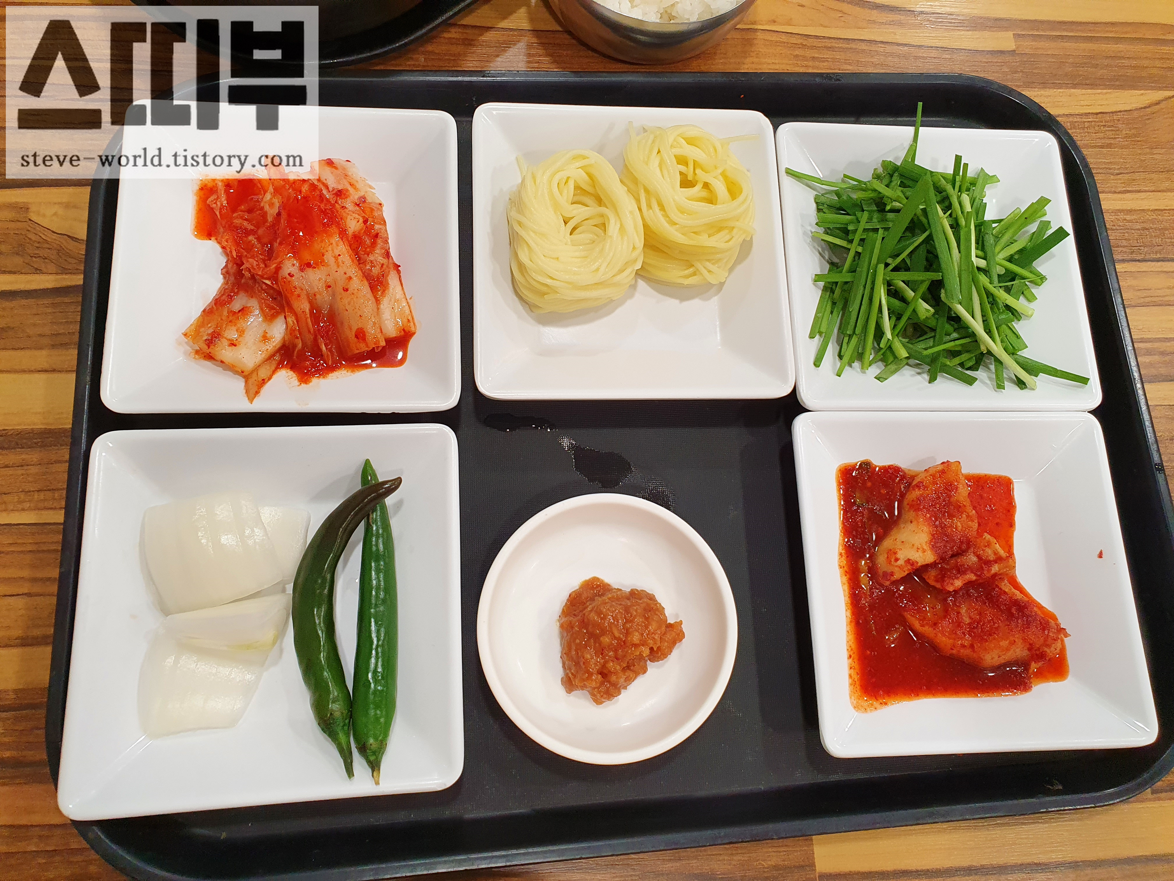 밑반찬입니다. 김치와 소면, 부추, 깍두기, 양파, 고추, 쌈장이 정갈하게 나옵니다. 우측 하단에 있는 깍두기가 정말 맛있었습니다. 돼지국밥 한 그릇을 뚝딱하는데 깍두기를 세 접시나 먹었습니다. 부산 특유의 진한 양념이 매력적입니다. 깍두기보다 조금 큰 크기로 썰려있는 무는 약간 반건조된 꼬들꼬들한 식감이 살아있습니다. 고소하고 진한 돼지국밥과 매콤 달콤한 깍두기의 조합이 좋았습니다.