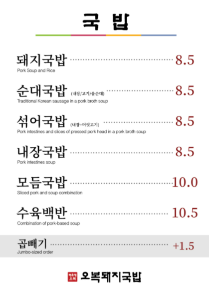 메뉴판 출처는 네이버 지도입니다. 저희는 가장 기본일 것 같은 돼지국밥(8,500원) 두 그릇을 주문해서 17,000원 결재했습니다. 많이 드시는 남성분들은 곱빼기로 드셔도 좋을 듯합니다.