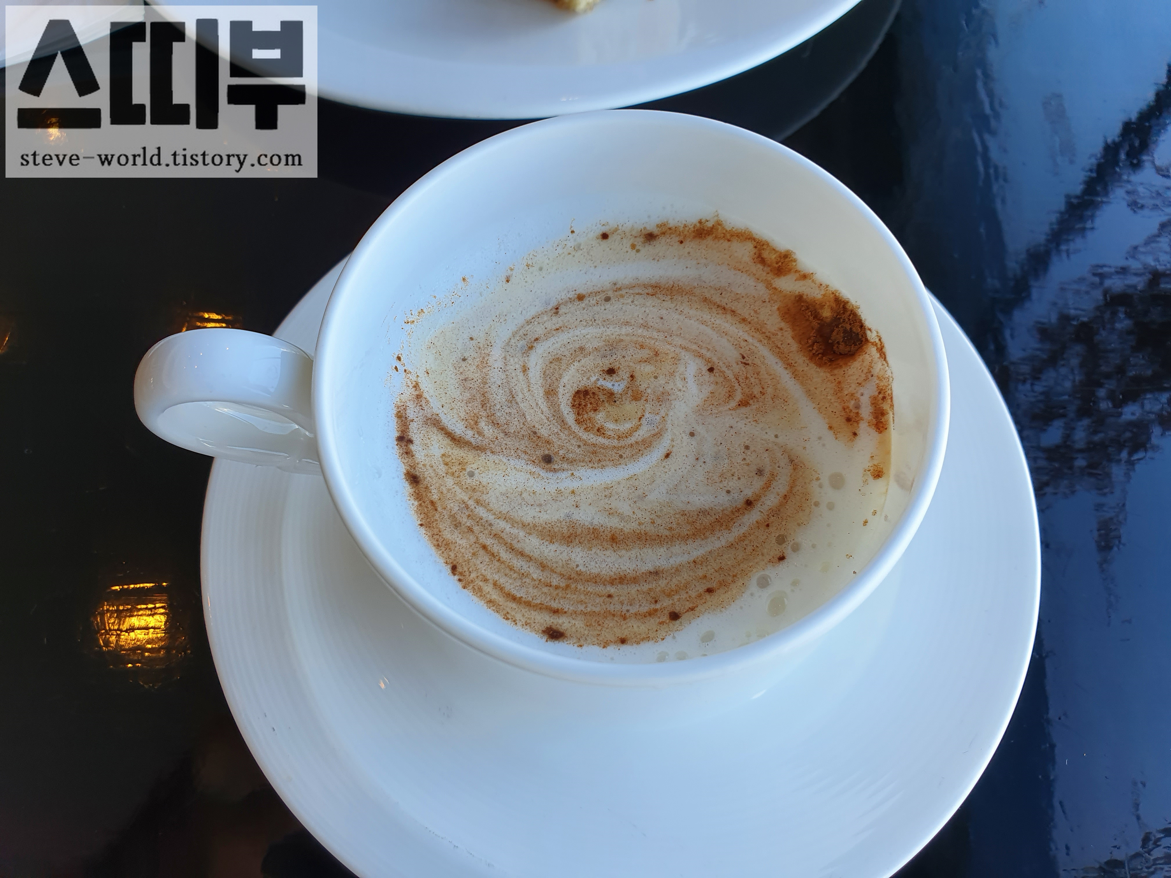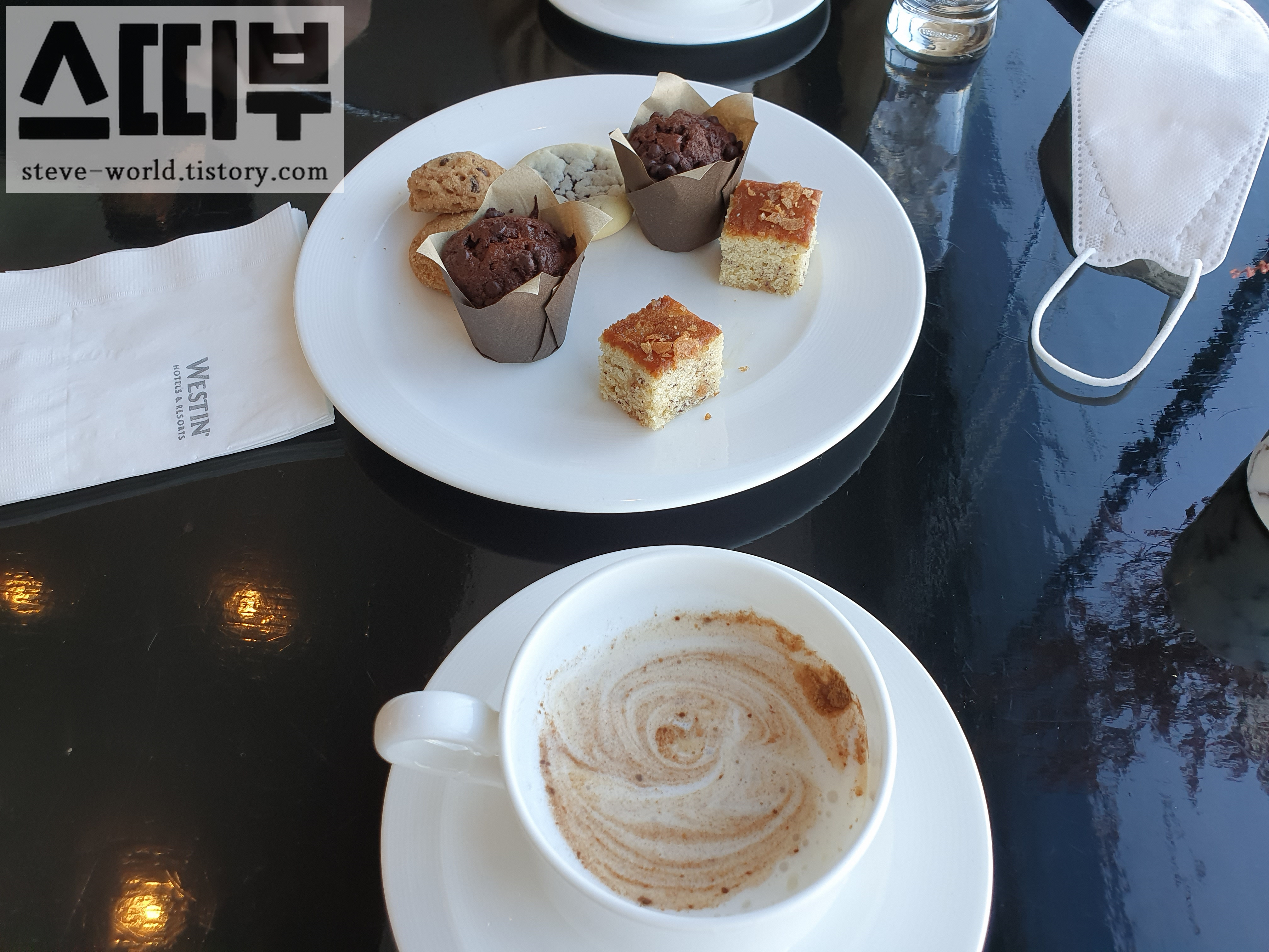 데이타임에는 운 좋게 창가 좌석에 앉았습니다. 클럽 라운지의 창가는 전면이 유리로 시야가 시원하게 뚫려있습니다. 카푸치노와 간단한 쿠키, 디저트류를 담아왔습니다.