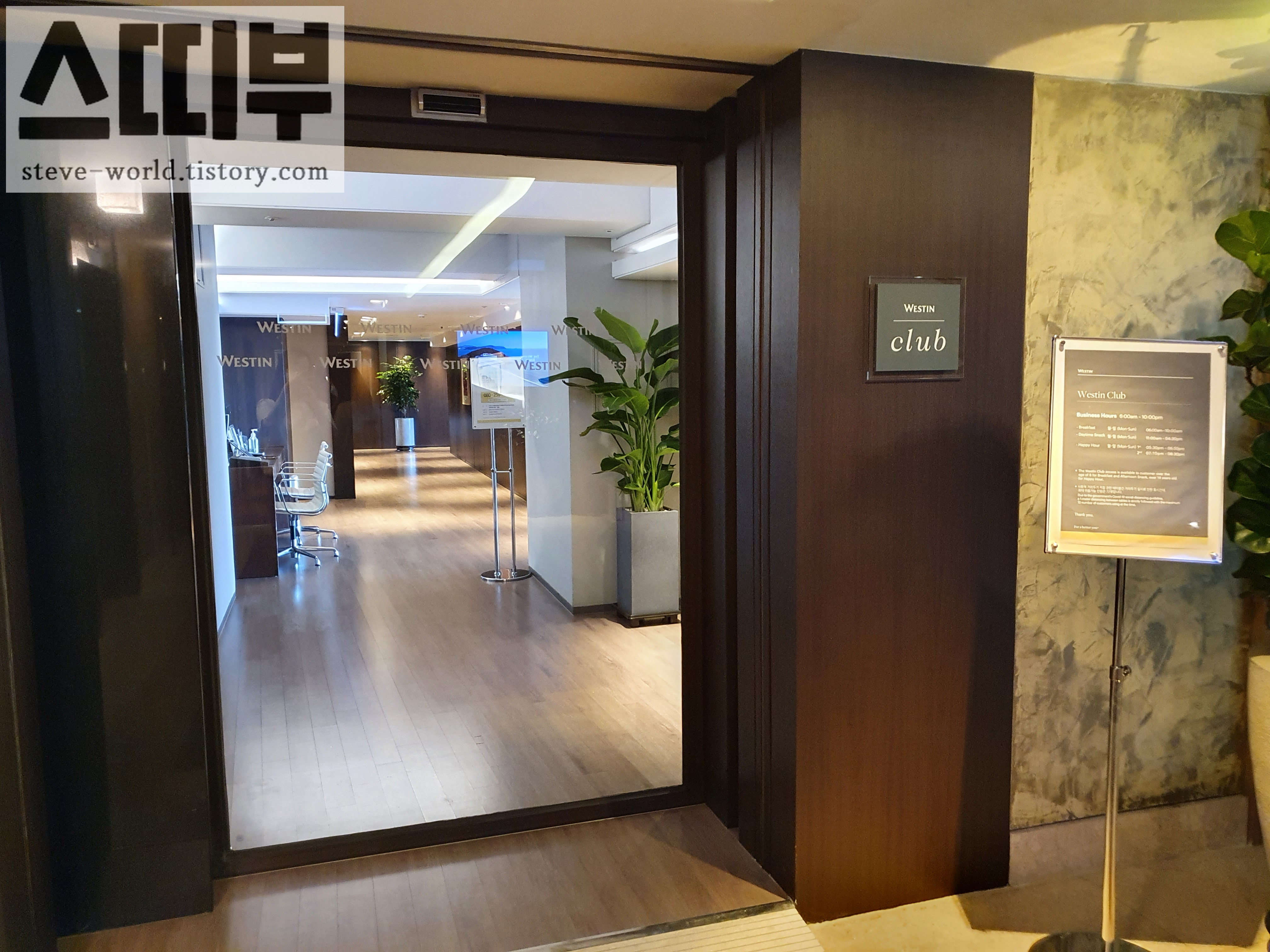 2층 부산 웨스틴 조선 호텔 클럽 라운지 입구입니다. 입구에 운영 시간이 안내되어있습니다. 들어가서 QR코드 스캔을 하고, 룸키를 체킹 했습니다.