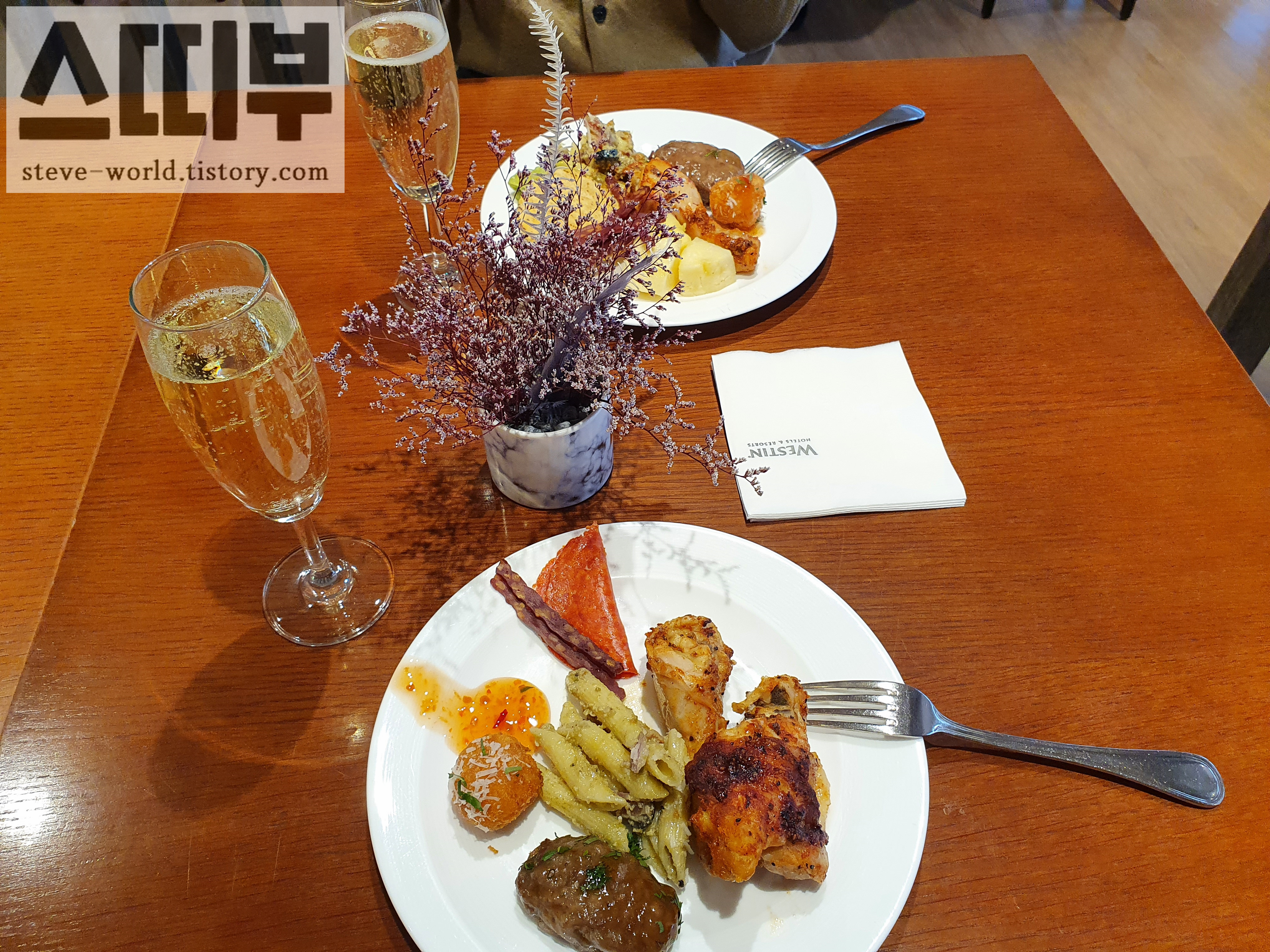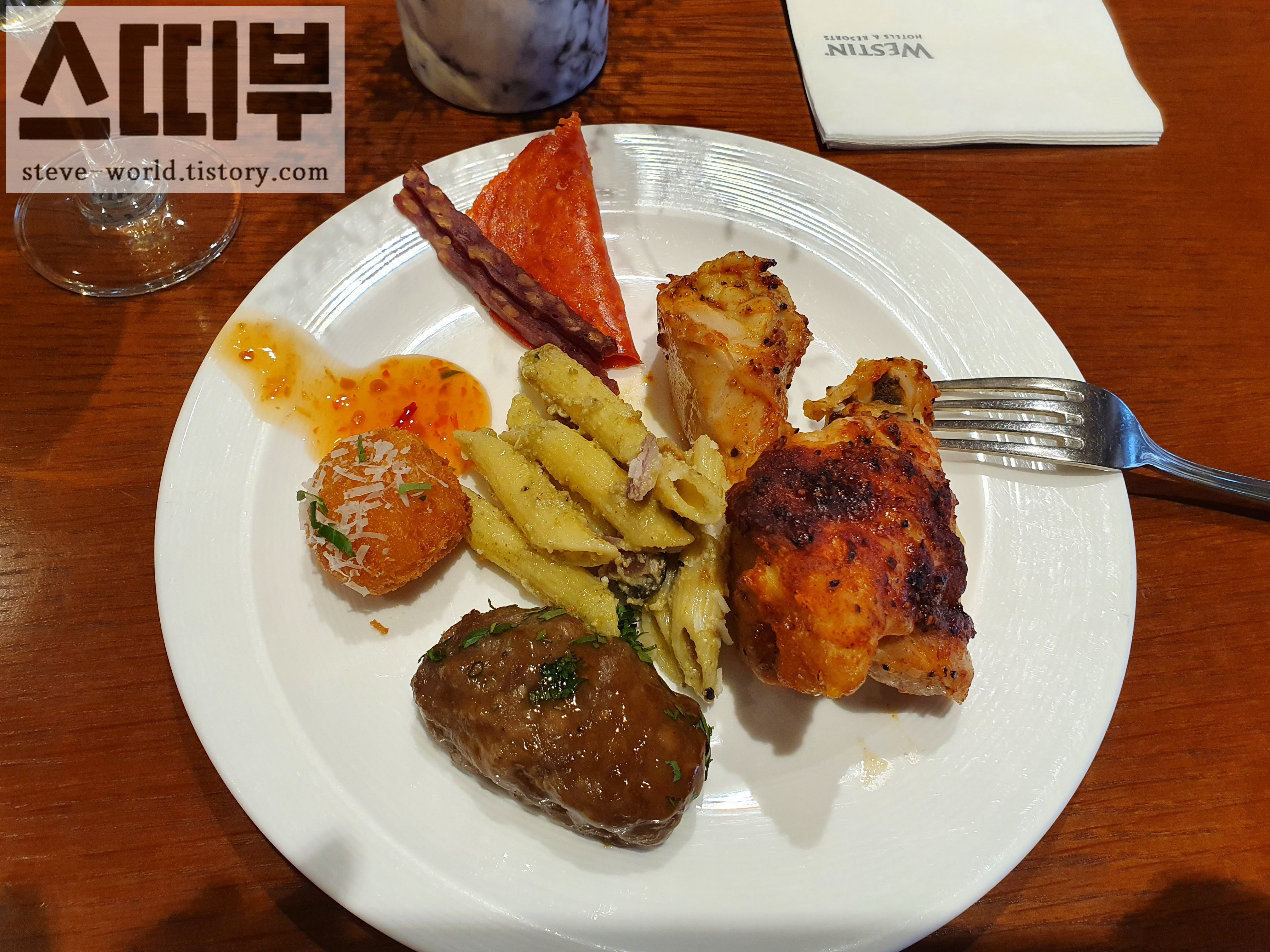 호텔 클럽 라운지 해피아워에서는 샴페인과 살라미, 육포, 펜네 파스타, 떡갈비, 튀긴 새우볼, 구운 치킨을 먹었습니다. 떡갈비는 5년 전에 왔을 때도 맛있게 먹은 기억이 있는데, 역시나 맛있었습니다.