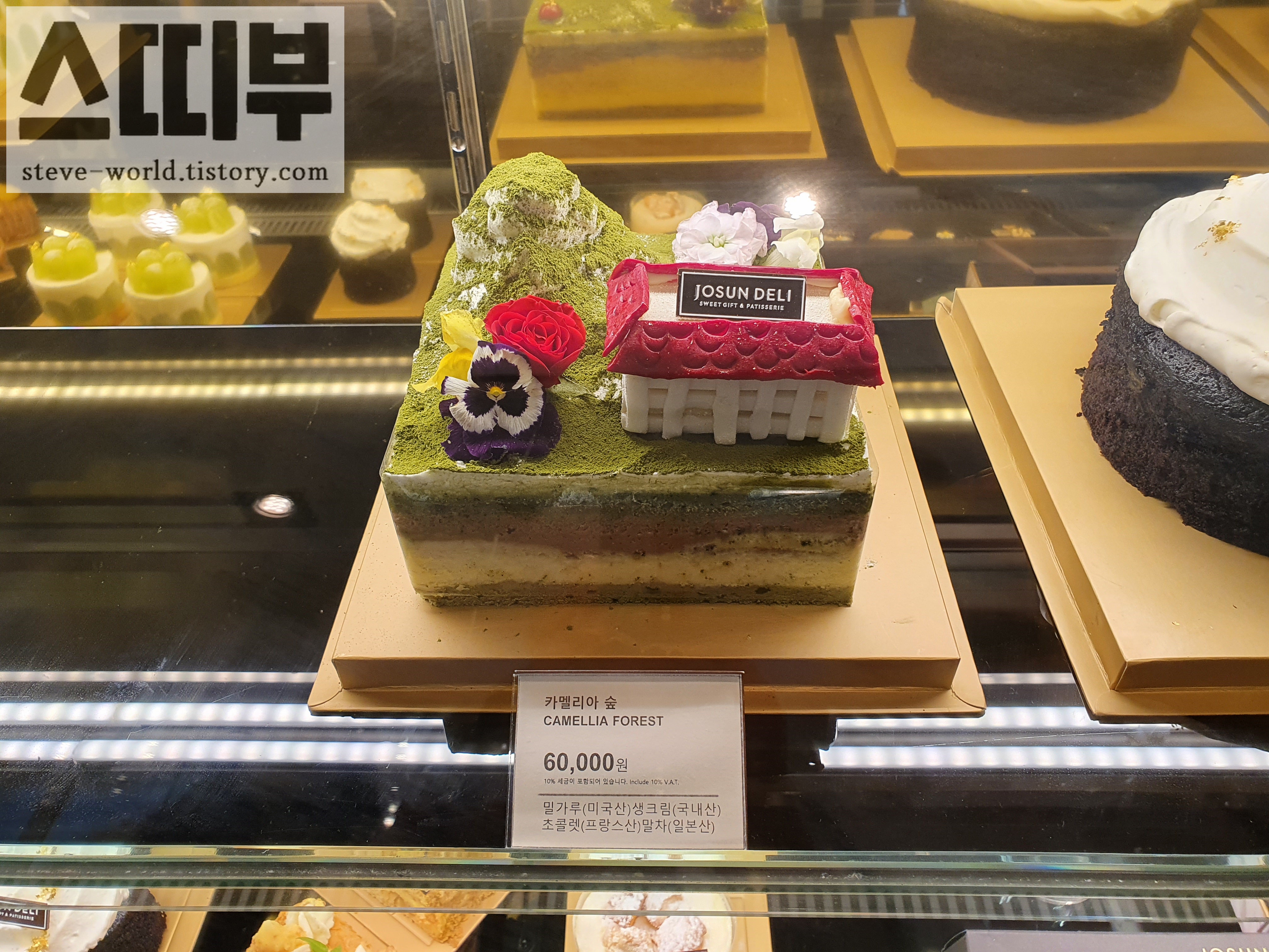 대표 케이크 보다 눈길을 사로잡은 케이크 '카멜리아 숲'입니다. 해운대 웨스틴 조선 호텔의 모습을 본 따 만든 말차 초콜릿 케이크입니다. 붉은 기와지붕의 조선호텔과 그 주변의 동백섬을 귀엽게 잘 표현한 케이크입니다. 아기자기한 모습이 눈길을 끌었습니다.