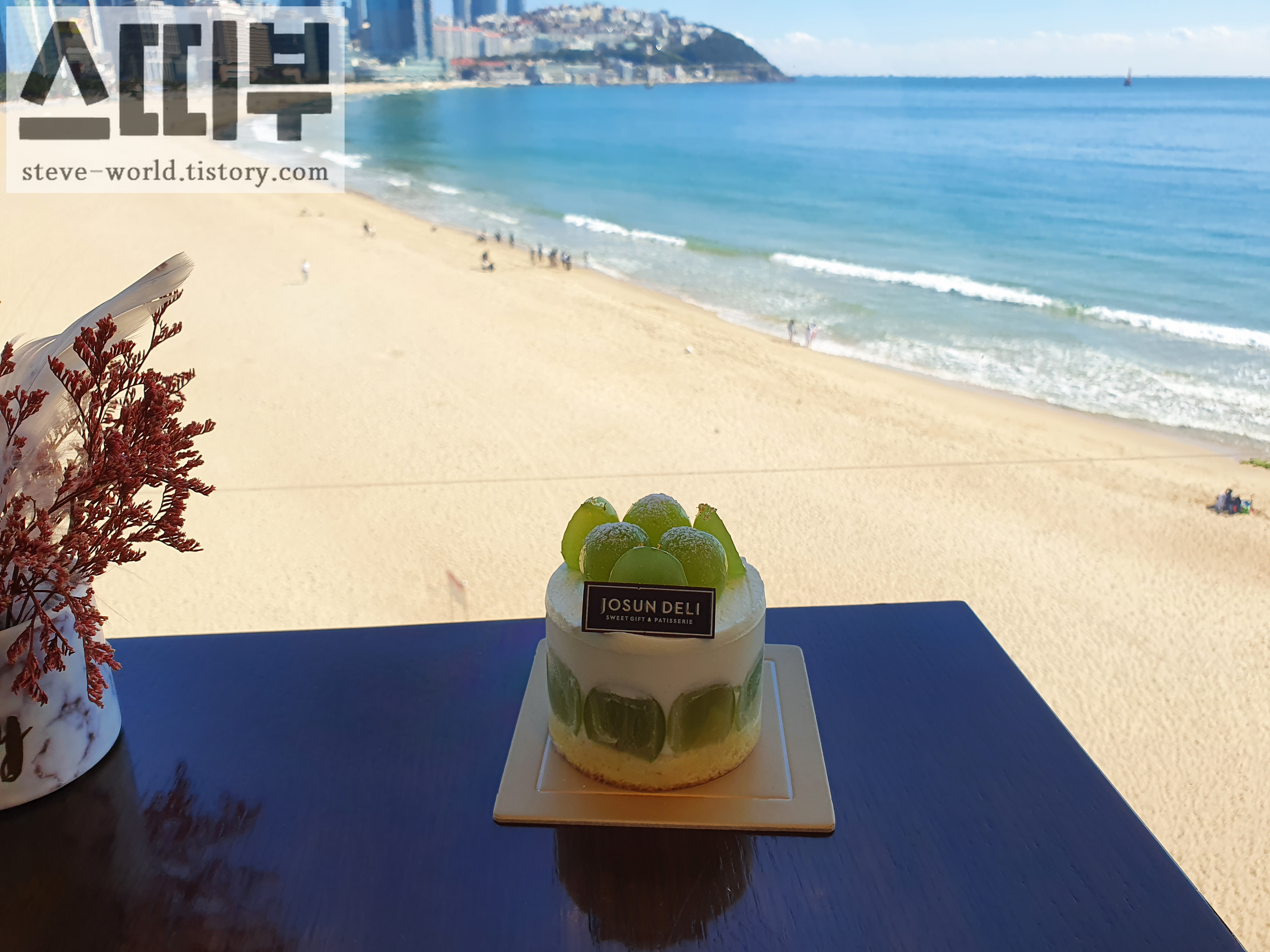 한낮의 화창한 바다를 배경으로 자리한 샤인 머스켓 케이크입니다.