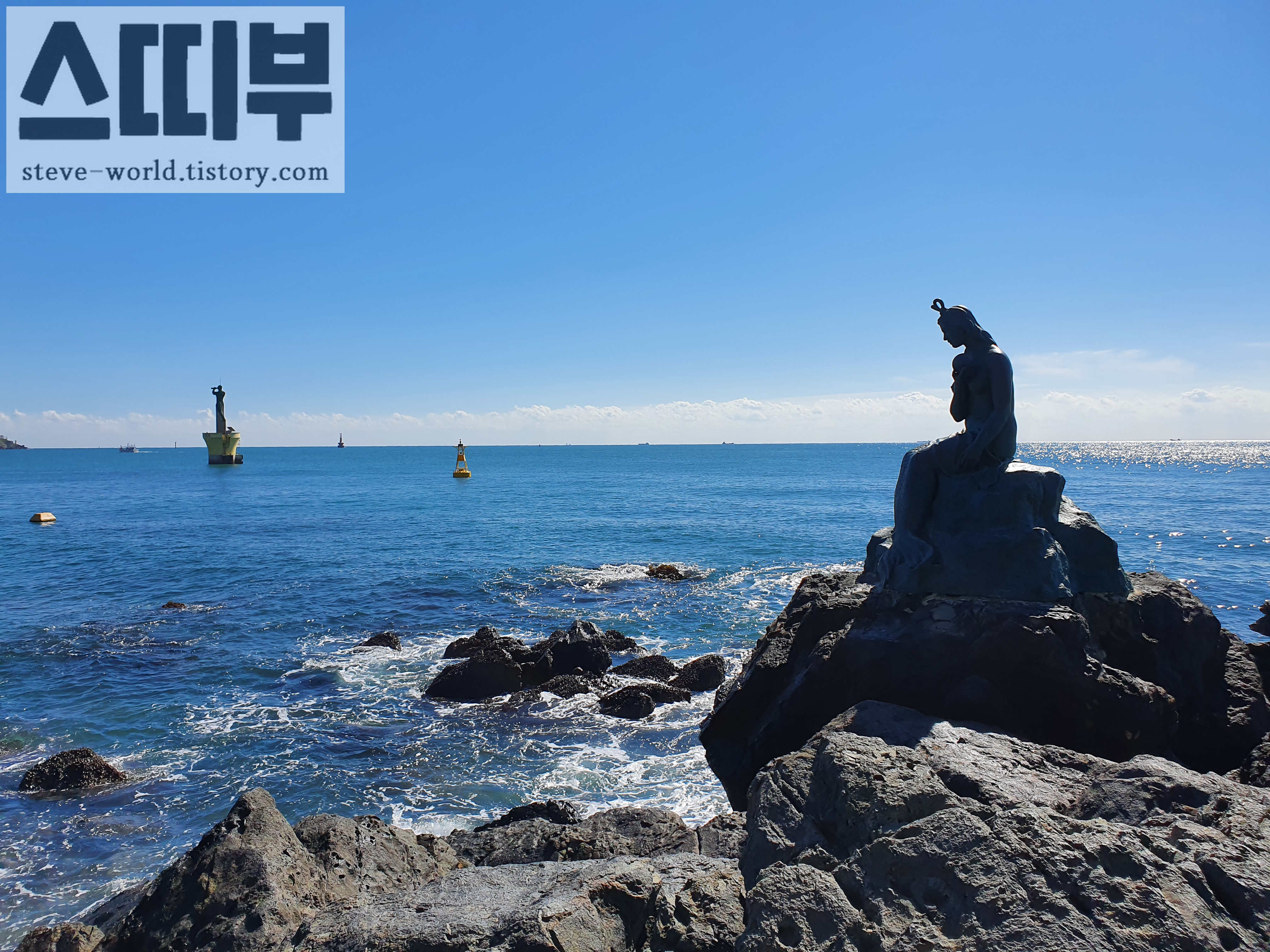부산 관광지 황옥공주 인어상입니다. 인어나라 미란다국에서 무궁나라 은혜 왕에게 시집 온 황옥공주가 보름달이 뜨는 밤에 황옥에 고국을 비추어보며 그리움을 달랬다는 전설에 따라 만들어진 황옥공주 인어상입니다. 광활한 바다와 애틋하게 보이는 황옥공주 동상이 너무도 잘 어울립니다.