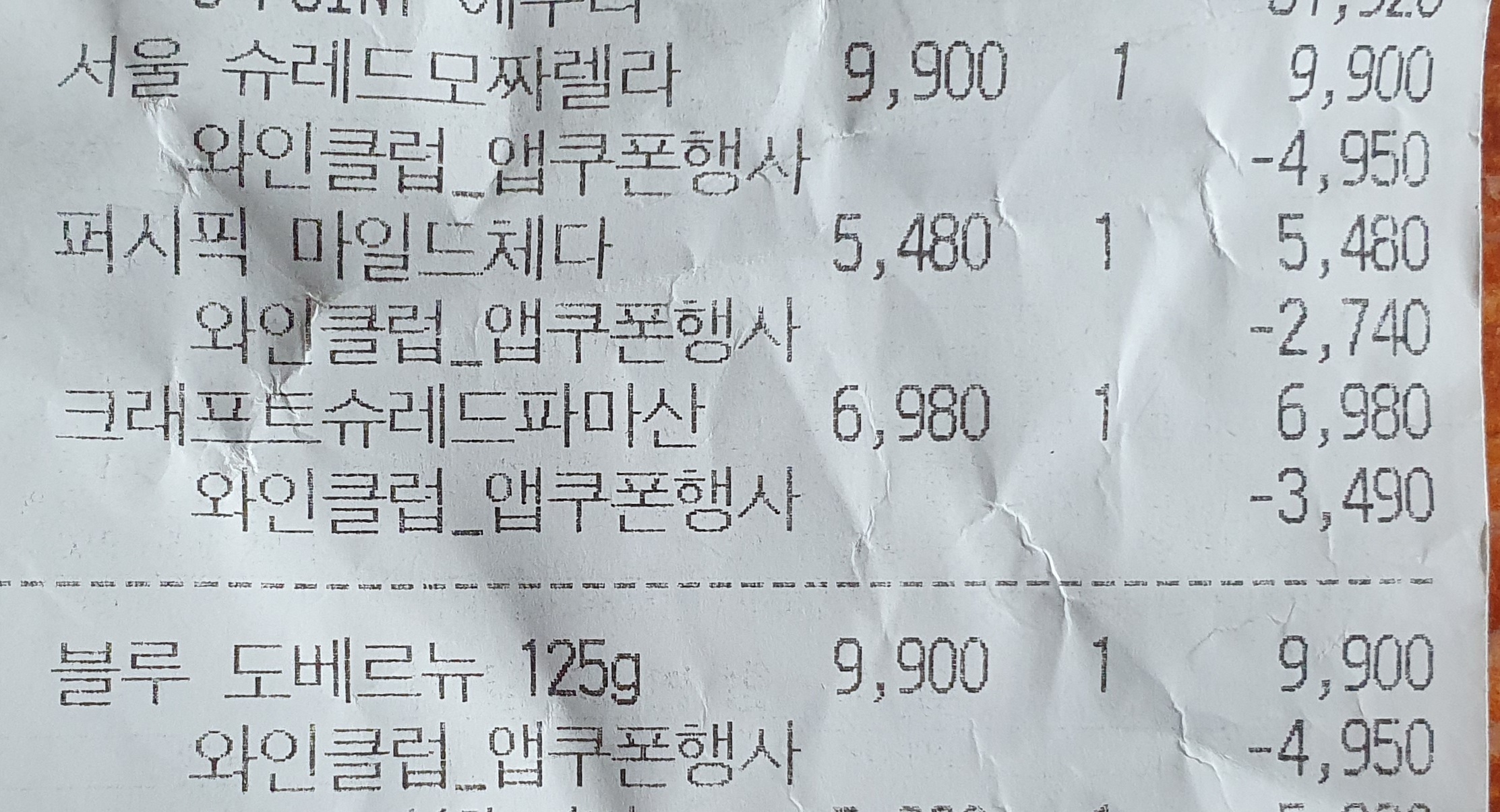 아래 사진은 제가 오늘 쇼핑한 영수증의 일부분인데, 와인클럽 쿠폰을 사용해서 '와인클럽_앱쿠폰행사' 항목으로 50% 할인이 적용되어 있습니다.