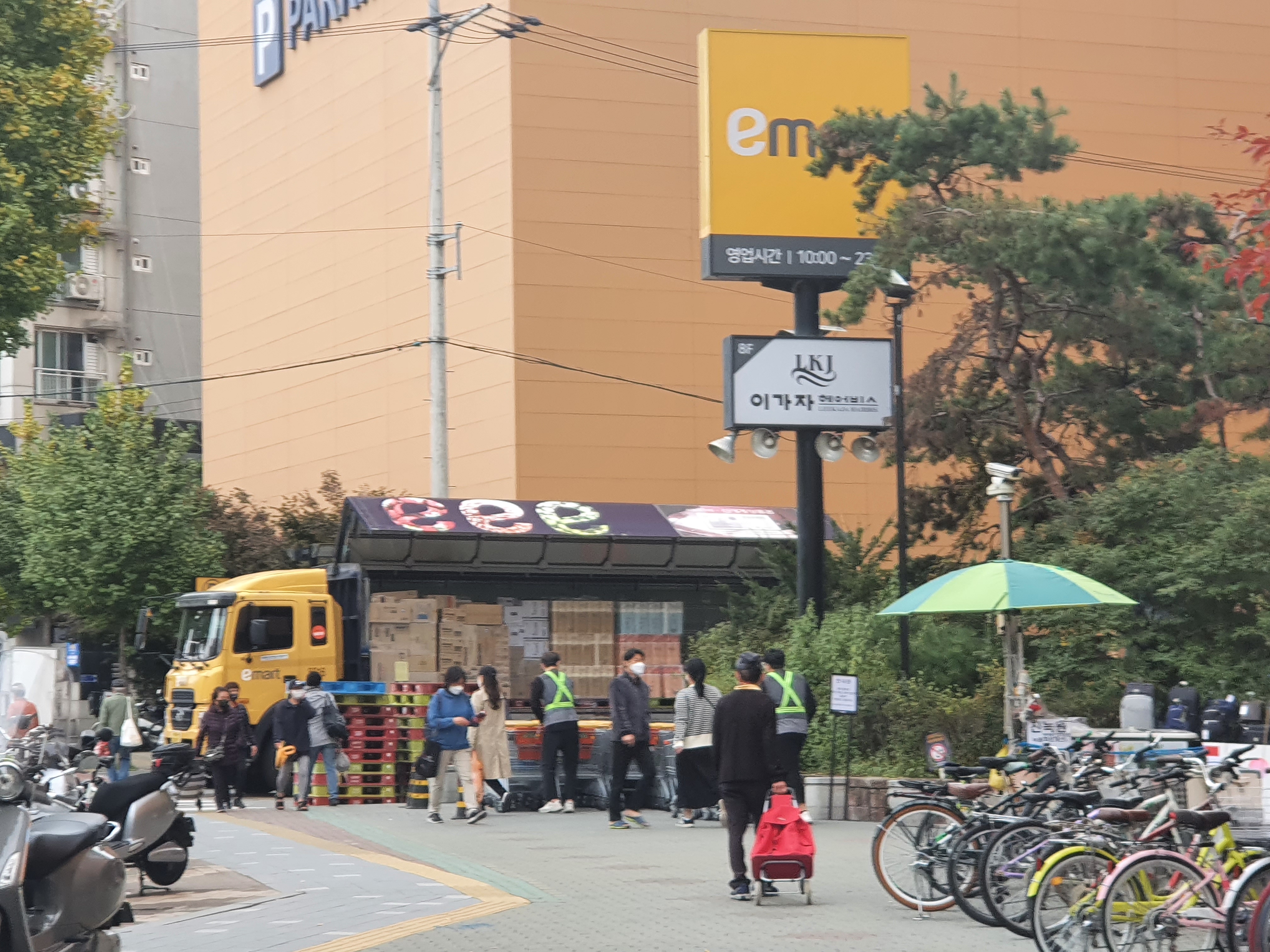저희 동네 이마트는 영업시간이 10:00부터 22:00입니다. 오전 10시 20분쯤 이마트에 도착했는데, 이마트 입구에 큰 화물차가 있었습니다.