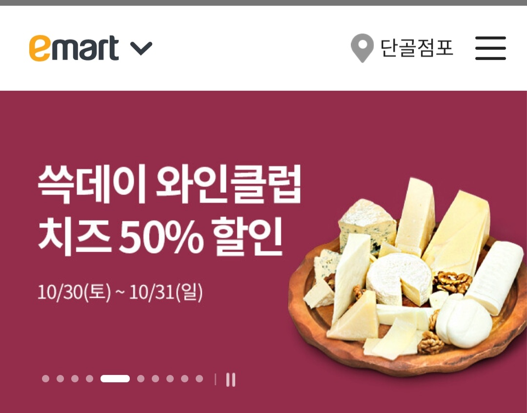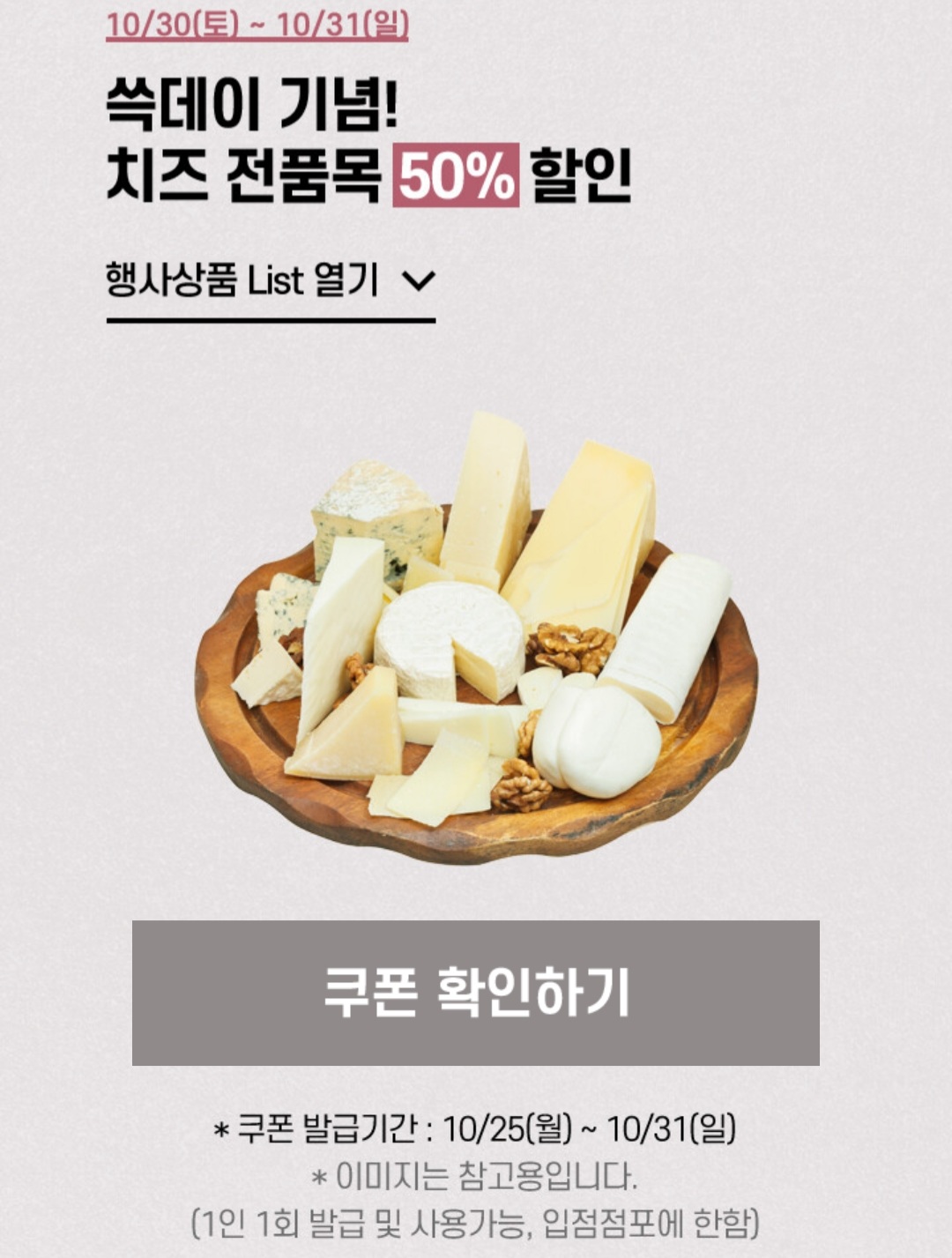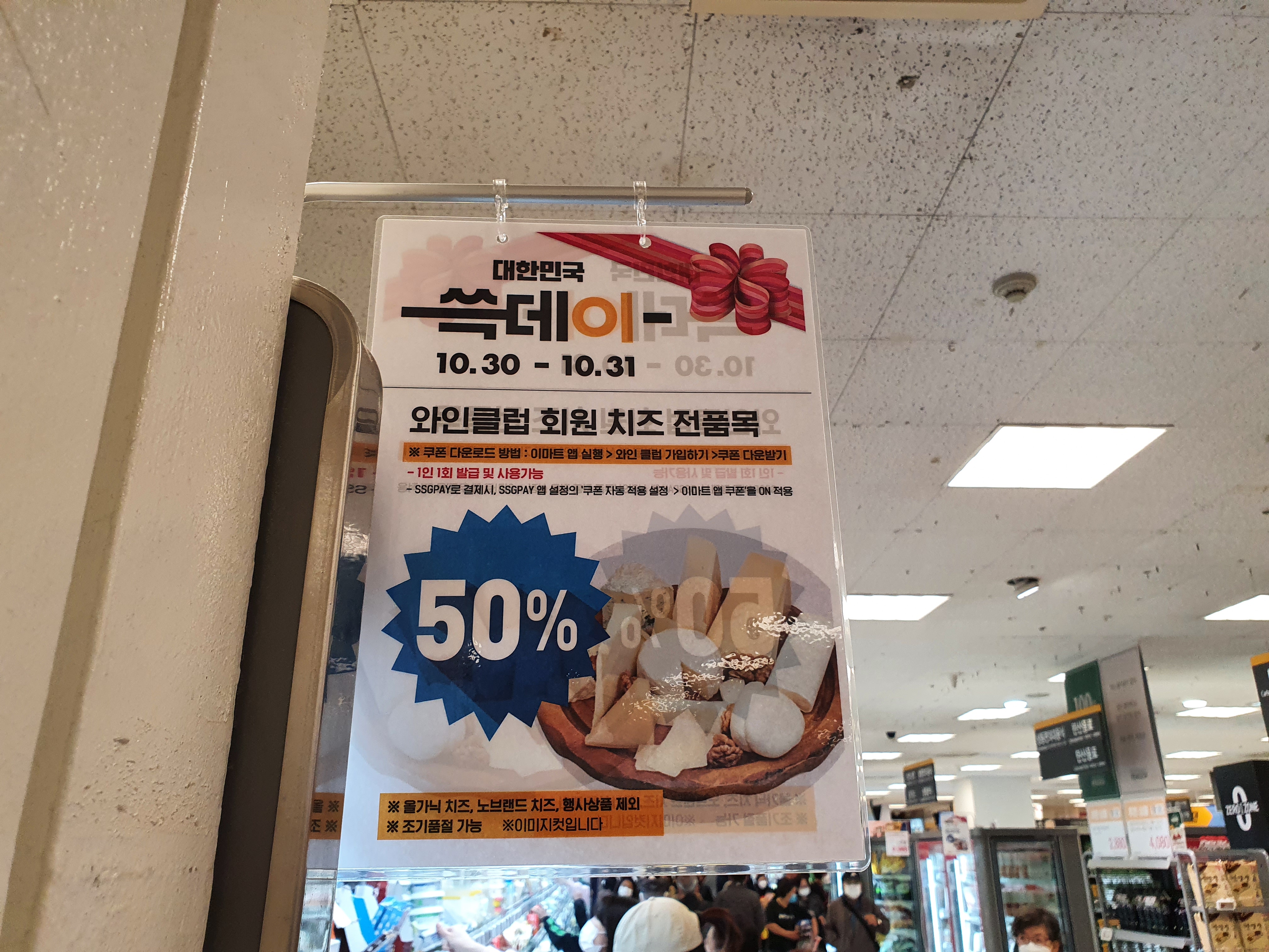 1. 치즈, 버터 일부 품목 50% 할인은 이마트 앱 와인클럽 쿠폰을 받아서 결제할 때 보여줘야지 할인 적용이 됩니다.