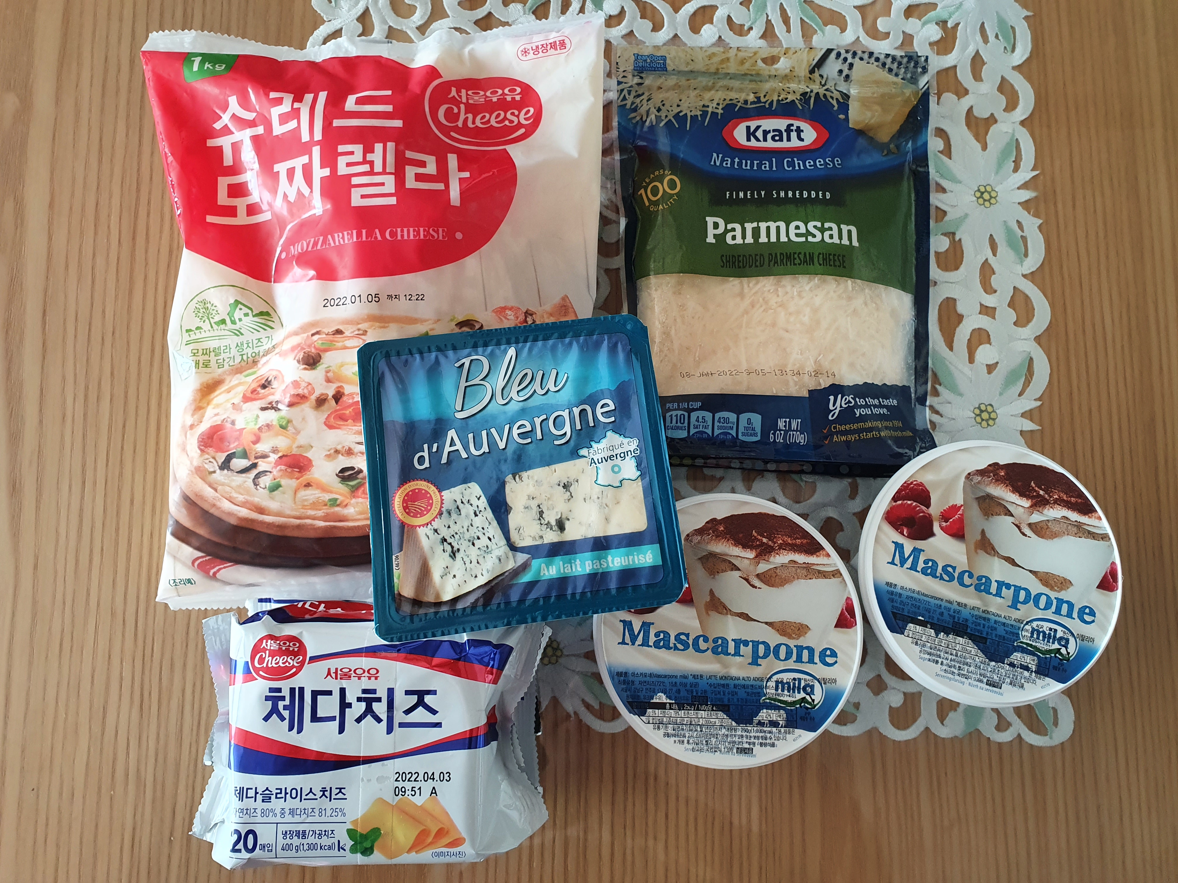 와인클럽 할인받아서 구매한 치즈들입니다. 자주 먹는 체다치즈, 모짜렐라치즈, 파마산 치즈와 티라미수 만들기 위한 마스카포네 치즈, 뇨끼 만들기 위한 블루치즈입니다.