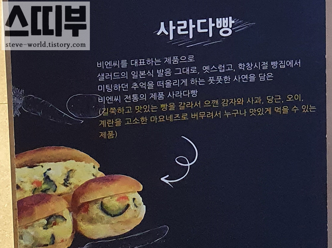 비엔씨 하면 가장 먼저 떠올릴 사라다 빵도 있습니다. 고소한 마요네즈와 잘 어울리는 감자, 아삭아삭 당근과 오이, 달콤한 사과, 영양만점 계란까지 빵 속에 가득 담긴 비엔씨의 대표 메뉴입니다.