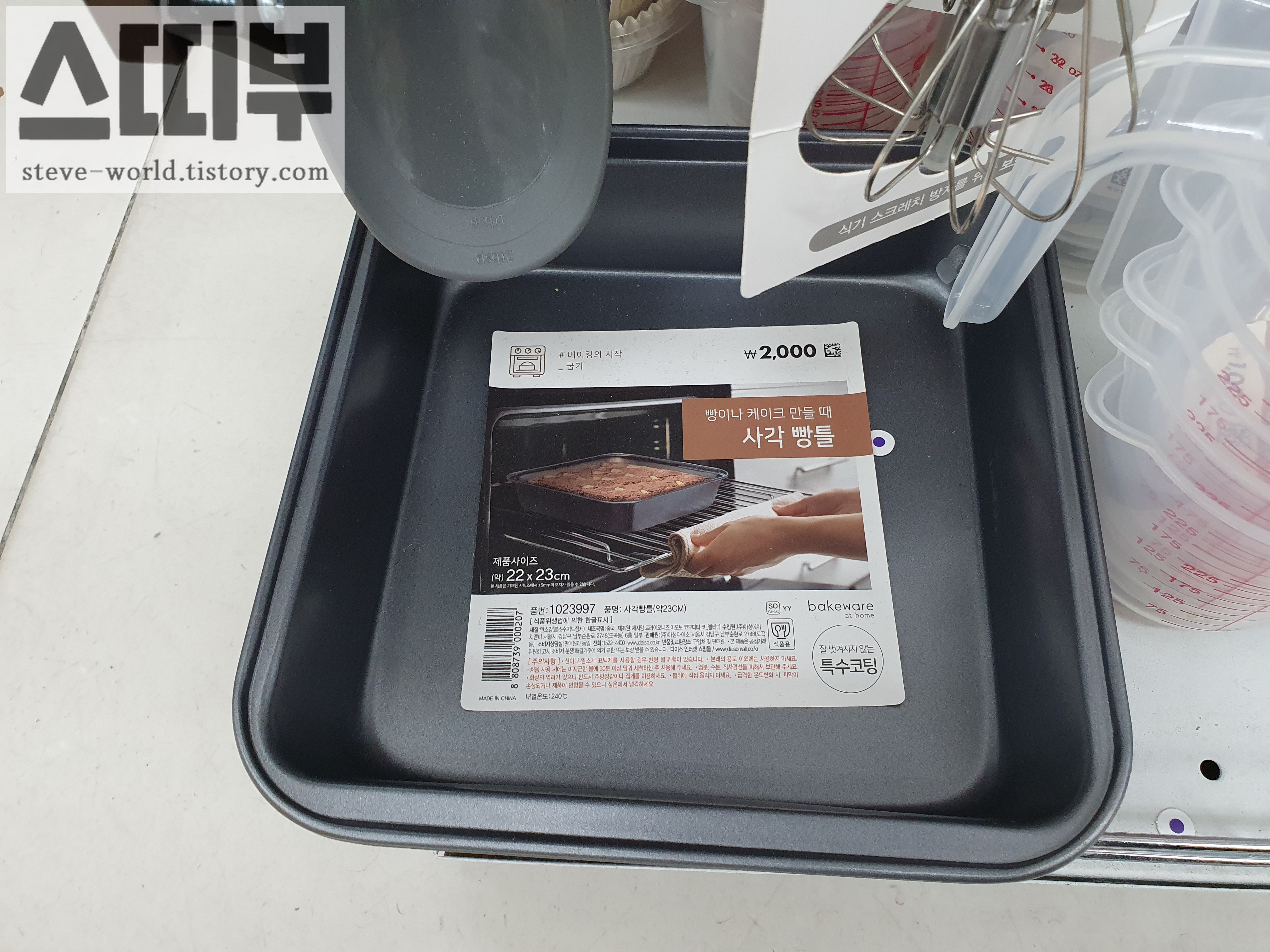위에서 본 직사각형 빵틀보다 면적이 더 큰 사각 빵틀도 있습니다. 큼직한 반죽을 구울 때 유용할 것 같습니다. 브라우니나, 블론디, 사각 케이크 등을 구울 수 있습니다. 사진과 같이 큰 사각 빵틀의 크기는 22 * 23cm이며, 가격은 2,000원입니다.