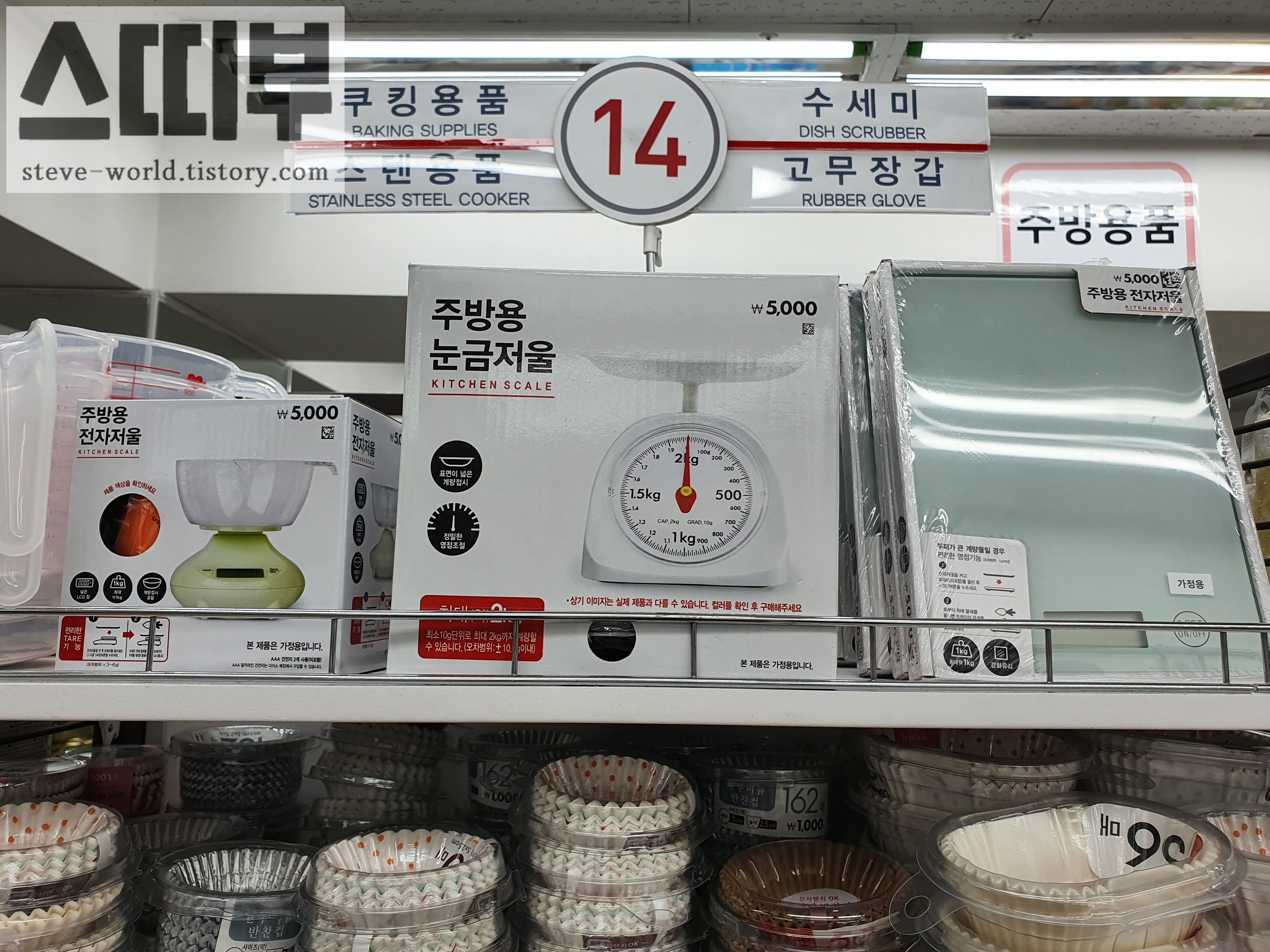 다이소 주방용 전자저울 및 눈금 저울은 5,000원에 판매되고 있습니다.
