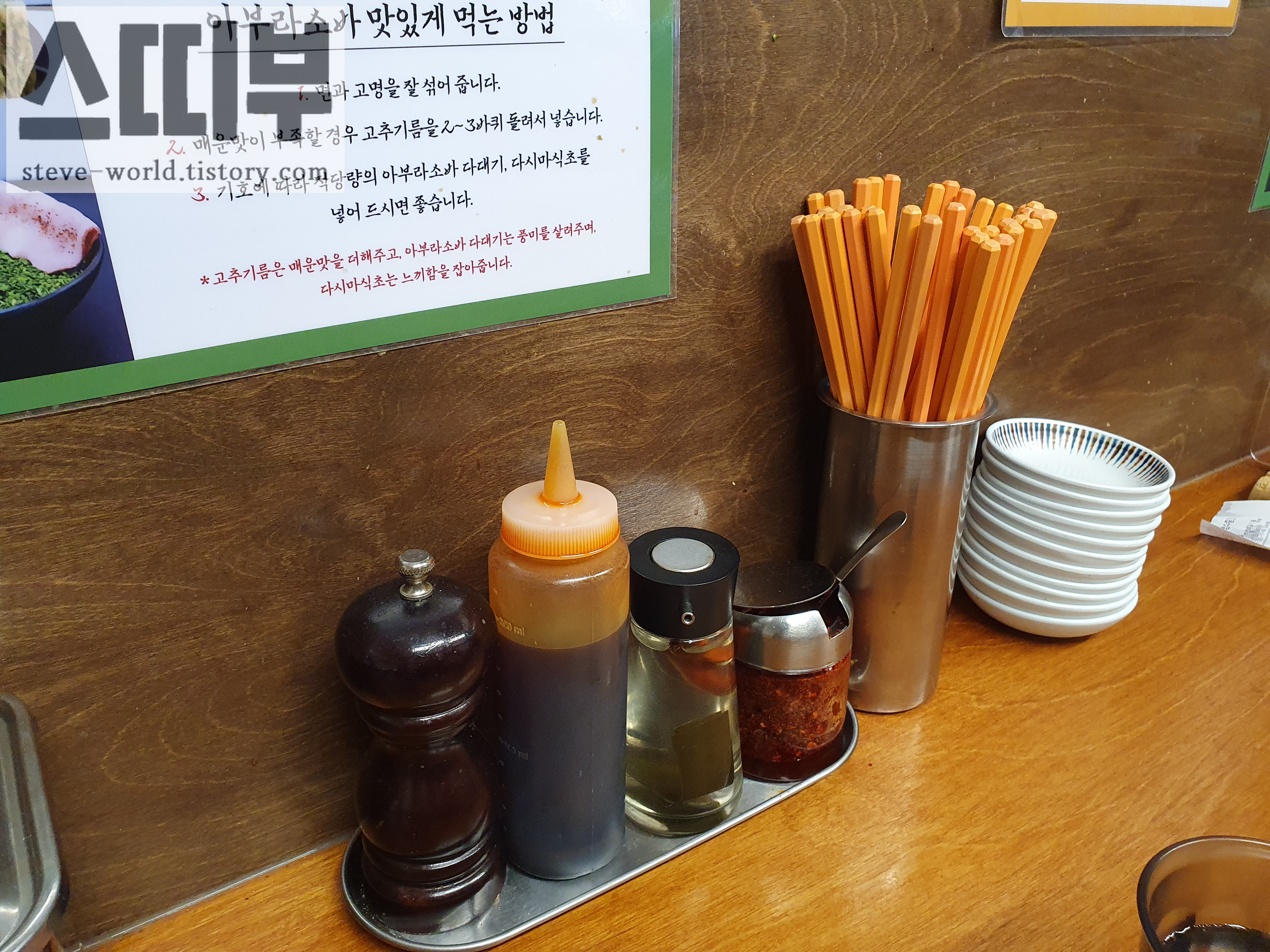후추, 고추기름, 다시마 식초, 다대기가 순서대로 준비되어 있습니다. 젓가락 옆의 종지에는 단무지, 다시다, 생강 절임을 덜어 먹을 수 있습니다.