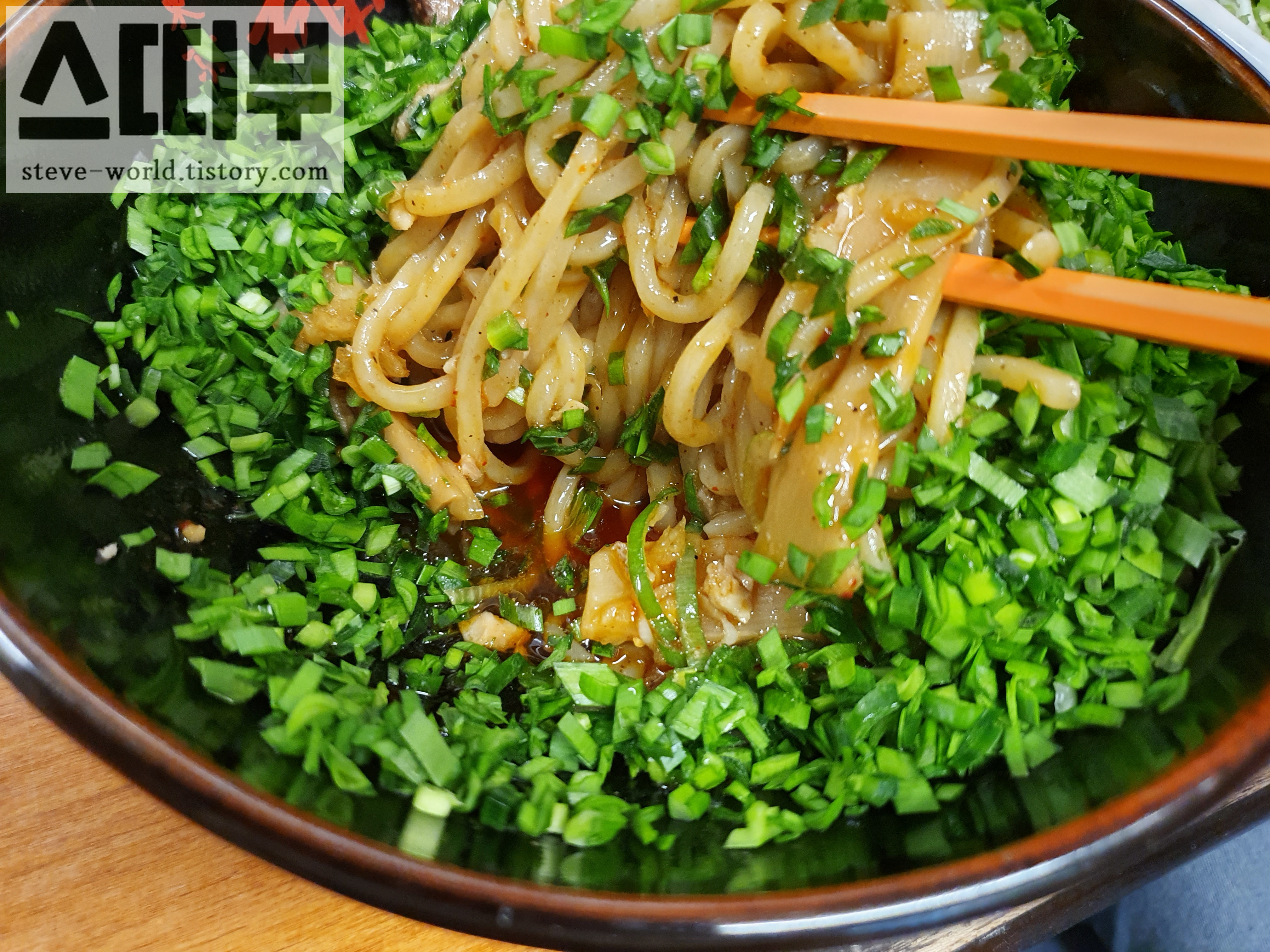 아부라 소바의 두터운 부추 속에는 고추기름이 들어간 소스와 면이 함께 버무려져 들어가 있었습니다.