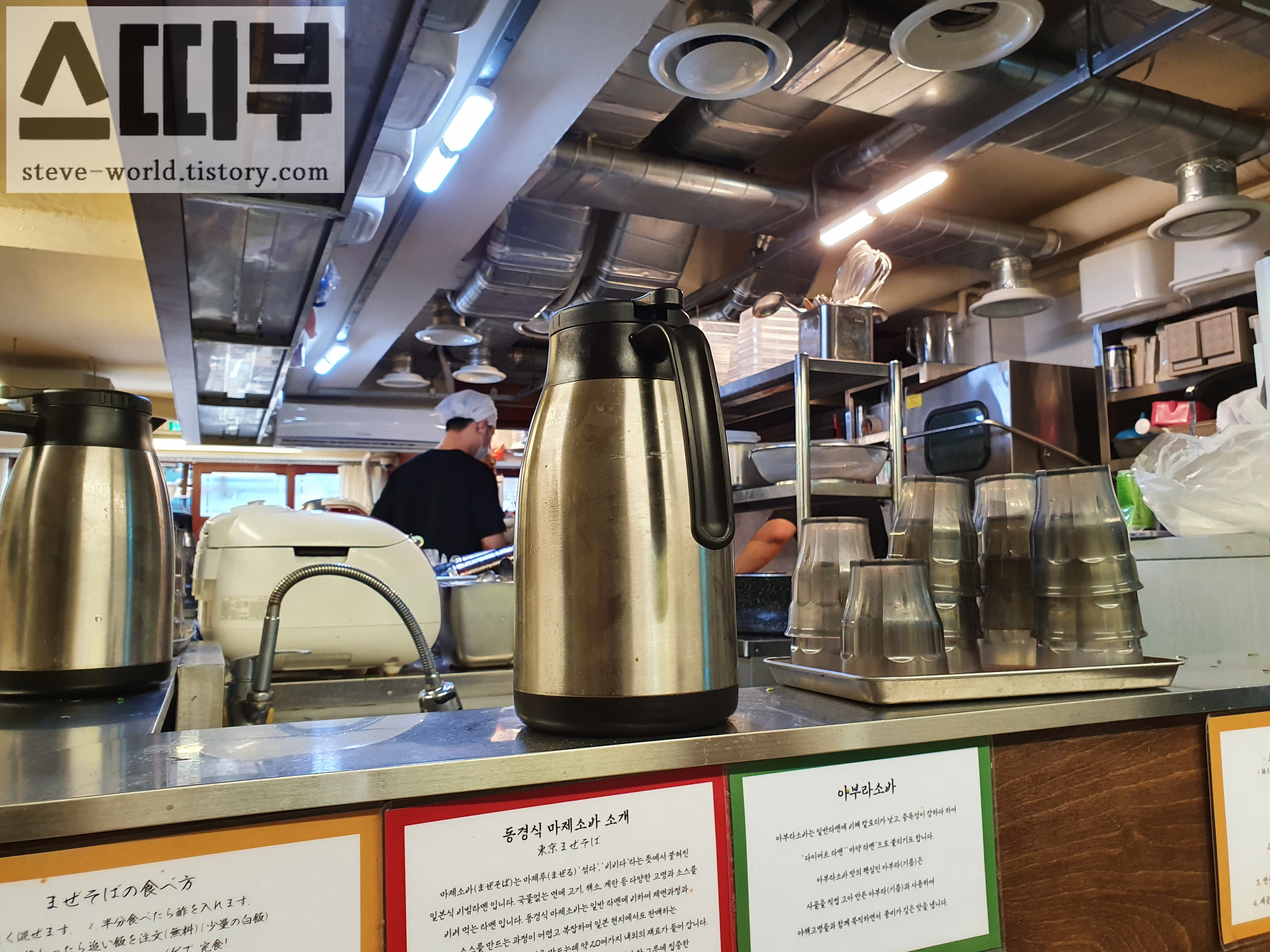 오픈 키친이고, 일본 느낌이 납니다. 잠깐 일본 여행 온 느낌이어서 좋았습니다. 컵에 보온병의 물을 따라 마시며 소바를 기다립니다.