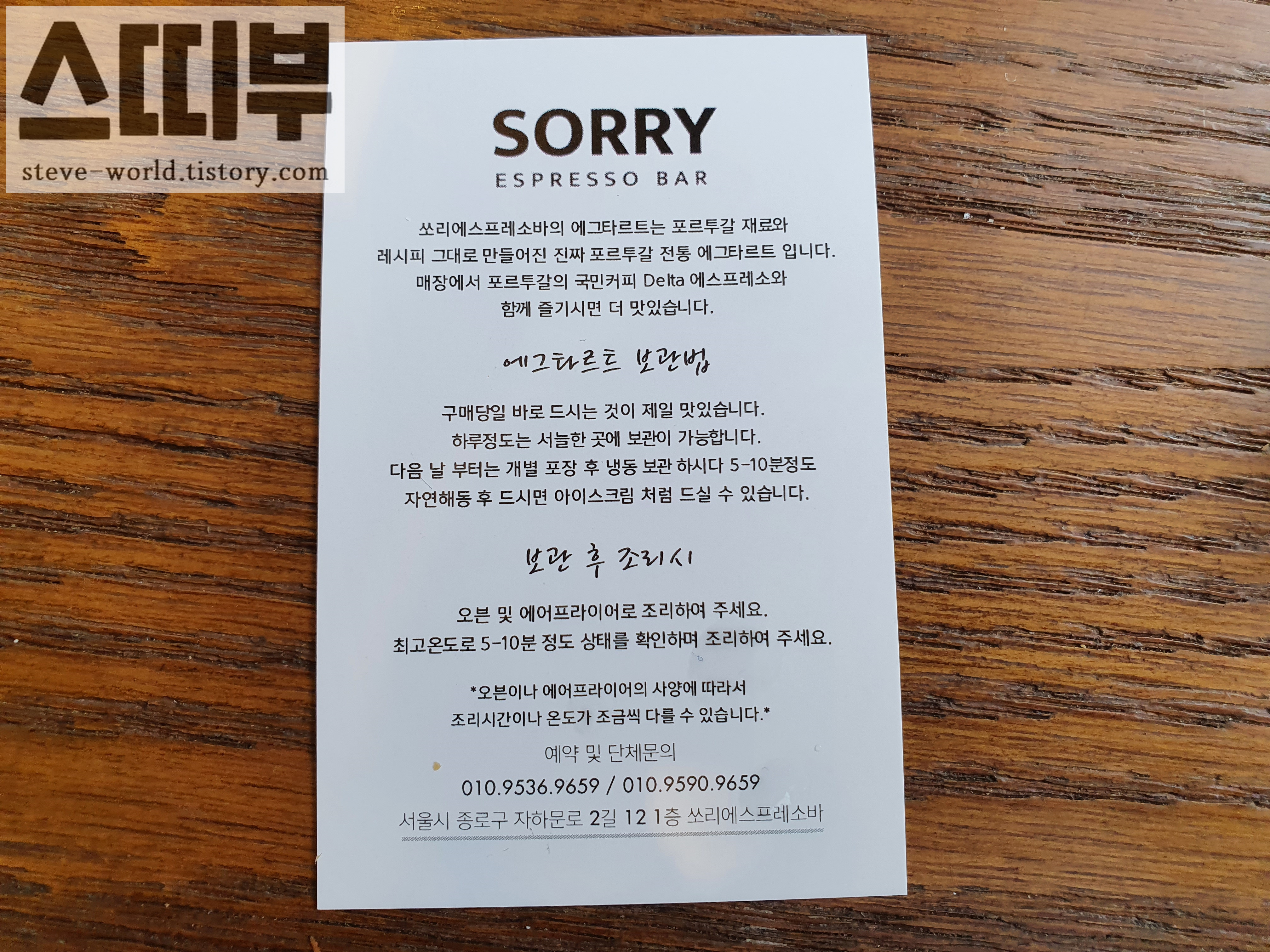 봄이나 여름, 날이 따뜻할 때는 쏘리 에스프레소바에서 에스프레소와 에그타르트를 주문해 스탠딩 바에서 먹어보고 싶습니다. 곧 겨울이라 날이 많이 추워지는데, 에그타르트를 테이크 아웃해서 근처 스타벅스에서 따뜻한 커피를 주문해 먹는 것도 좋은 방법일 것 같습니다.