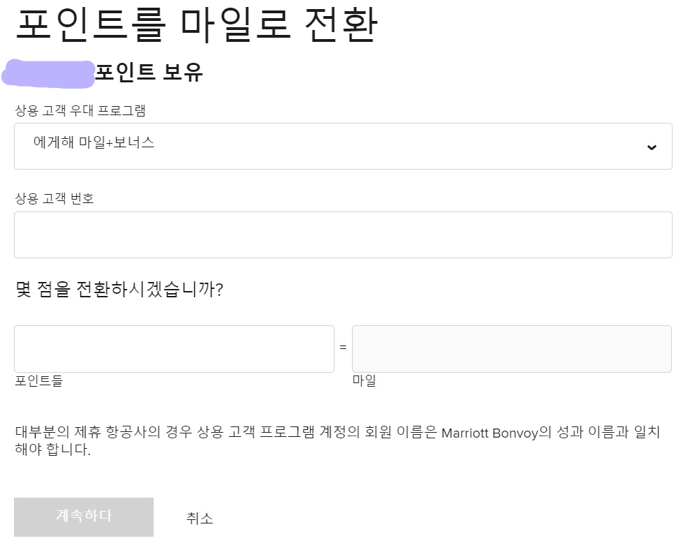 ④ 전환할 항공사와 항공사 고객번호, 전환할 포인트를 기입하고 '계속하다'를 누르면, '마일리지로 포인트' 확인 창이 뜹니다. 전환 신청한 포인트가 맞는지 확인하고 '전환하다'를 누릅니다. 여기서 작은 글씨로 안내문이 보이는데, 마일리지를 전환할 제휴 항공사의 회원 이름과 메리어트 회원 이름이 일치해야 한다고 합니다.