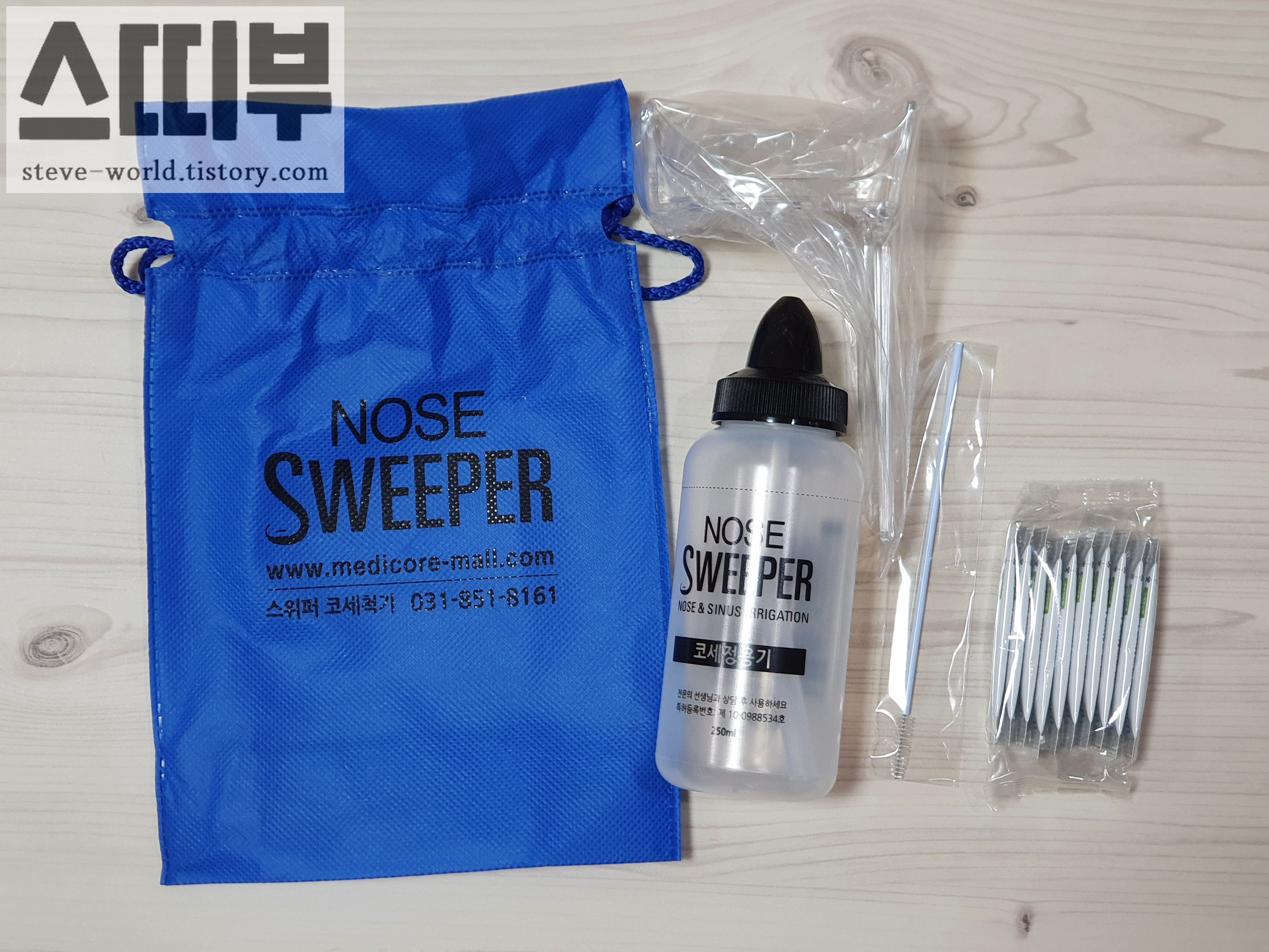 노즈 스위퍼 파우치 안에는 코 세척기와 거치대, 세척솔, 코 세척 분말 10포가 들어있습니다.
