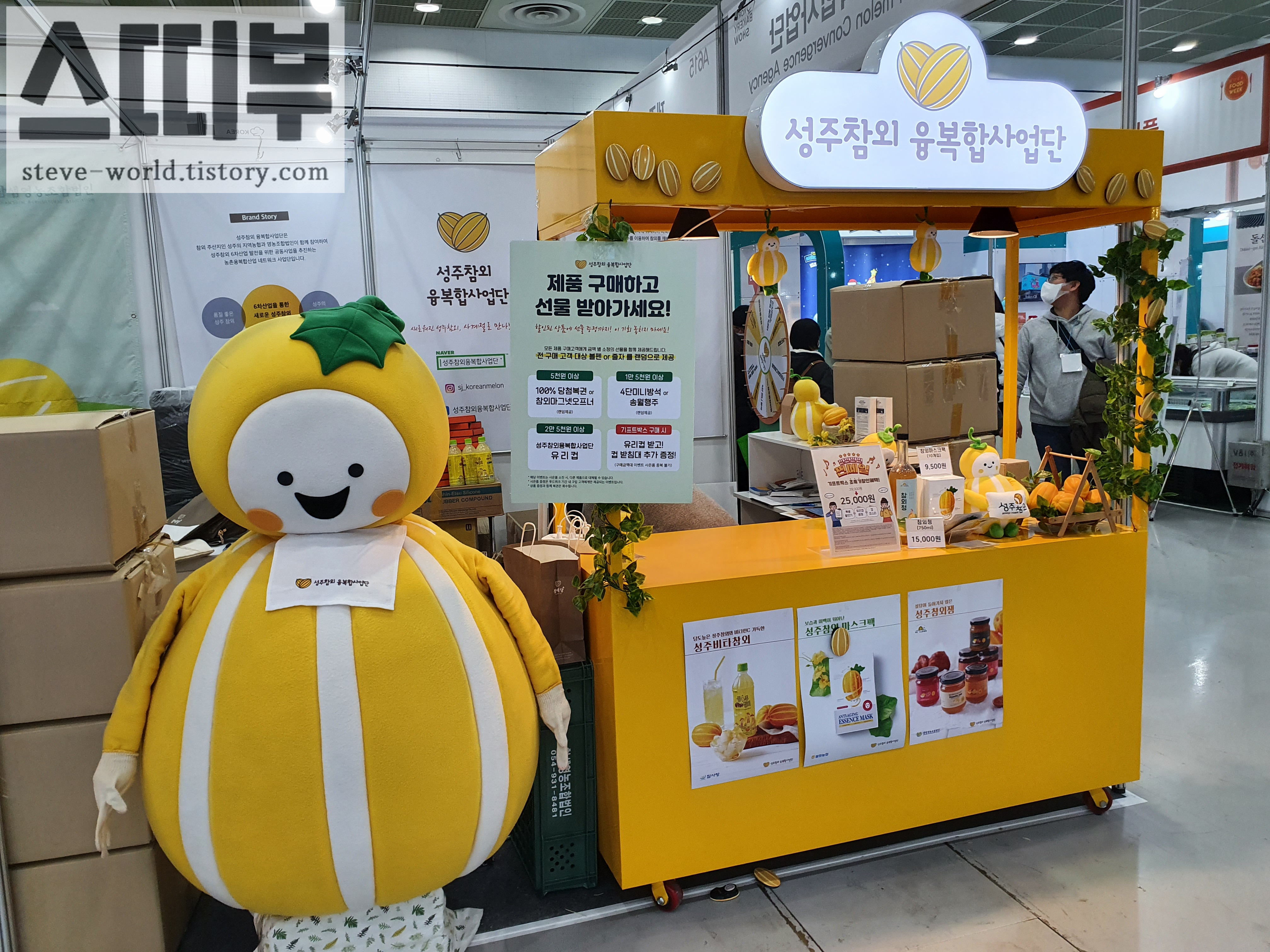 박람회를 다 구경하고 나가려는데, 제 눈길을 사로잡은 성주 참외 융복합사업단 부스입니다. 몇달 전에 인터넷으로 참외 잼이 있다는 정보를 입수하고 참외 잼을 사볼까 말까 고민한 적이 있었습니다. 용량 큰 것을 사려니 입에 안 맞을까 고민이 되고, 작은 것을 사려니 배송료까지 줘야 해서 고민하다가 구매하지 않았었는데, 여기서 참외 잼을 파는 성주참외 부스를 만나게 되어 너무 반가웠습니다.