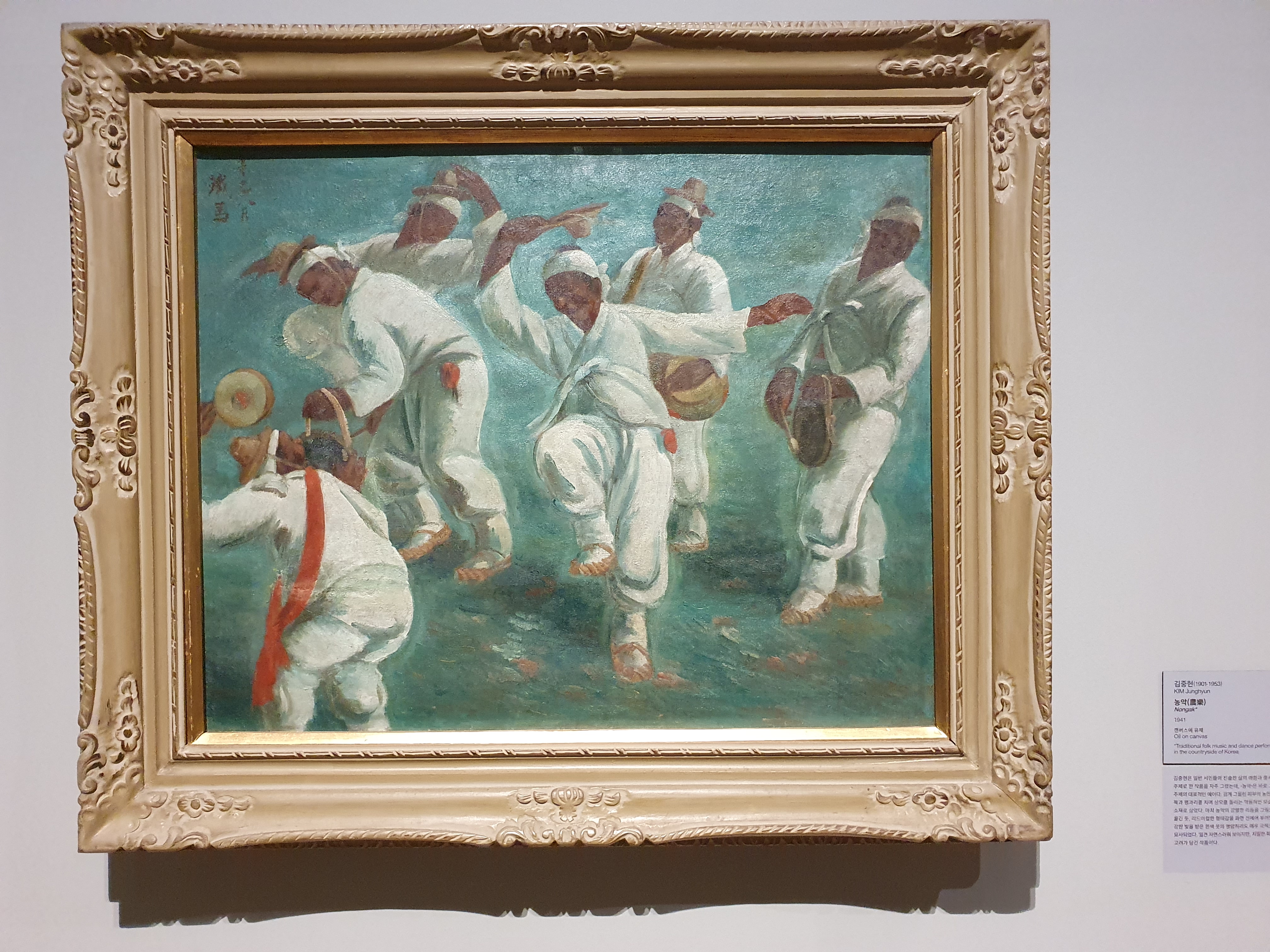 밀레 같은 화가가 되고 싶었던 박수근은 농가의 풍경과 일하는 여인의 모습이 담긴 작품을 많이 그렸습니다. '절구질하는 여인'은 아내를 모델로 제작한 것입니다. '농악'은 단순하고 평면적인데도, 인물을 상하 2단으로 배치하고 상하 인물들의 움직임을 반대 방향으로 하여 화면에 변화를 주었습니다.