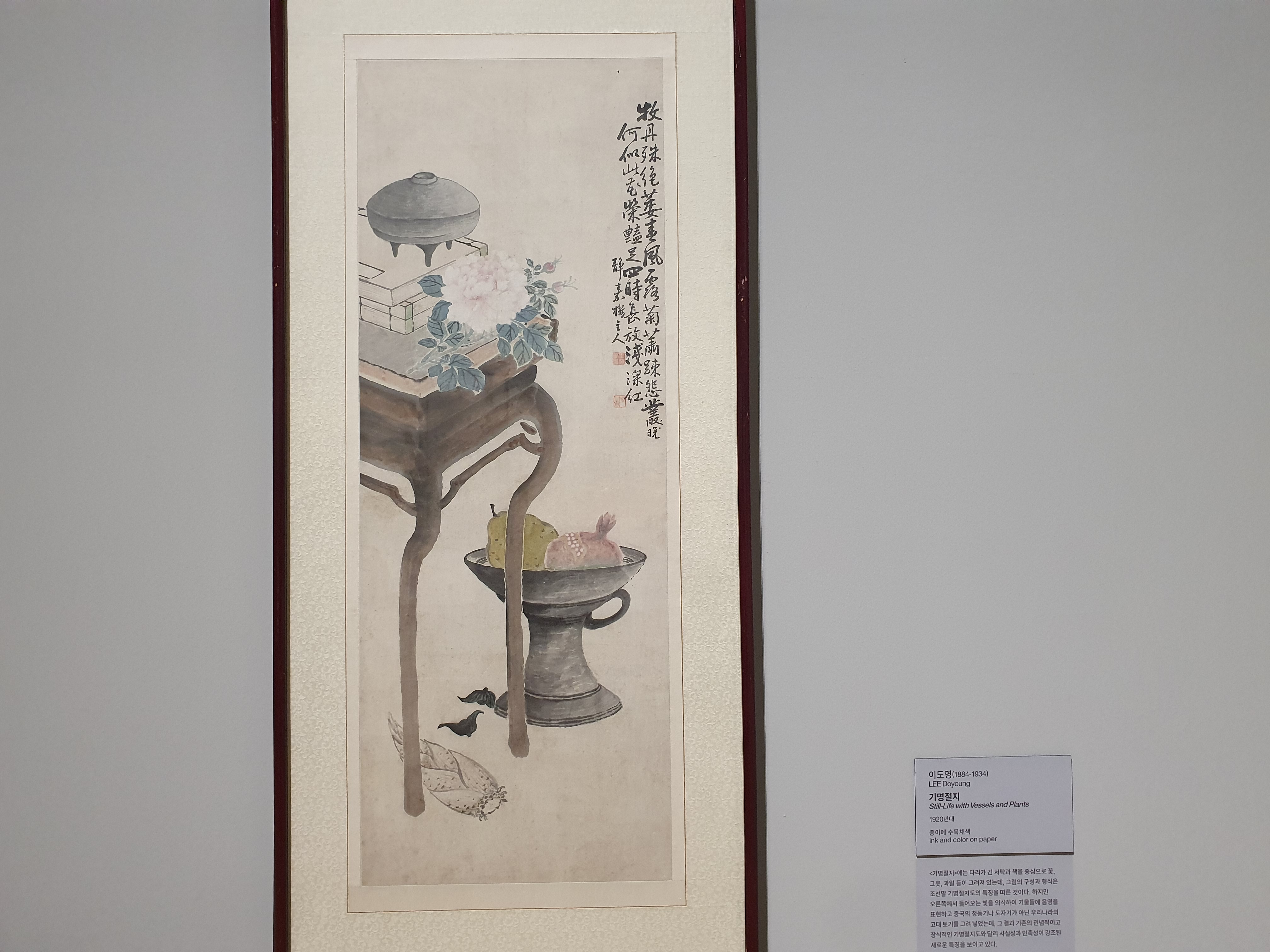 본래 기명절지화는 중국의 오래된 청동기, 도자기, 꽃, 과일을 그리는데, 관재 이도영 선생님의 기명절지에는 우리나라 고대 토기가 있습니다. 또한 서양 정물화의 영향을 받아 사물들의 음영이 있습니다. 기존의 기명절지화와는 달리 사실성과 민족성이 강조된 작품이라고 합니다.