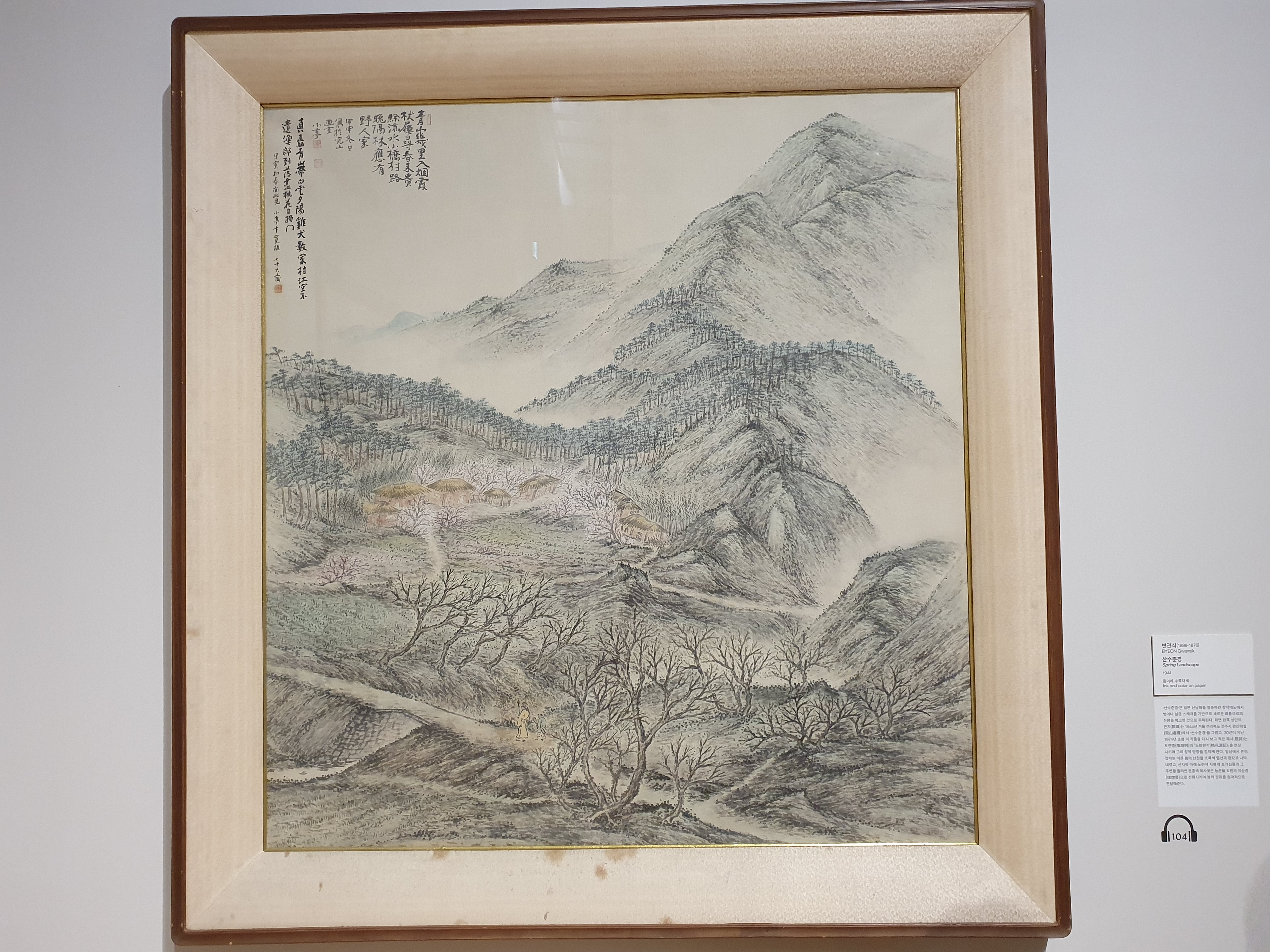 동양화에서 봤을법한 산과 서양의 건축물 등 동서양이 어우러진 독특한 그림입니다. 백남순 선생님의 유일하게 남아있는 해방 전 작품이라고 합니다. 작가의 해방 전 작품은 한국전쟁으로 인해 전부 소실되었는데, 오직 이 작품만이 친구의 결혼 선물로 보내져 살아남았다고 합니다.