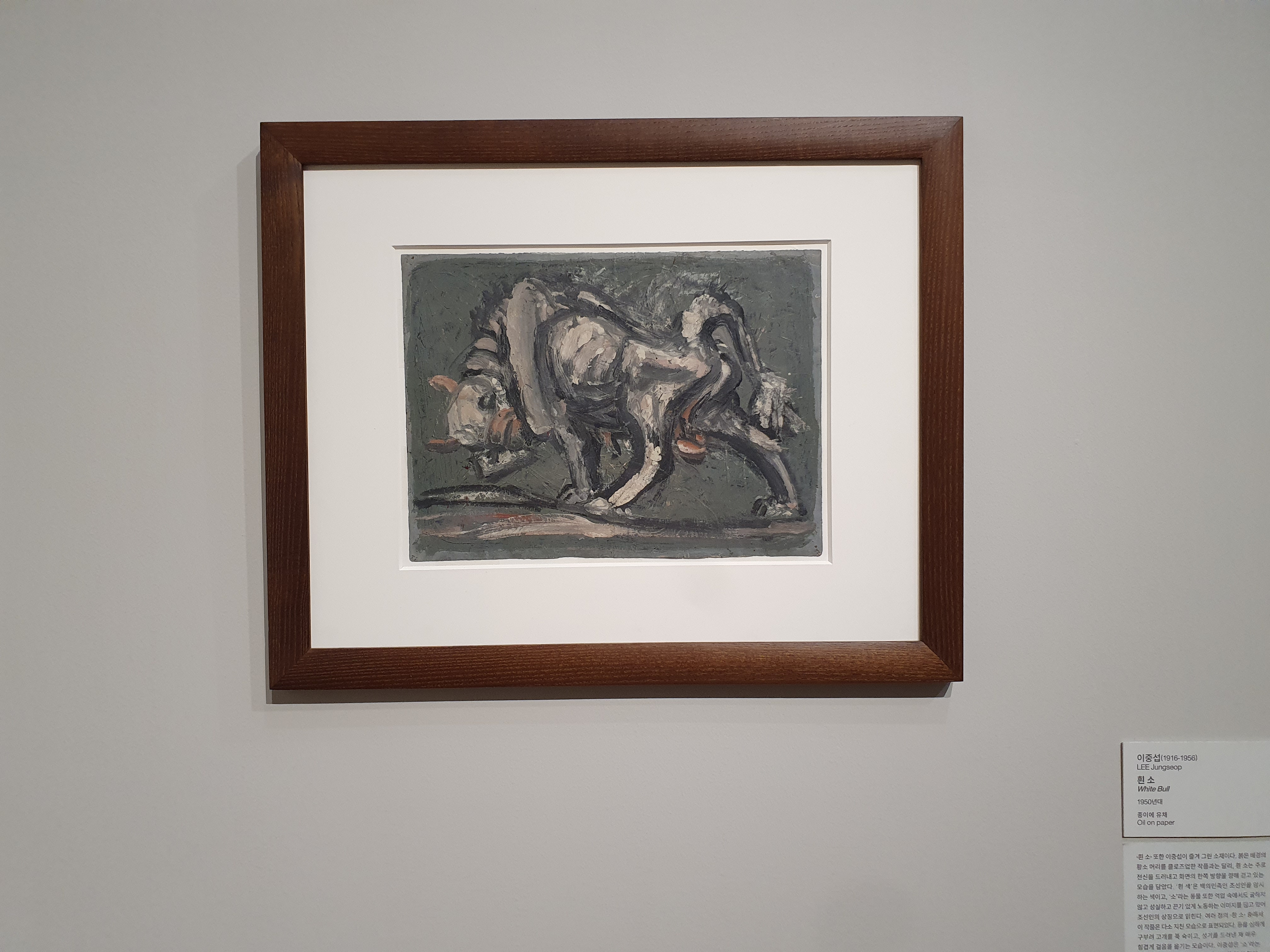 흰색은 백의민족인 조선인을, 소는 억압에 굴하지 않고 성실하고 끈기 있게 노동하는 이미지로 역시 조선인을 상징합니다. 이 작품의 흰 소는 많이 지친 모습으로 표현되었습니다. 푹 숙인 고개와 구부정한 등으로 힘겹게 걸어가는 모습입니다.