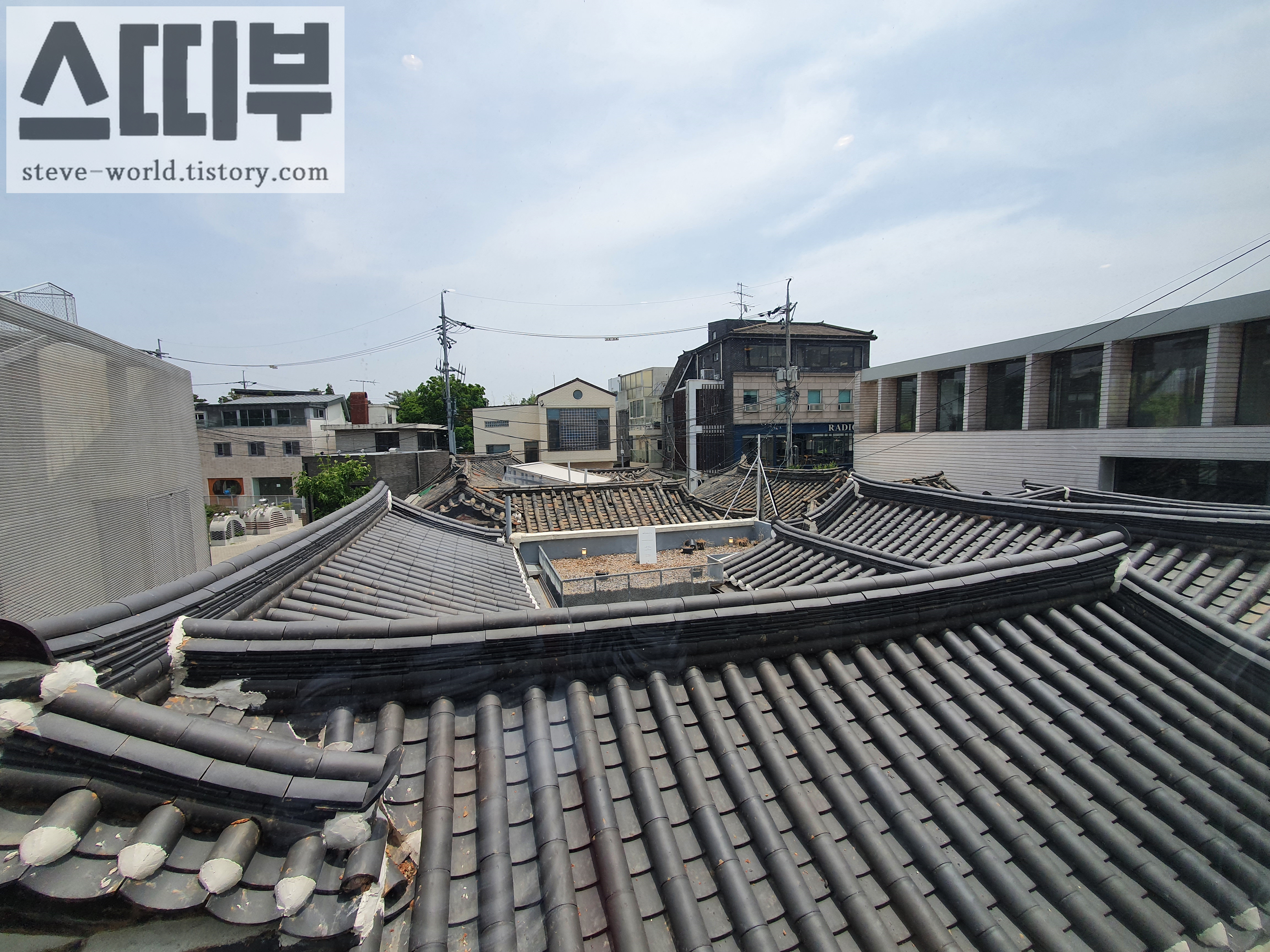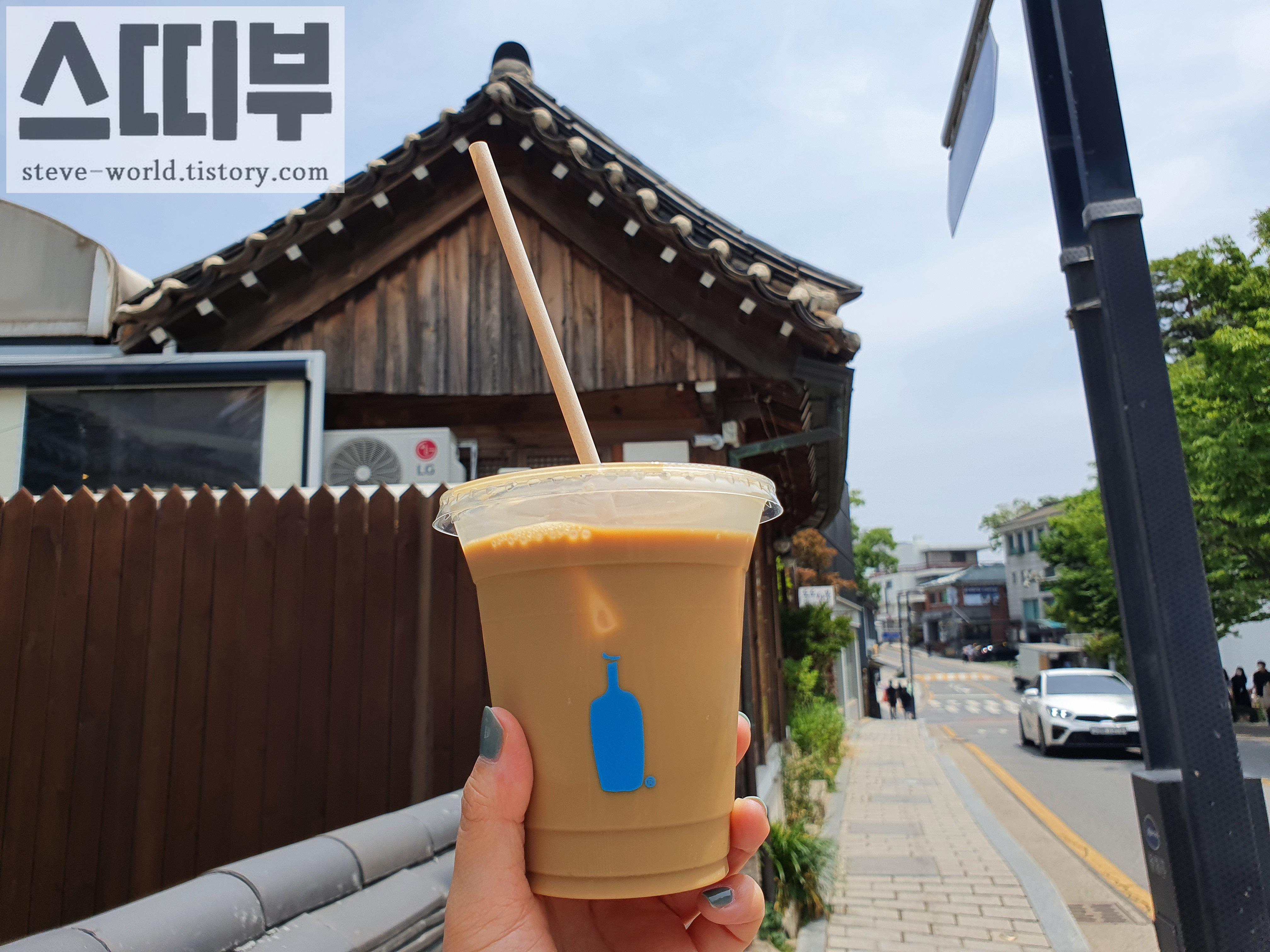 빵 쇼핑이 끝난 뒤, 황생가 칼국수 옆에 있는 블루보틀 삼청점에서 커피를 주문했습니다. 1층에서 커피를 주문하고 2층에 올라오면 예쁜 한옥 뷰를 볼 수 있습니다.