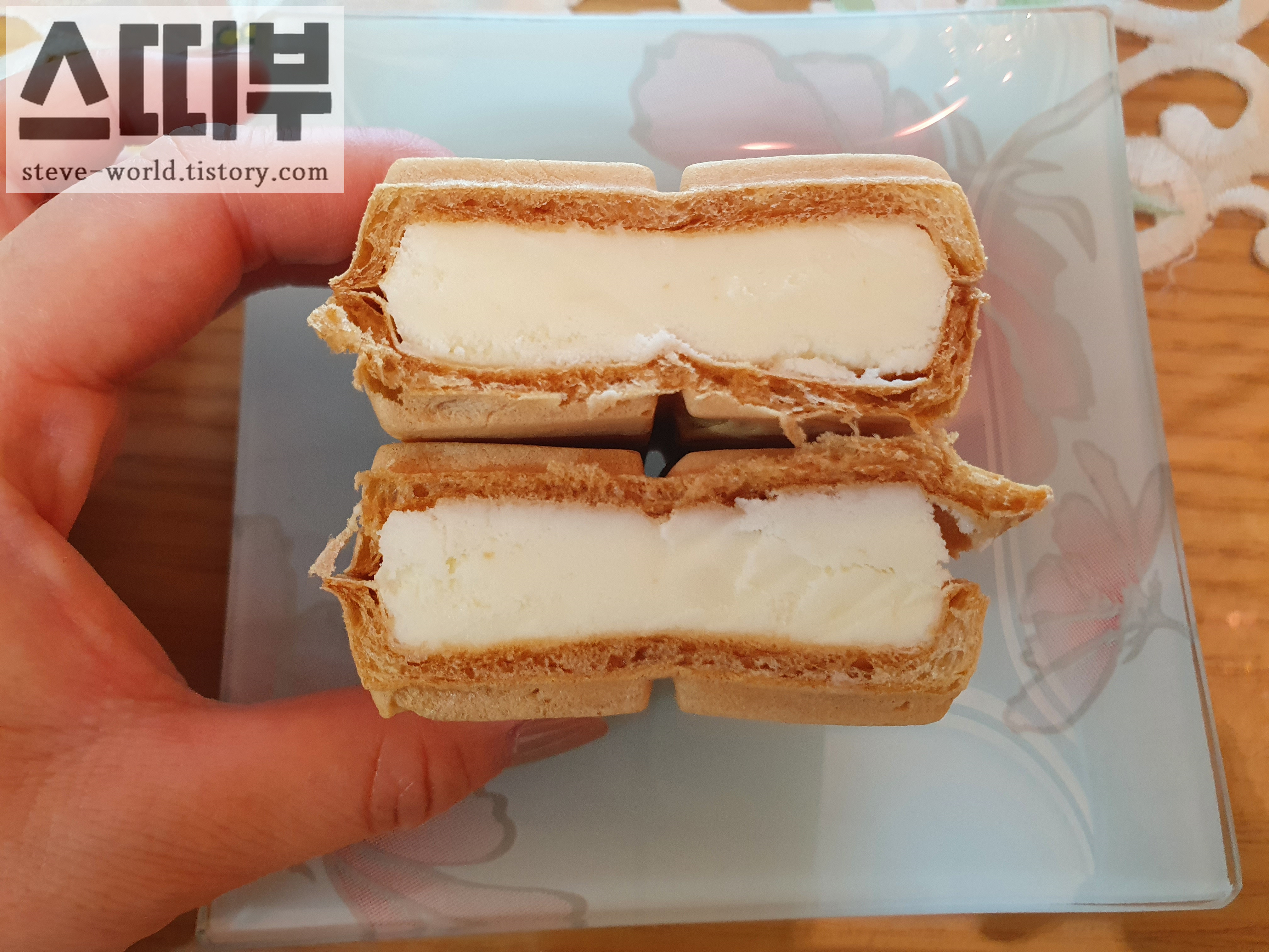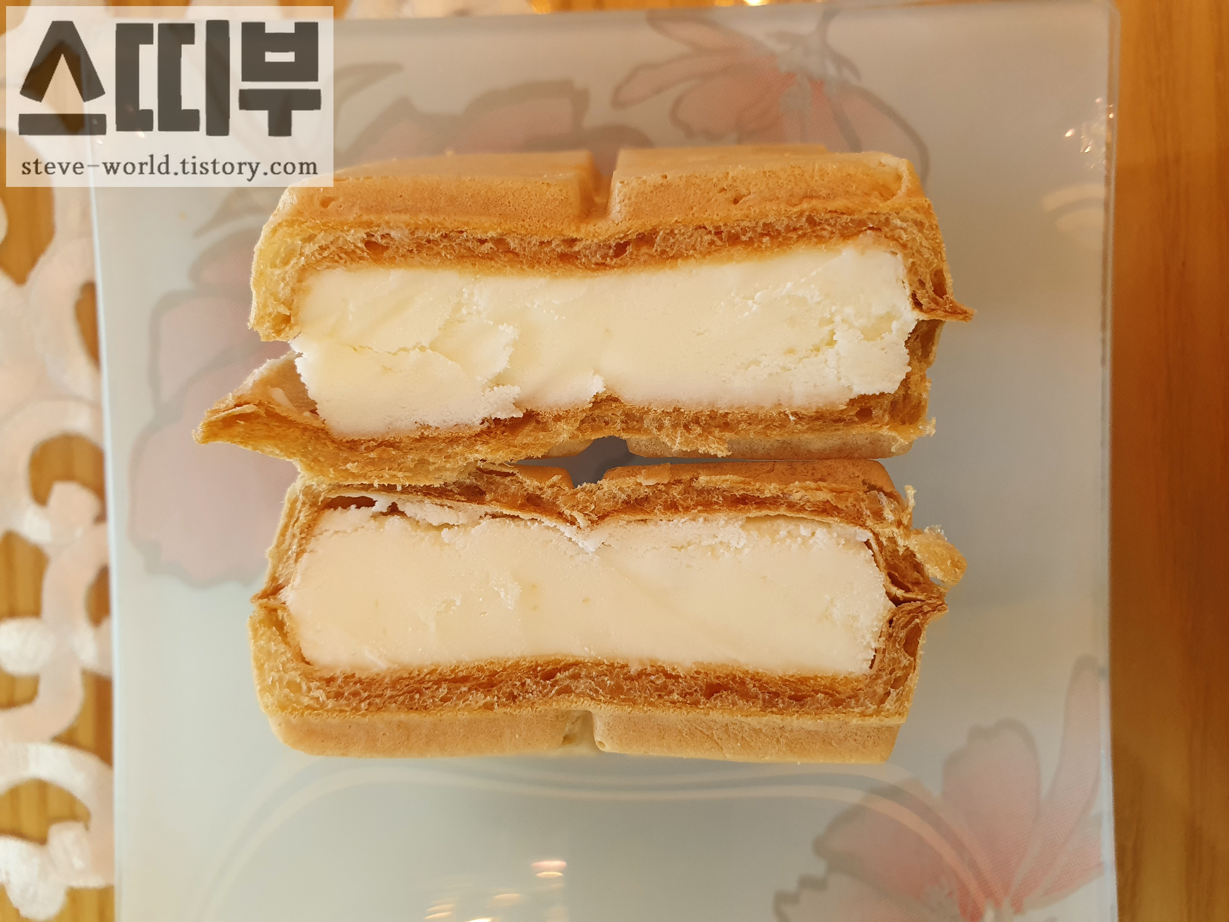 뽀얀 우유 아이스크림이 꽉 차있는 태극당 모나카 아이스크림입니다. 사진으로 봐도 느껴지지만 모나카의 피의 바삭함이 정말 살아있습니다. 겉모습만 봤을 때는 바삭한 게 맞는지 긴가 민가 했는데, 단면으로 자르니, 모나카 피의 꽉 찬 결이 보입니다. 한 입 깨물었을 때, 피가 바삭 고소하고, 우유맛은 진하게 느껴집니다. 정말 맛있었어요.