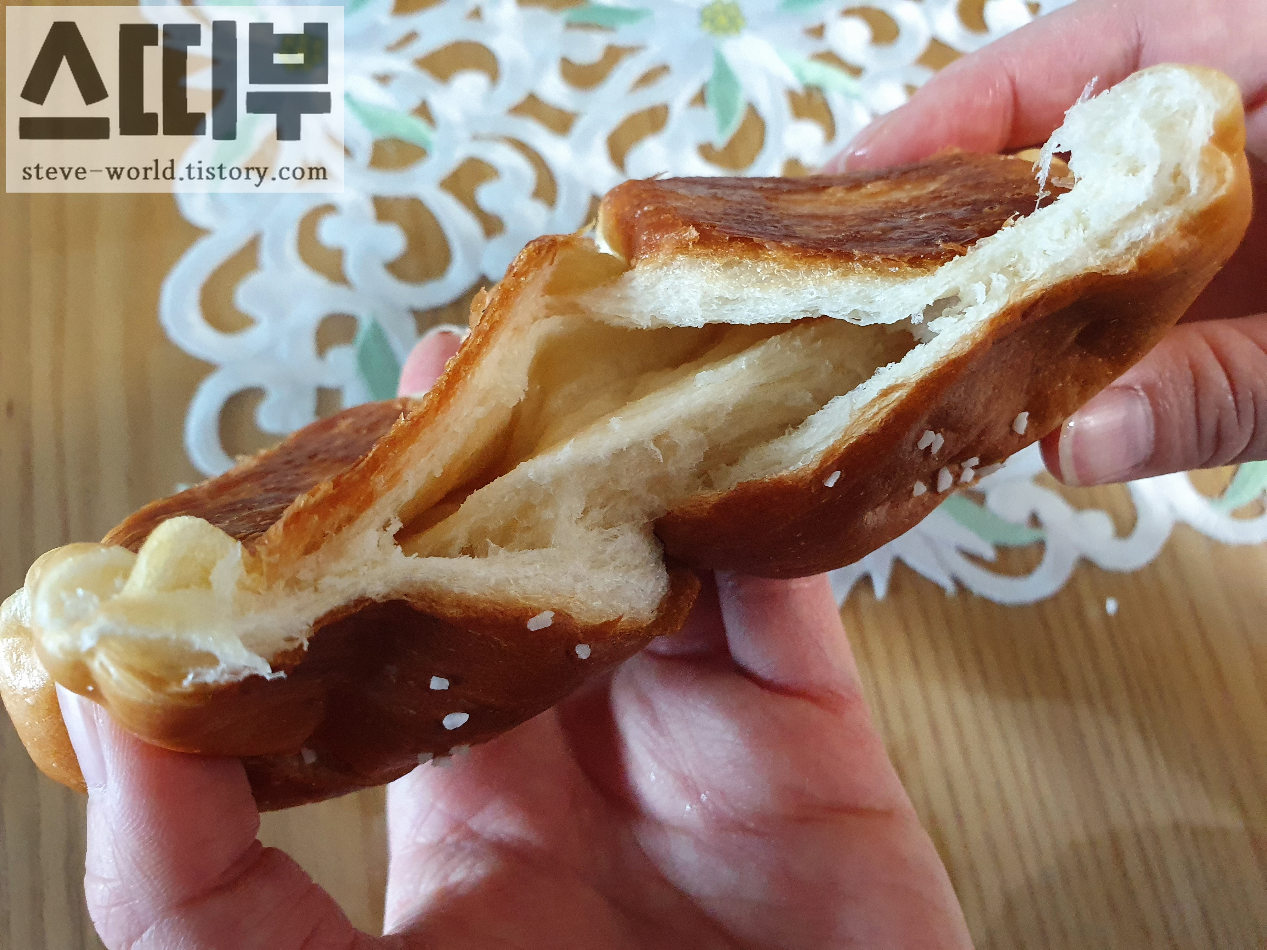 소금빵을 반으로 쭈아아악 가르는 모습입니다. 겉은 바삭하면서 속은 쫀득한 정말 맛있는 소금빵이었습니다. 반을 가르면서 고소한 버터향이 올라와서 후각적인 효과까지 더합니다.