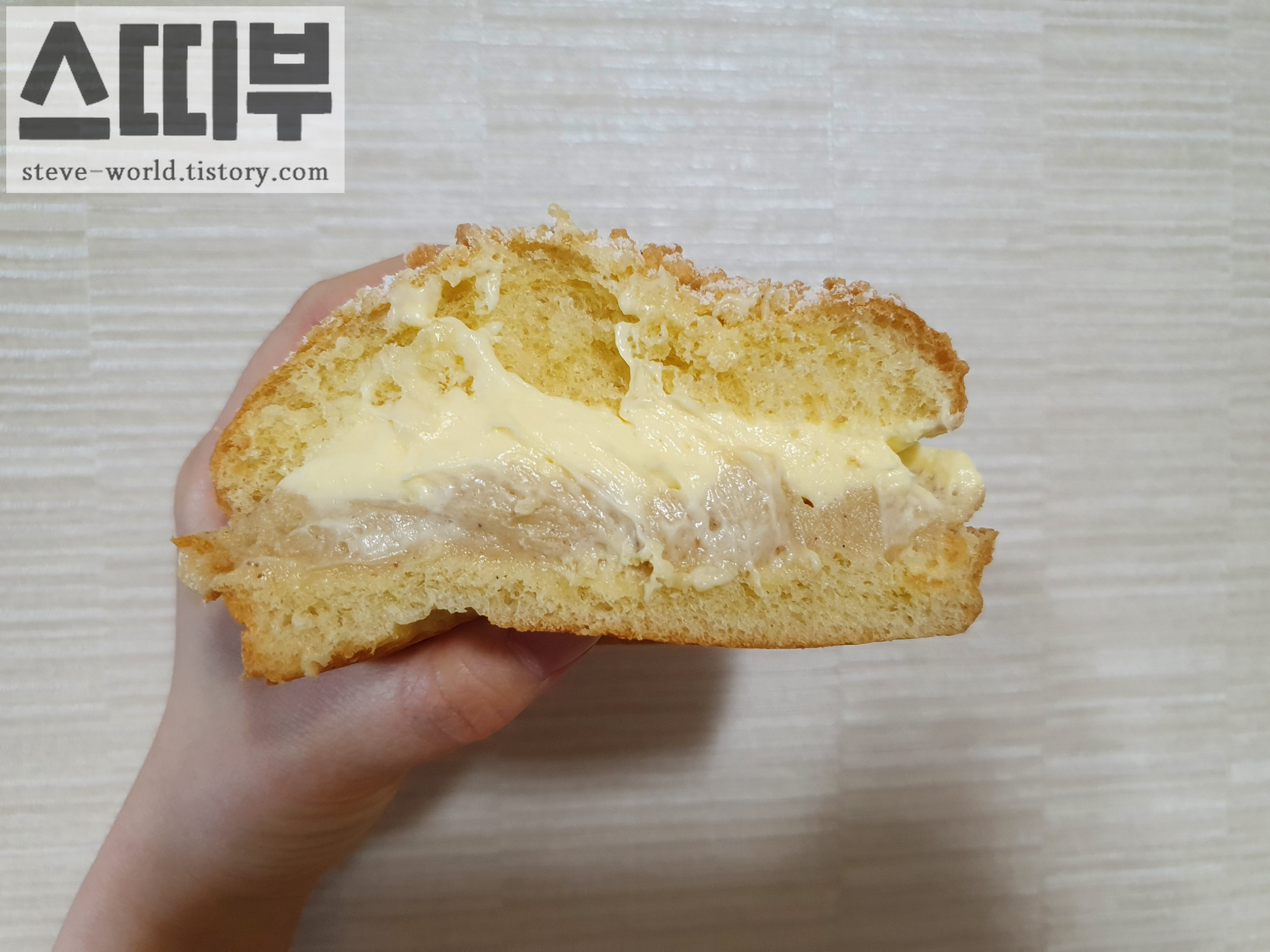 헤이즐넛 트로페지엔느의 단면입니다. 두껍게만 보이는 빵 속에 사실은 헤이즐넛 크림과 커스터드+마스카포네 치즈가 두터운 층으로 숨겨져 있었습니다. 진한 우유맛과 고소하고 달콤한 헤이즐넛 맛이 별미인 디저트입니다.