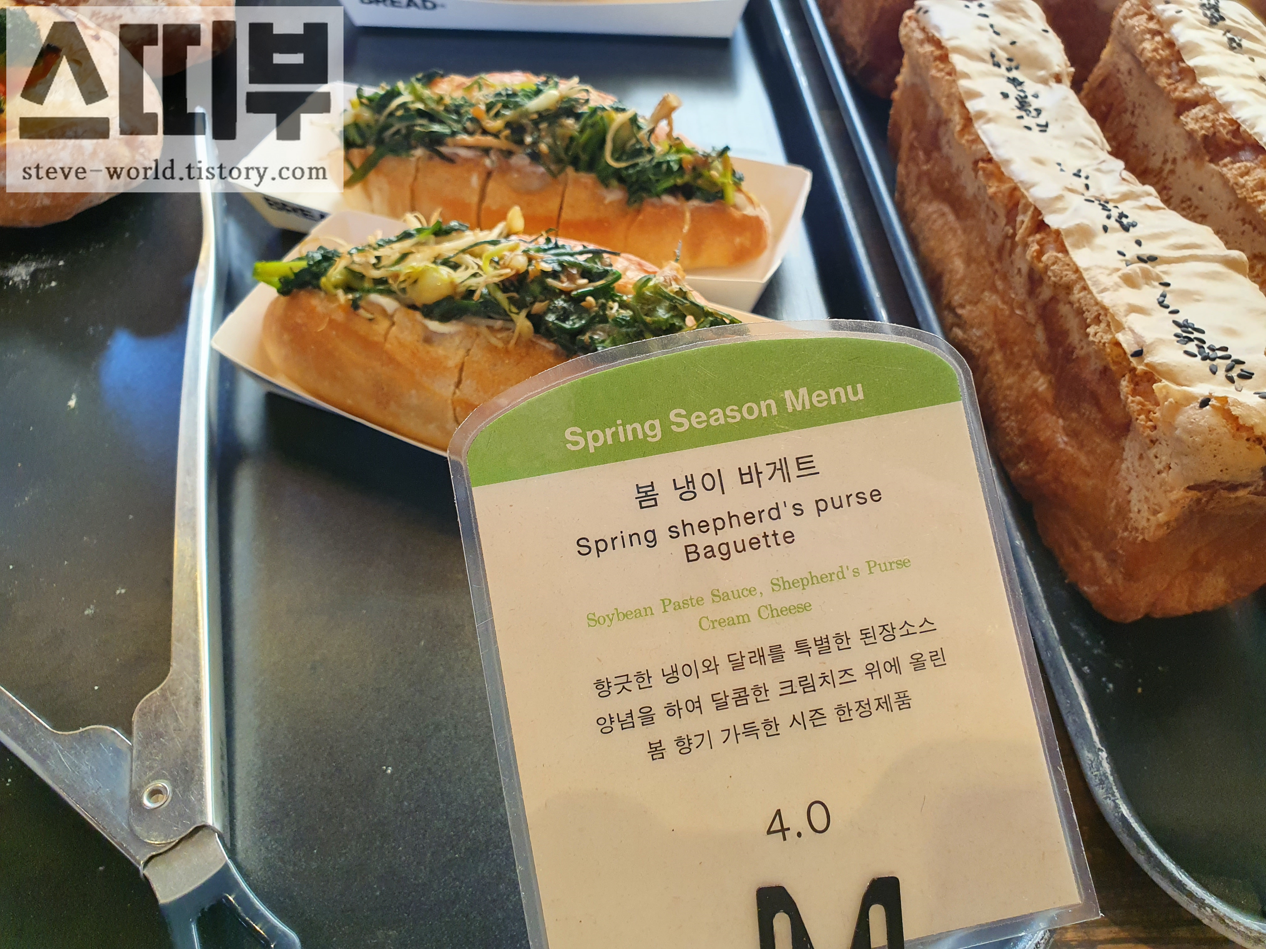 제가 4월, 봄에 방문했던 터라 봄 시즌 메뉴인 봄 냉이 바게트도 볼 수 있었습니다. 향긋한 냉이, 달레와 특별한 된장소스가 가미된 크림치즈 바게트라고 하는데, 맛이 전혀 상상이 되질 않았습니다. 내년 봄에 만난다면 꼭 먹어보고 싶습니다.