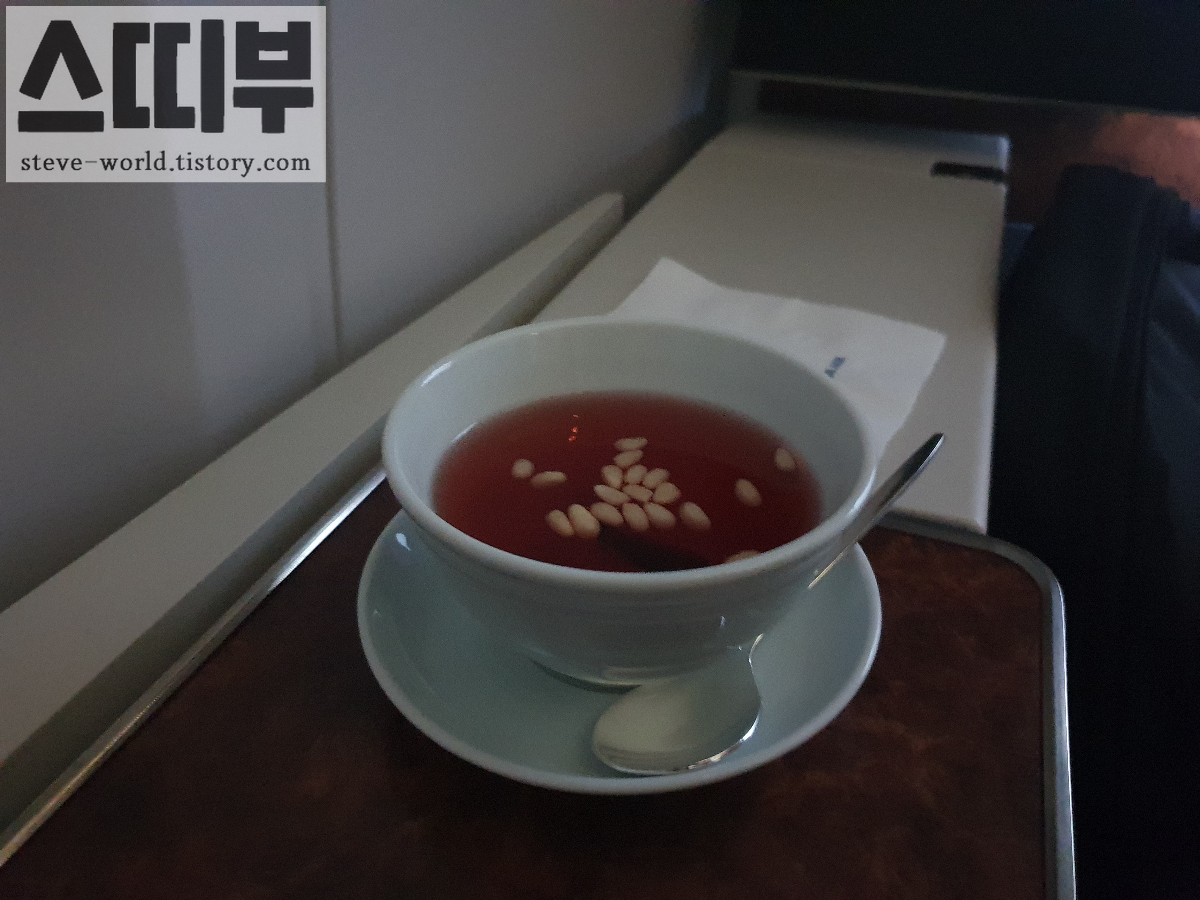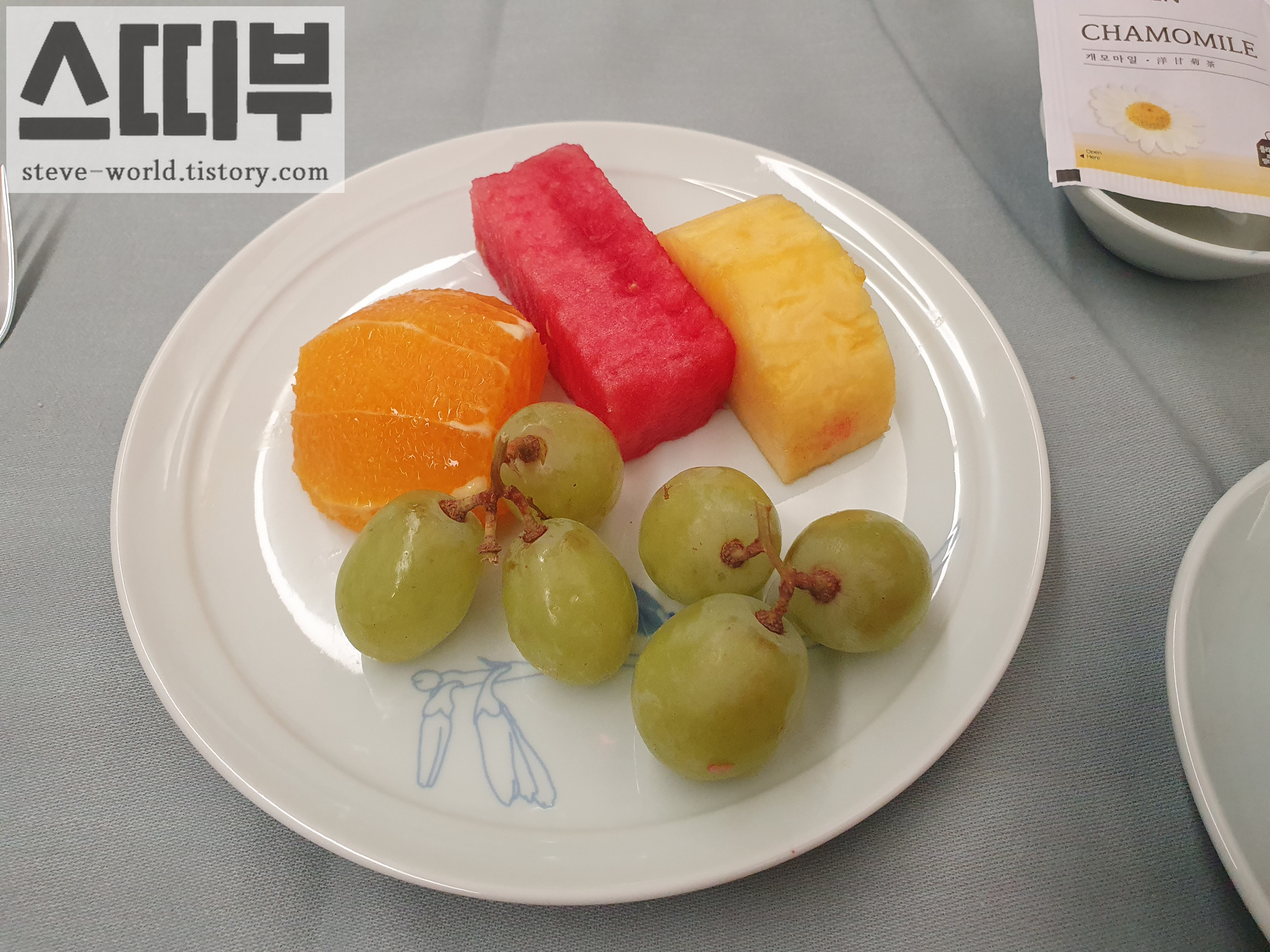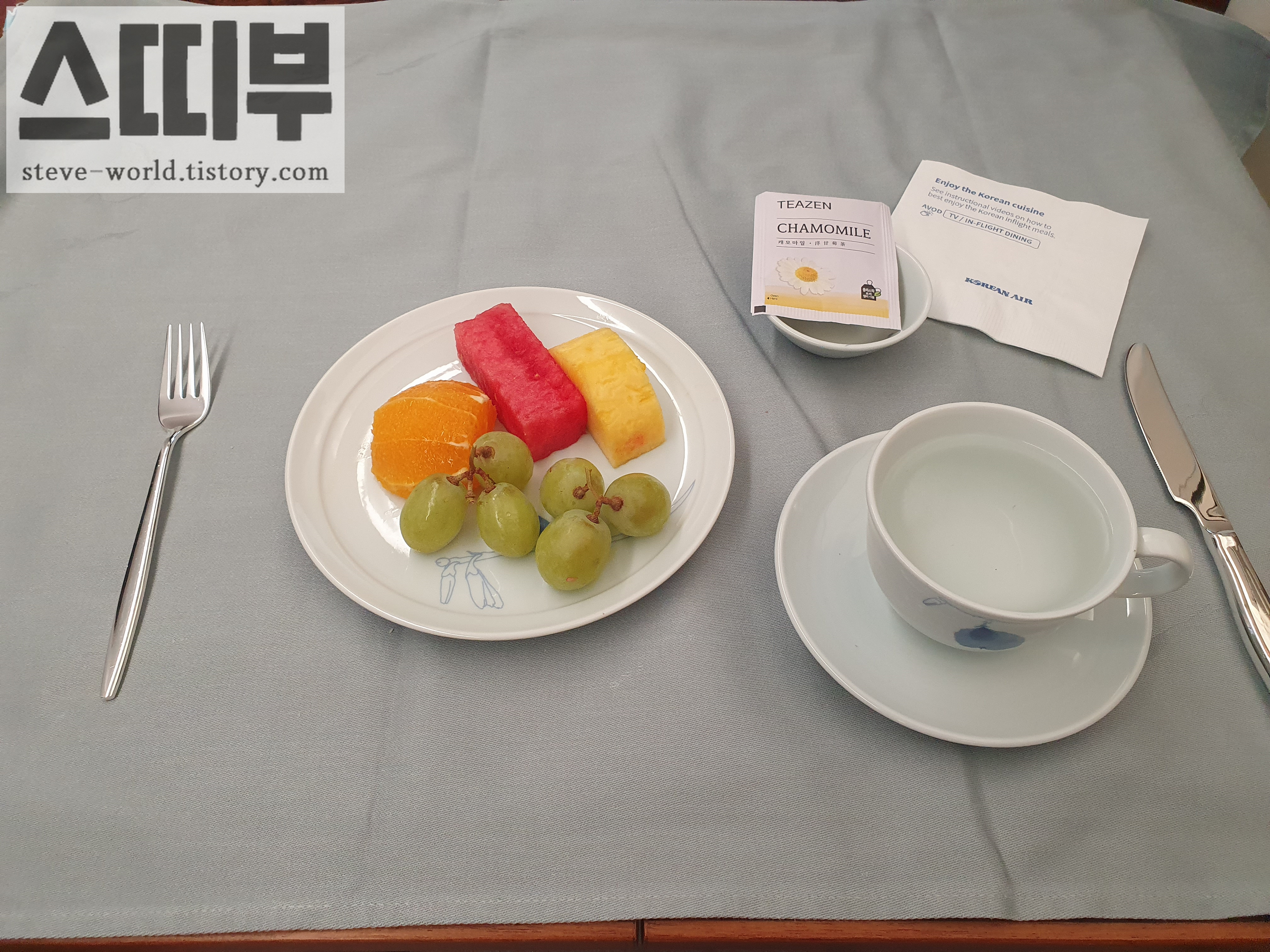 출국행 비행기에서 식후 커피를 마시고 잠을 못 잤던 것이 기억나서 캐모마일 차를 마셨습니다. 커피는 자고 일어나서 맛있게 마시기로...