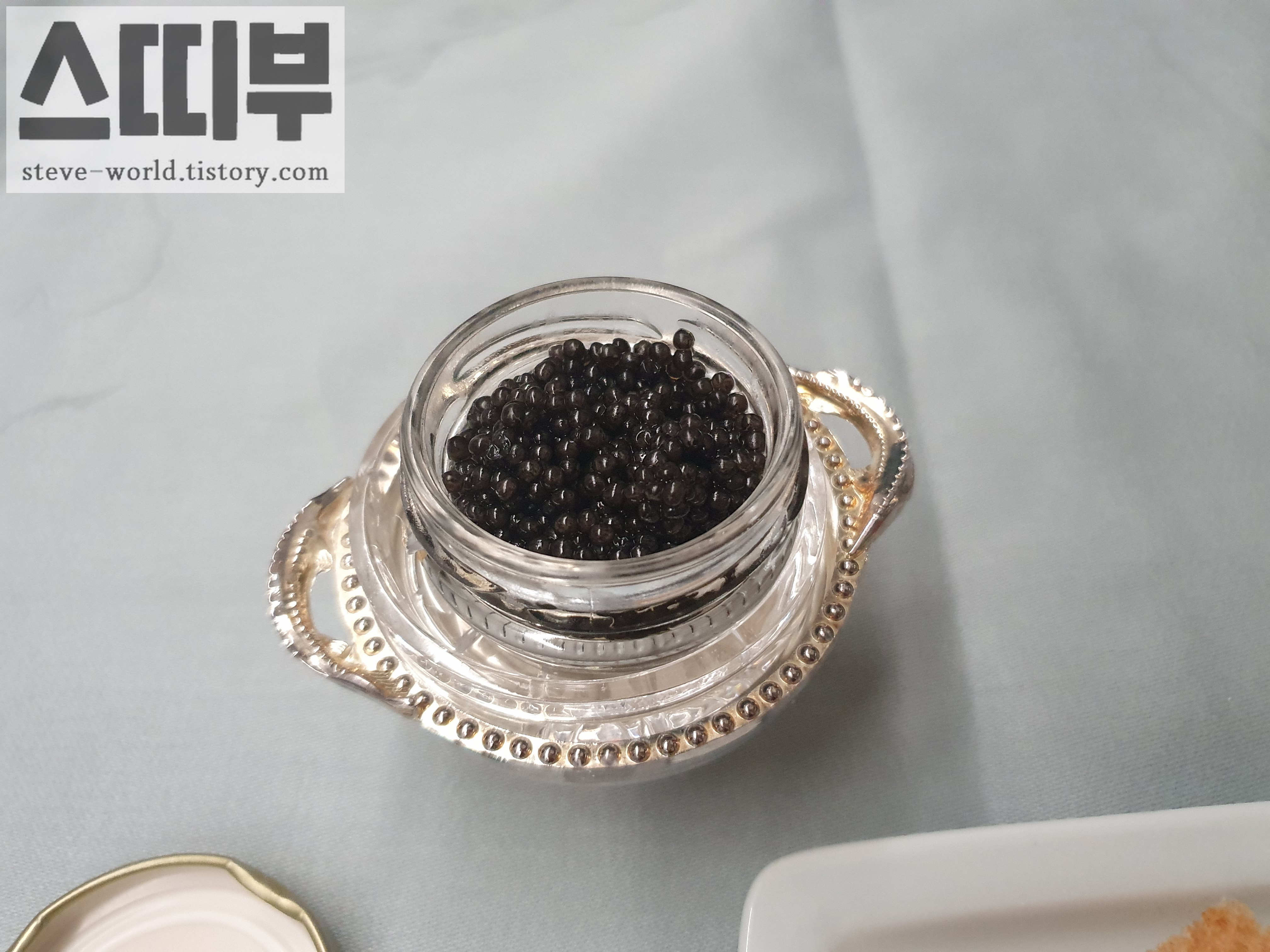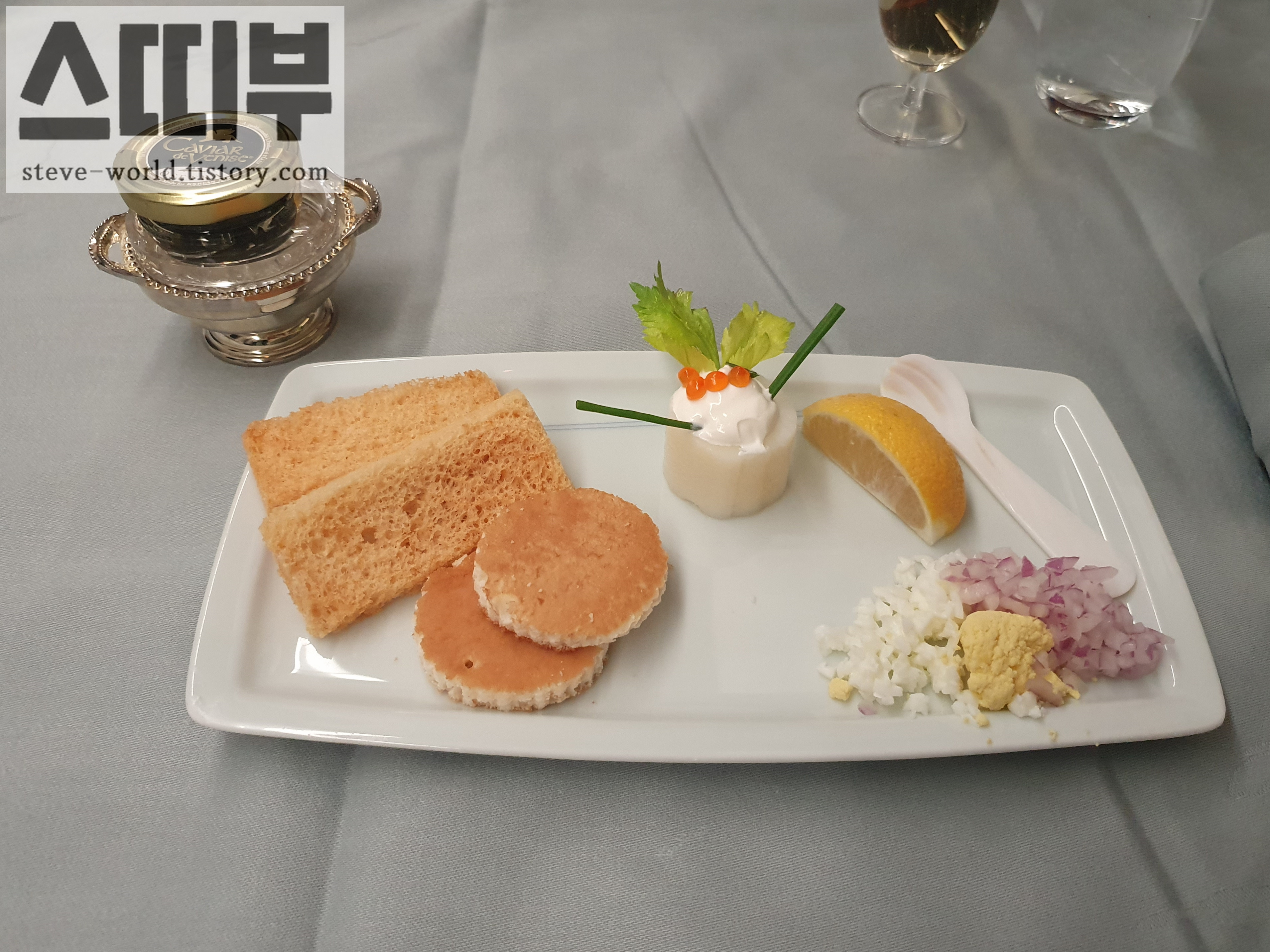 오세트라 캐비어와 비스켓, 블리니, 적양파, 달걀, 사워크림이 함께 서비스됩니다.