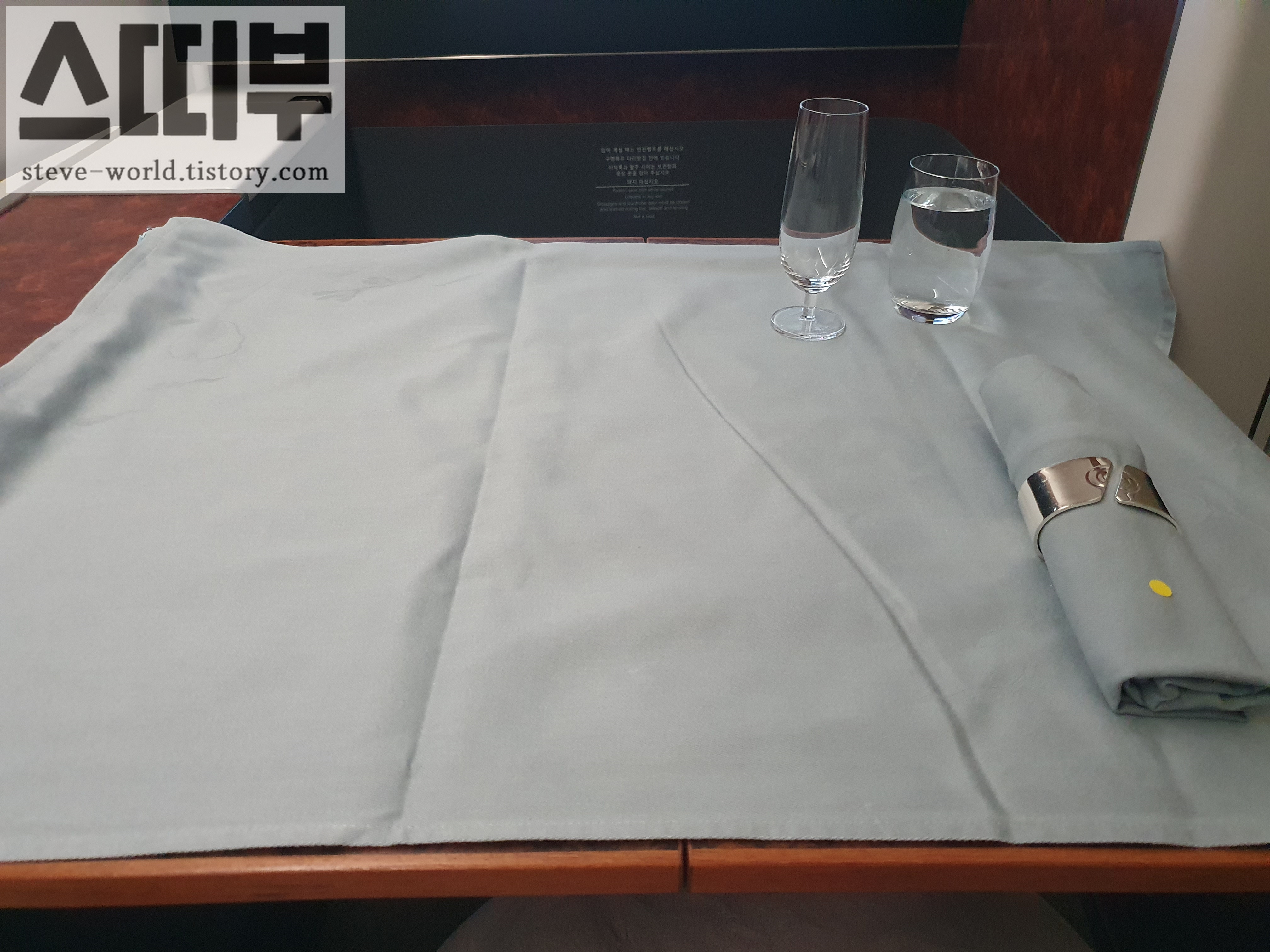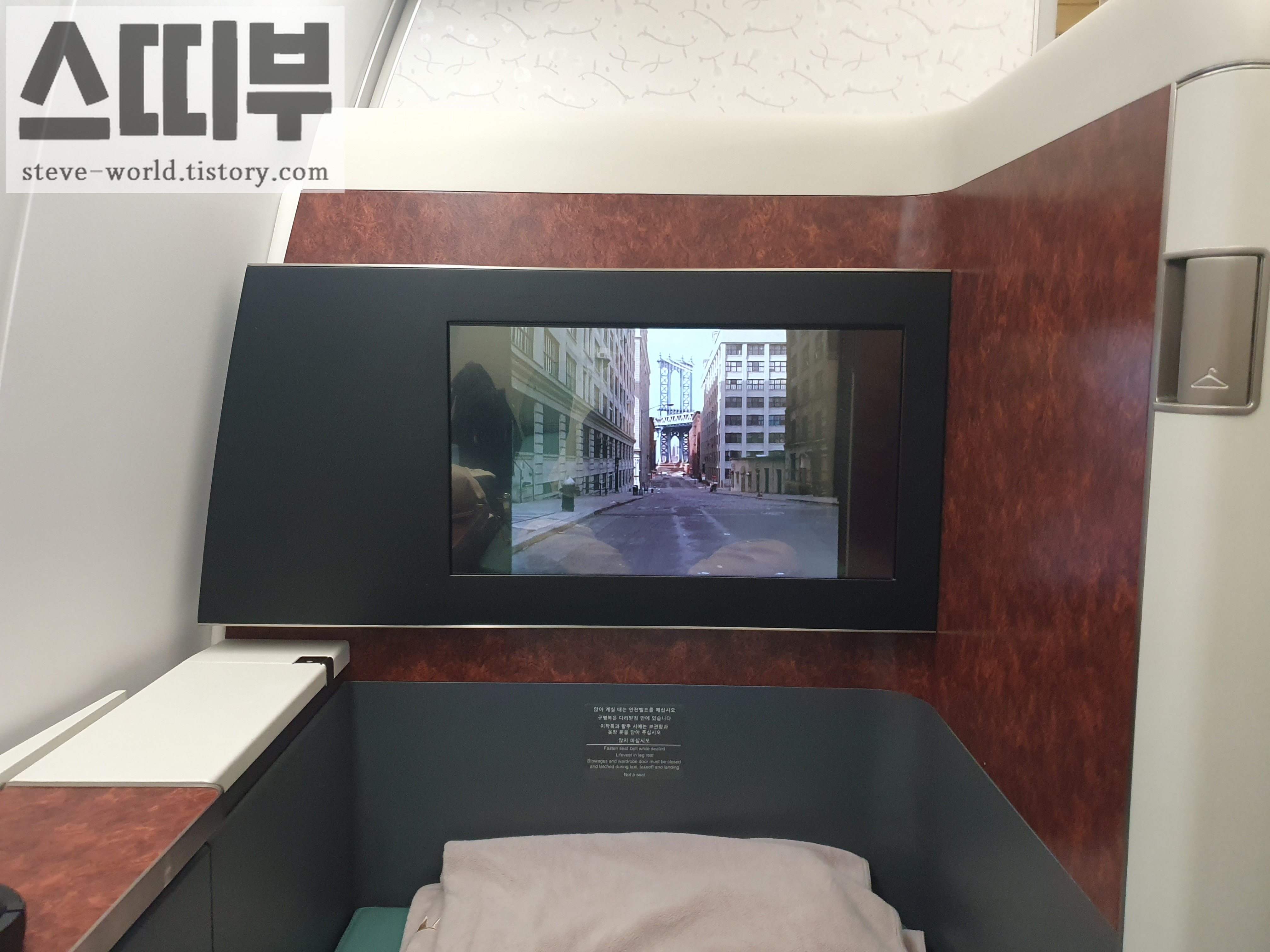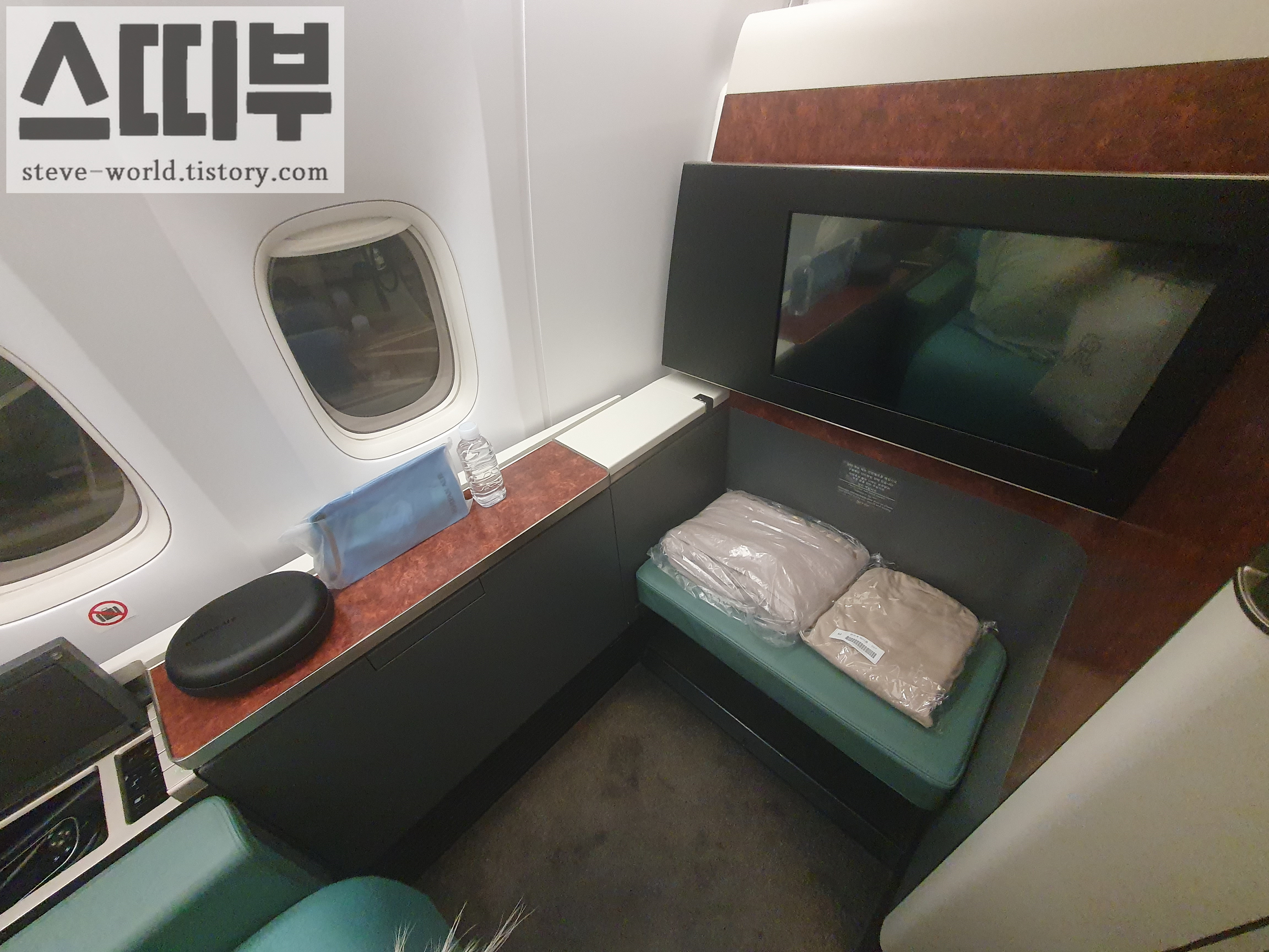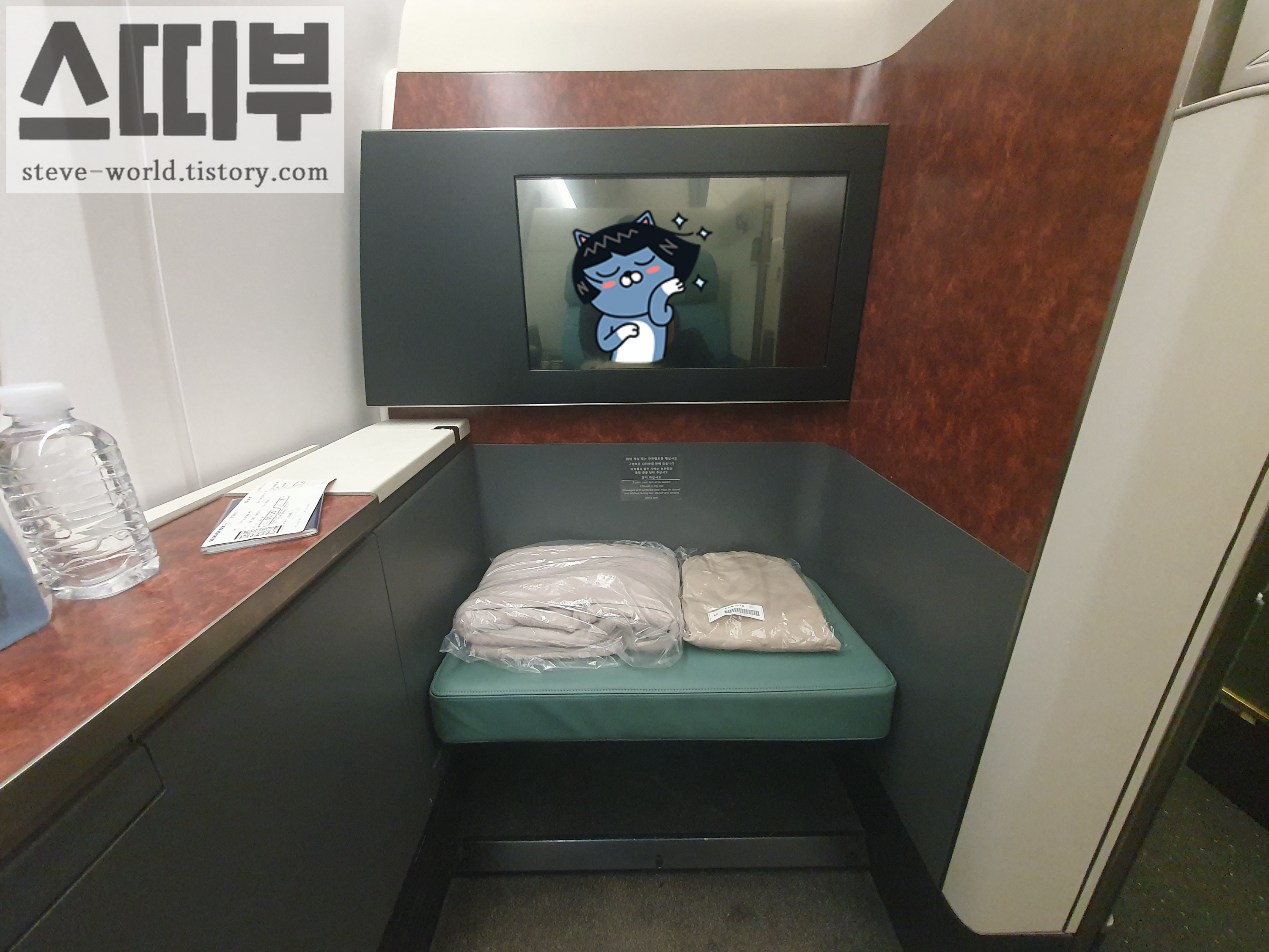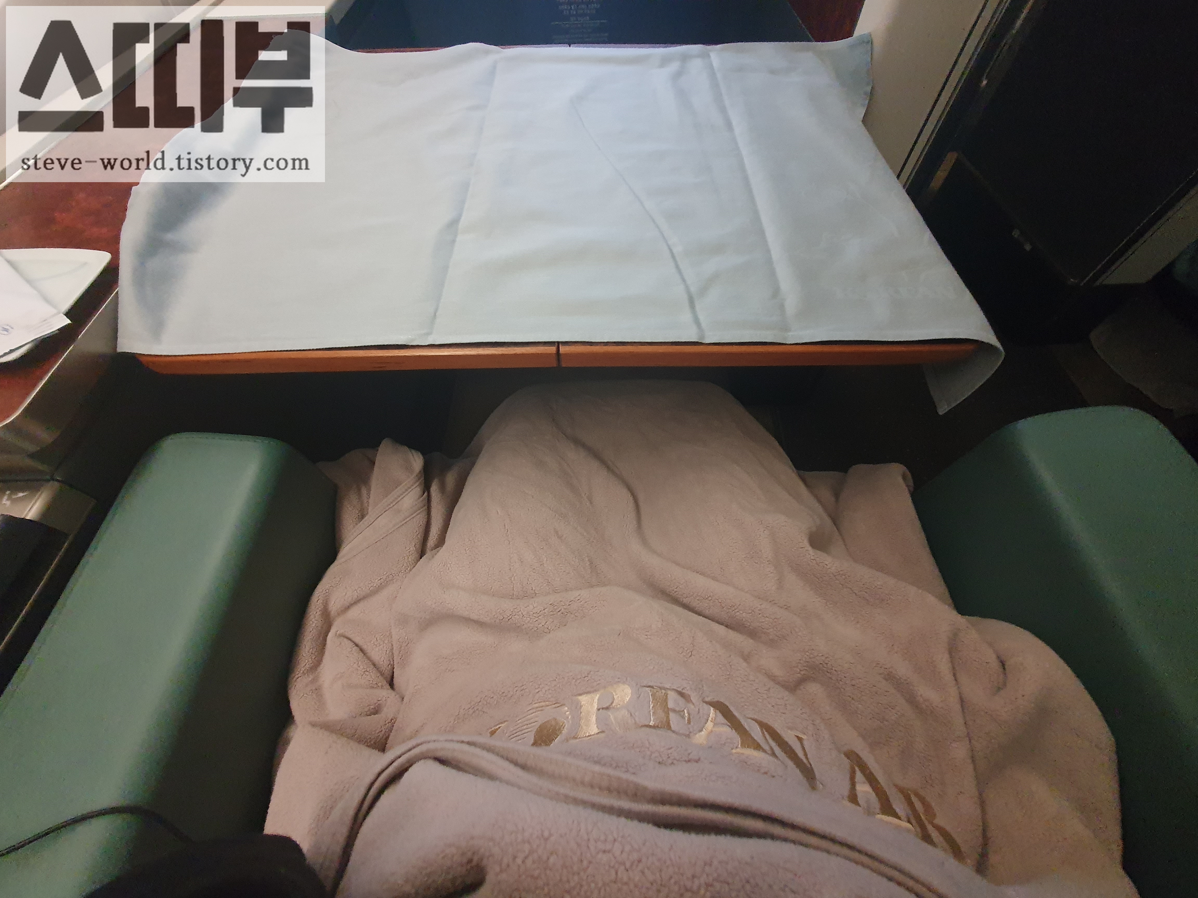 프레스티지석은 그냥 플랫베드에 담요를 덮고 자는 거라면, (이것도 좌석에 따라 다릅니다. 풀플랫이 되는 좌석이 있고, 풀 플랫이 안돼서 줄줄 내려오는 좌석이 있고..) 일등석은 더 넓은 공간+풀플랫에 얇은 토퍼를 깔아서 잠자리를 만들어 줍니다. 도톰한 이불도 제공됩니다. 우측 사진은 좌석 위에 얇은 토퍼, 그 위에 이불이 깔려있는 모습입니다. 잠자리가 정말 좋았습니다.