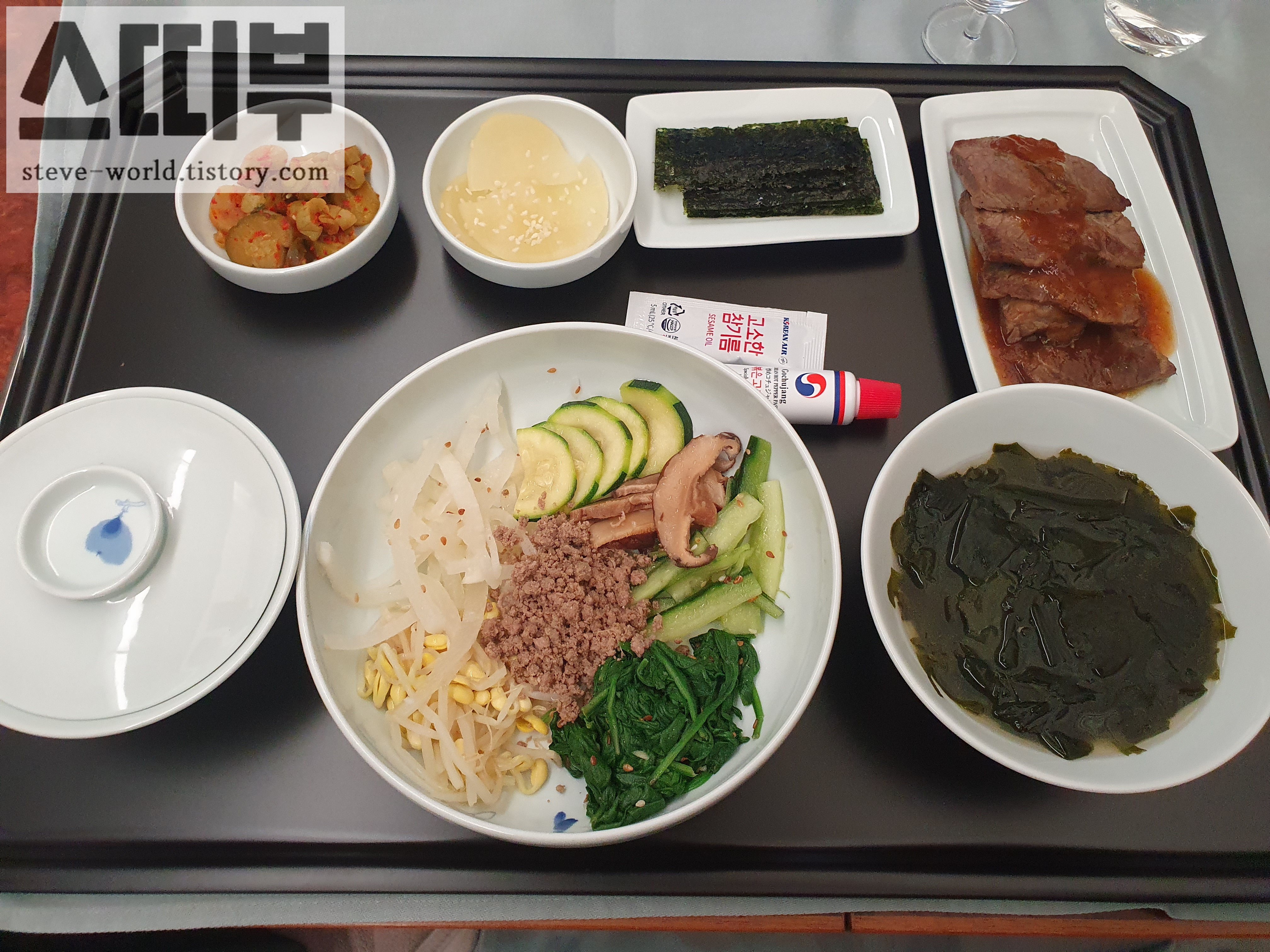 제가 탑승한 비행기에서는 비빔밥, 딜크림소스 대구요리, 쇠고기 스튜 총 세 가지 메뉴 중 선택할 수 있었습니다.
