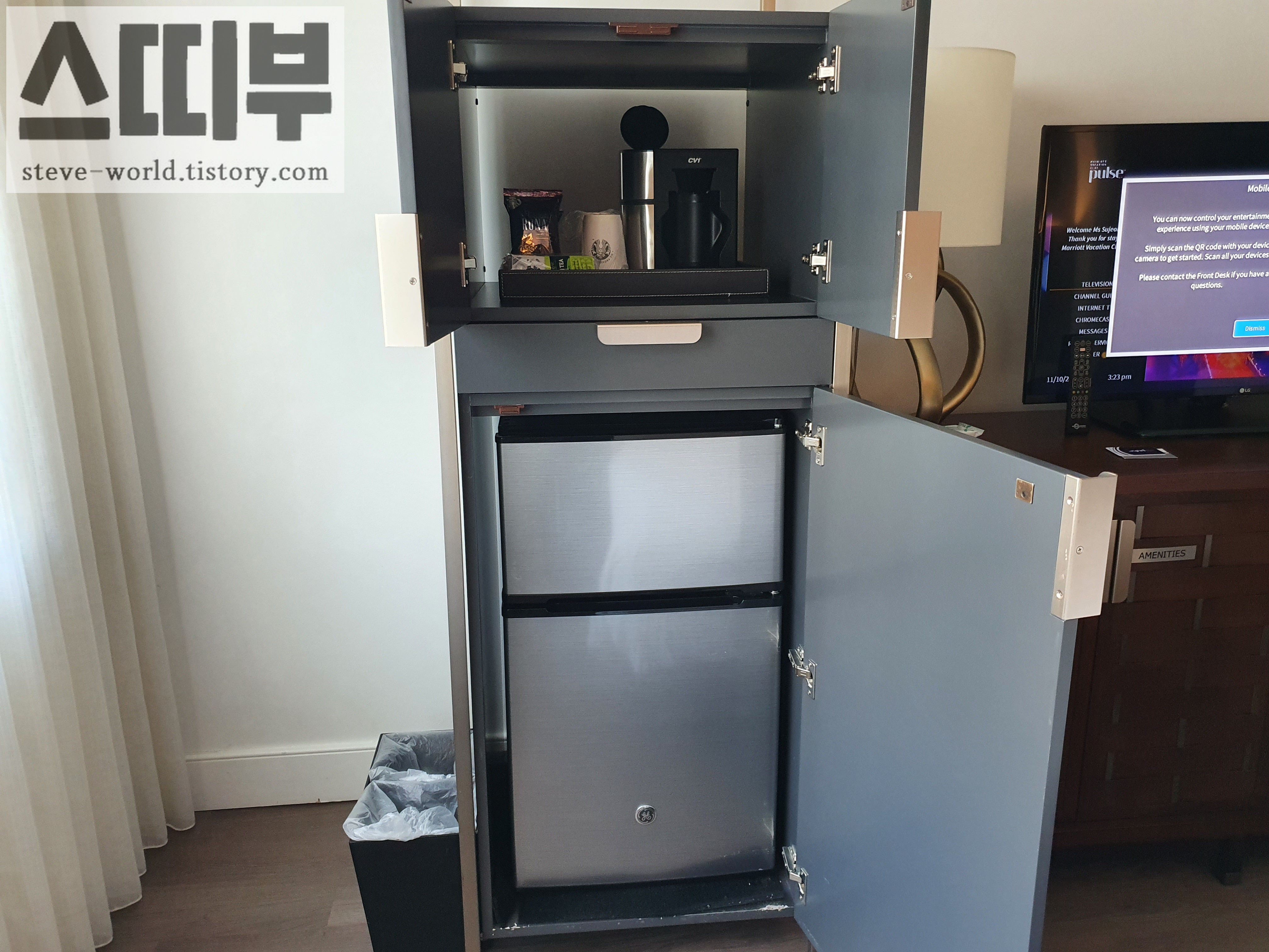 가장 마음에 드는 것은 냉장고였습니다. 장의 아랫부분에는 작은 냉장고가 있는데, 냉동고/냉장고가 분리되어 있는 비교적 큰 냉장고가 있습니다. 홀푸드 마켓에서 쵸바니 요거트를 사 와서 냉장고에 두고 간단한 아침으로 먹기도 했습니다.