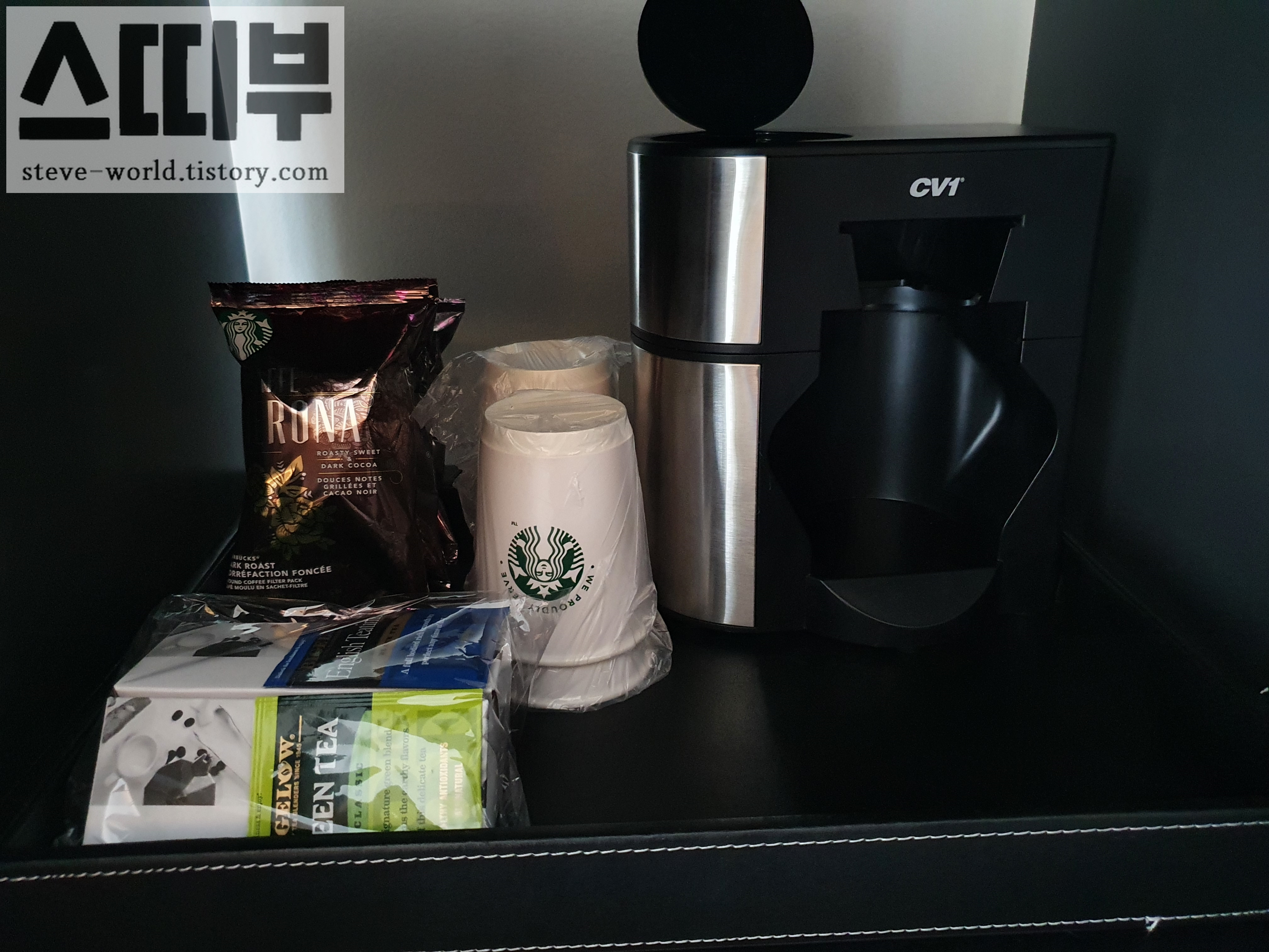 상부에는 커피 머신이 있습니다. 스타벅스 원두가 준비되어 있습니다.