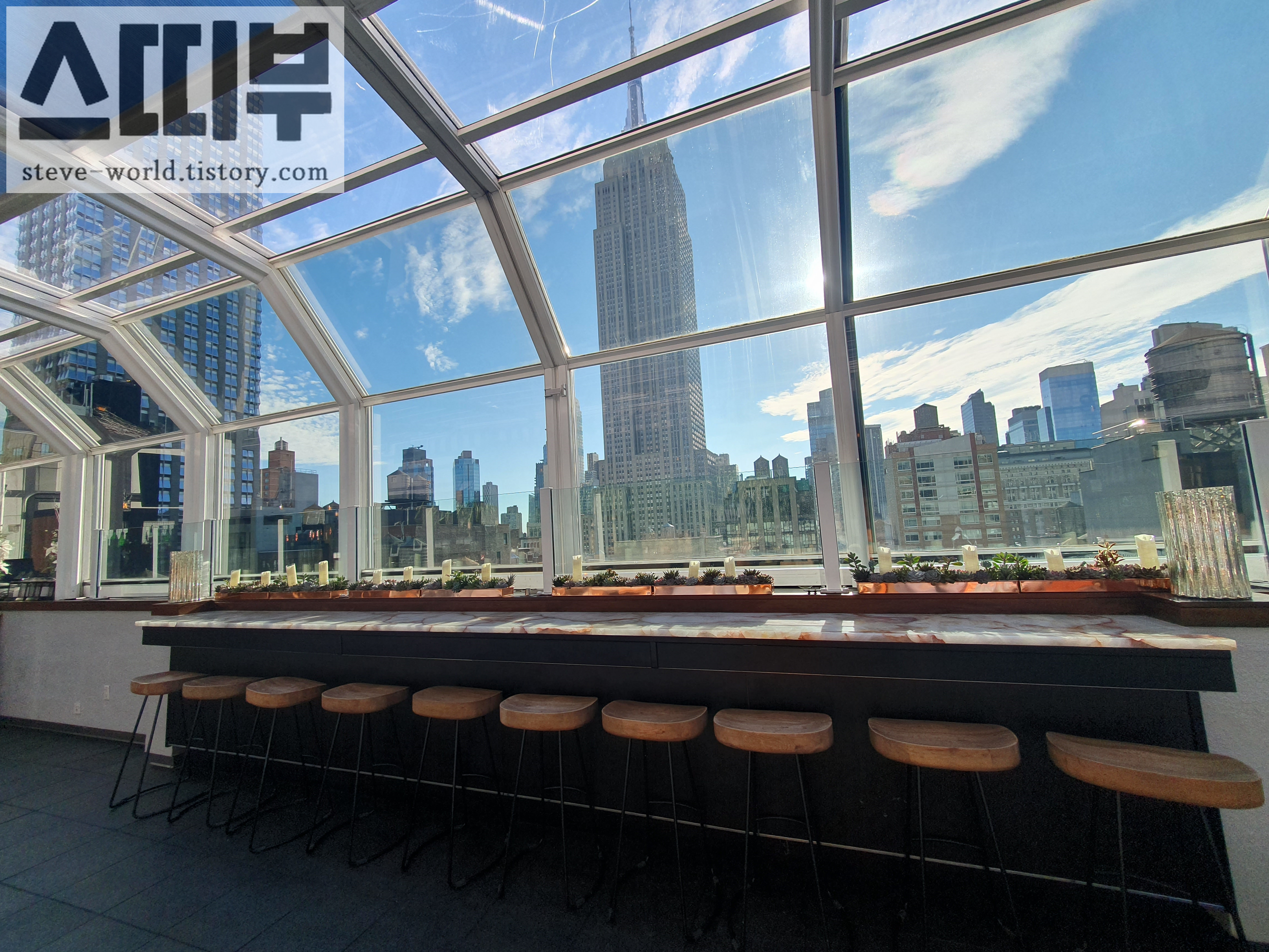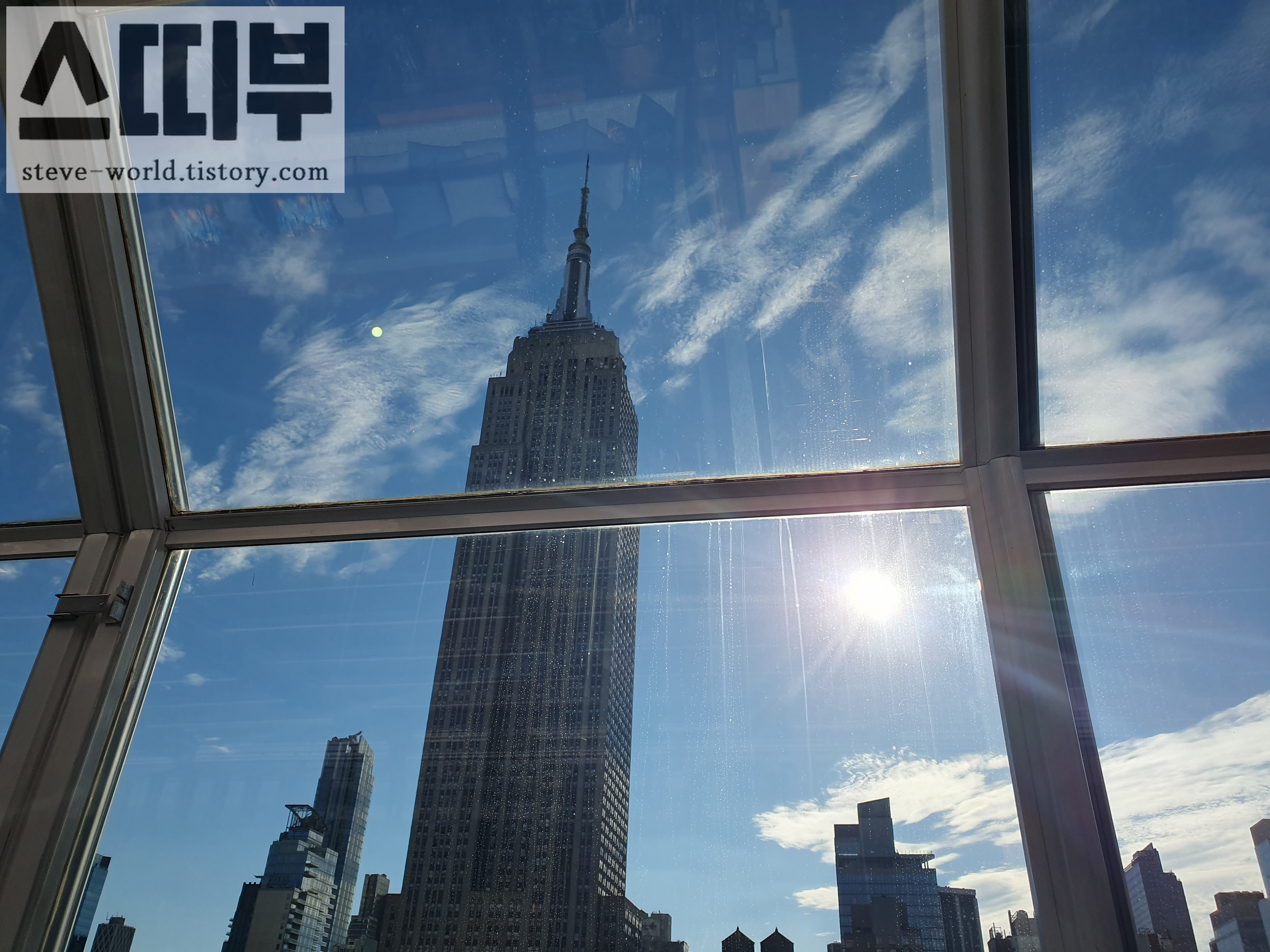 루프탑 바에서 엠파이어 스테이트 빌딩을 제대로 보지 못한 것이 아쉬워서, 화창한 낮에 한 번 더 찾았습니다. 창문을 통해서 맑은 하늘을 배경으로 엠파이어 스테이트 빌딩이 잘 보입니다.