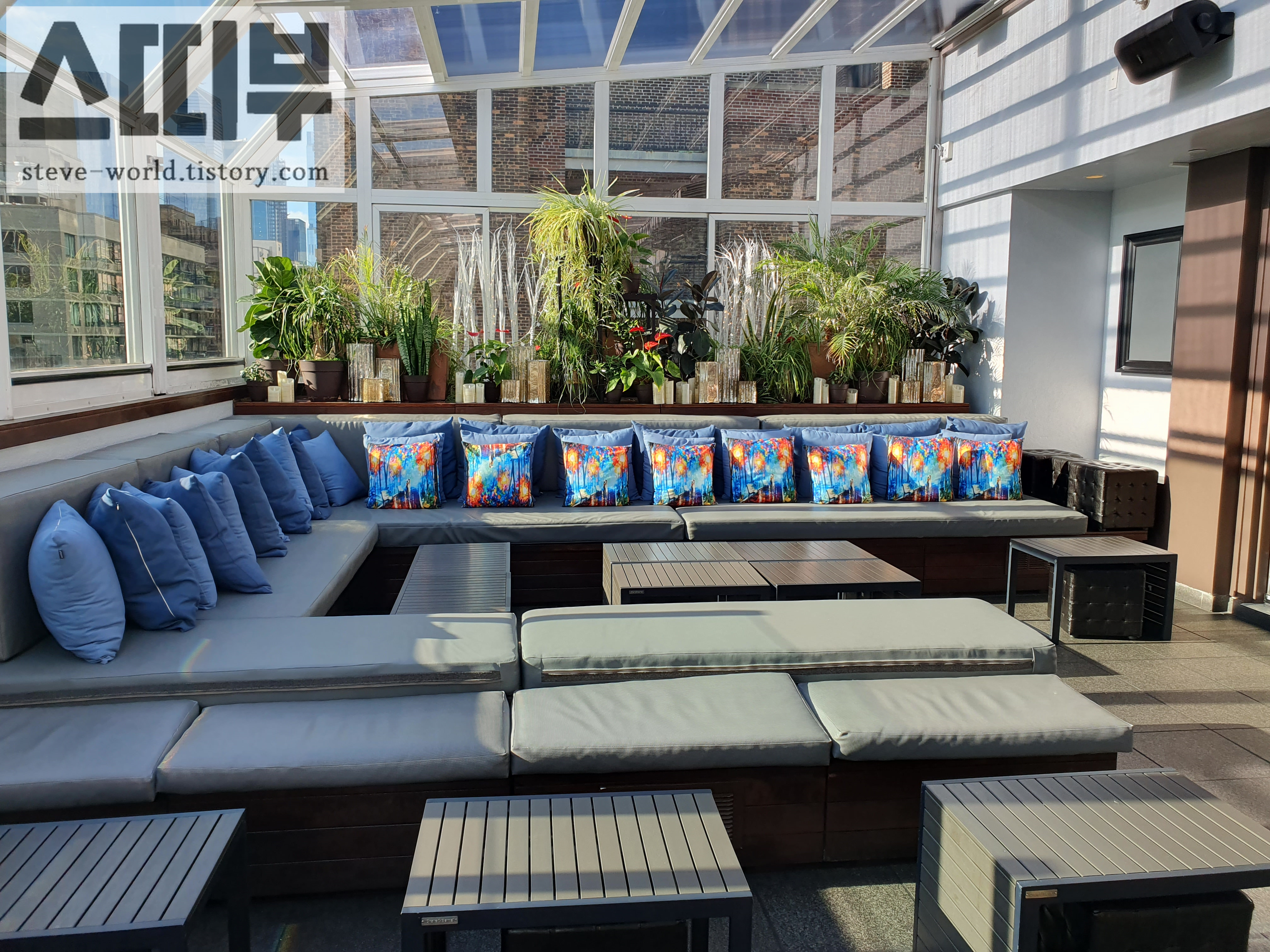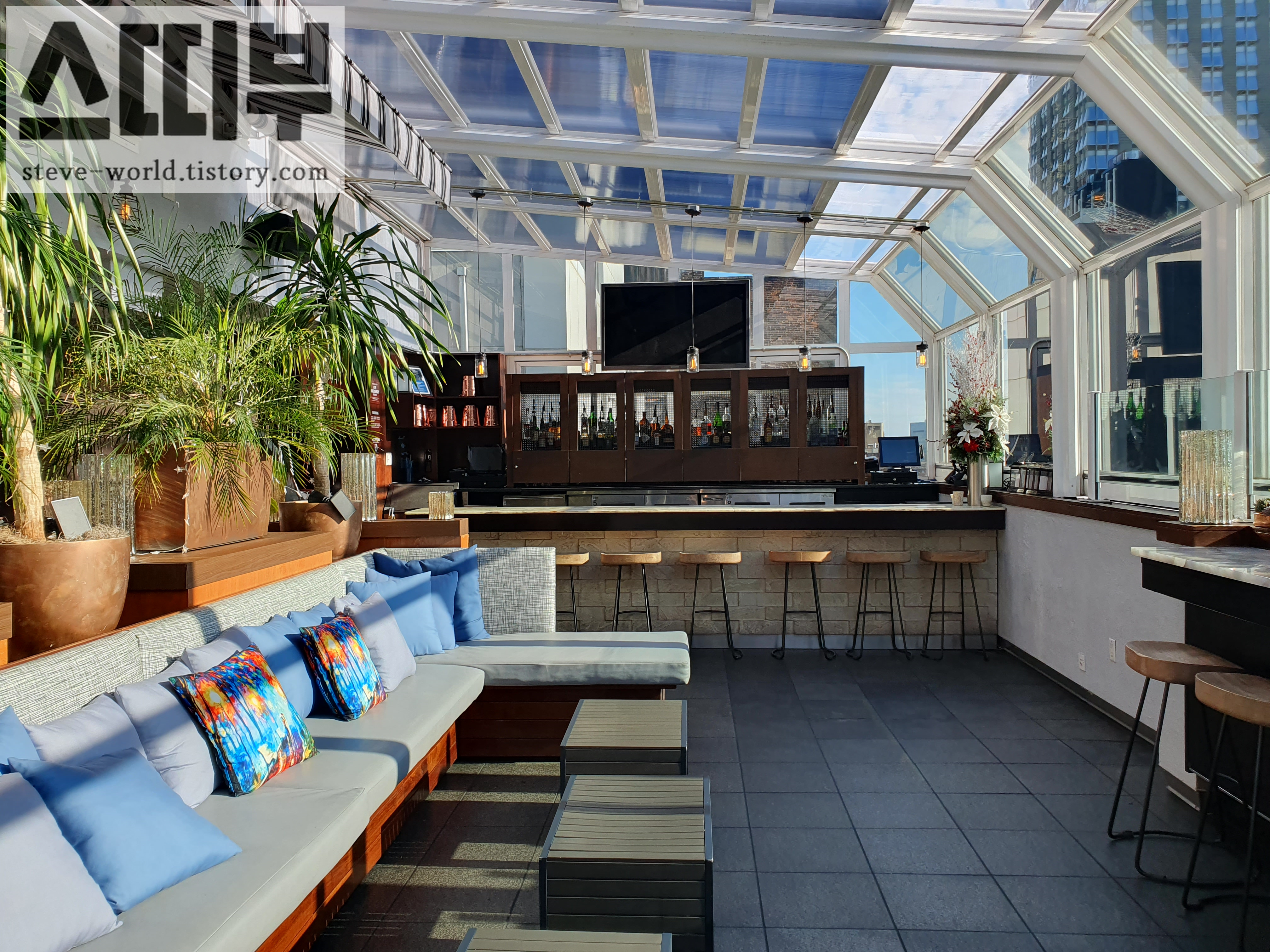 루프탑 바 내부 사진입니다. 밤에 찾았을 때는 어두워서 내부가 잘 잘 안보였는데, 밝은 낮에 보니 깔끔하고 모던한 내부가 유리창과 잘 어울립니다.