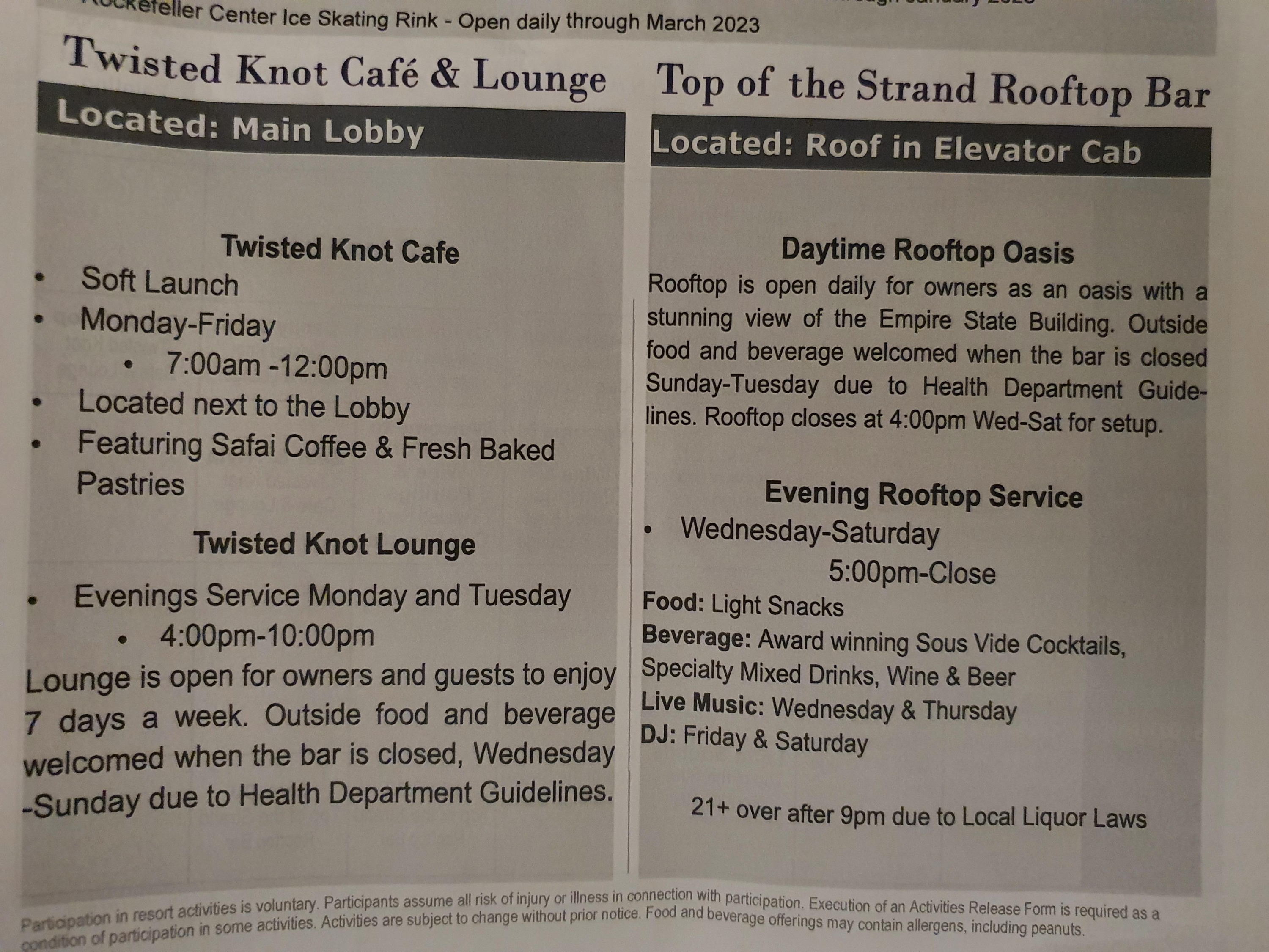 Top of the Strand Rooftop Bar는 수요일 ~ 토요일 오후 5시부터 영업을 합니다. 루프탑 바가 영업을 하지 않는 일요일 ~ 화요일에는 투숙객의 외부음식이 허용된다고 설명되어 있습니다.