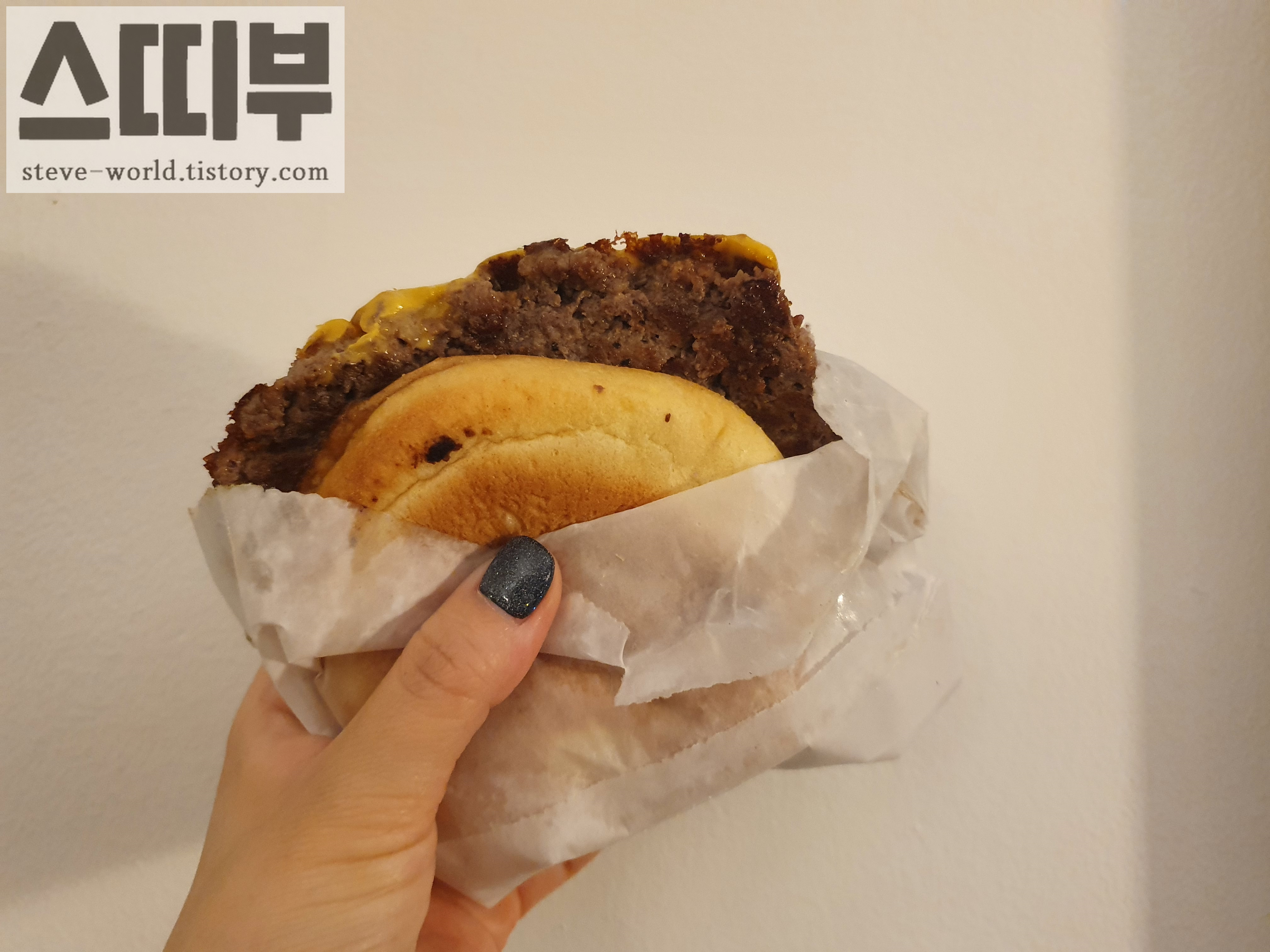 패티가 버거 번에 비해 많이 삐져나와있습니다. 어쩜 양념 맛에 의지하지 않고 고기 맛 자체로 맛있는지 놀랐습니다.