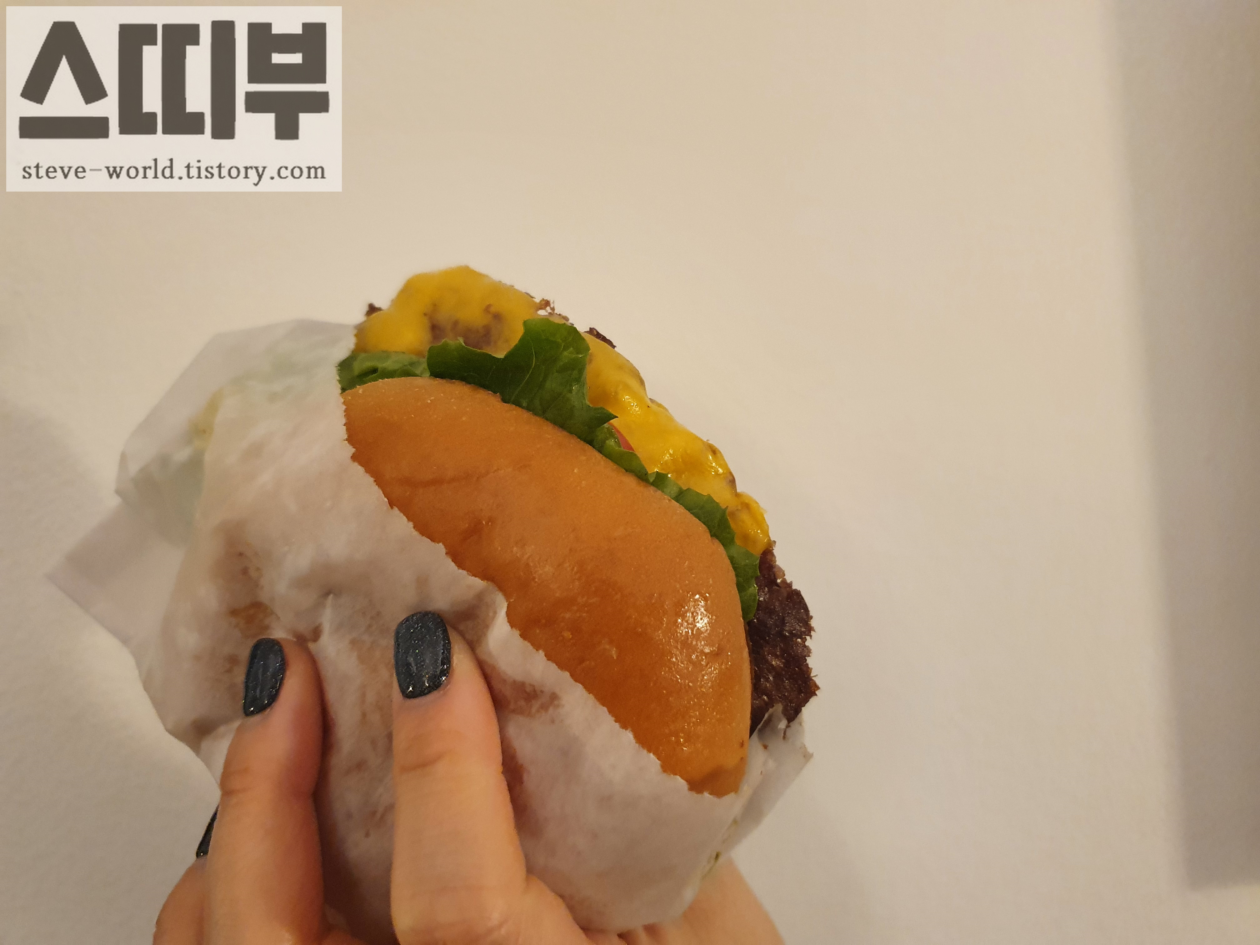 나중에 인앤아웃도 먹어보고 느낀 점이지만, 쉐이크쉑은 버거 자체가 굉장히 조화롭다고 느껴졌습니다. 노오란 색감의 쫄깃한 번과 고기 맛 자체로 맛있는 고소하면서 얇고 납작한 패티, 그 패티위를 감싸고 있는 치즈의 맛과 토마토와 양상추의 적절한 조합이 잘 어우러진 햄버거였습니다.