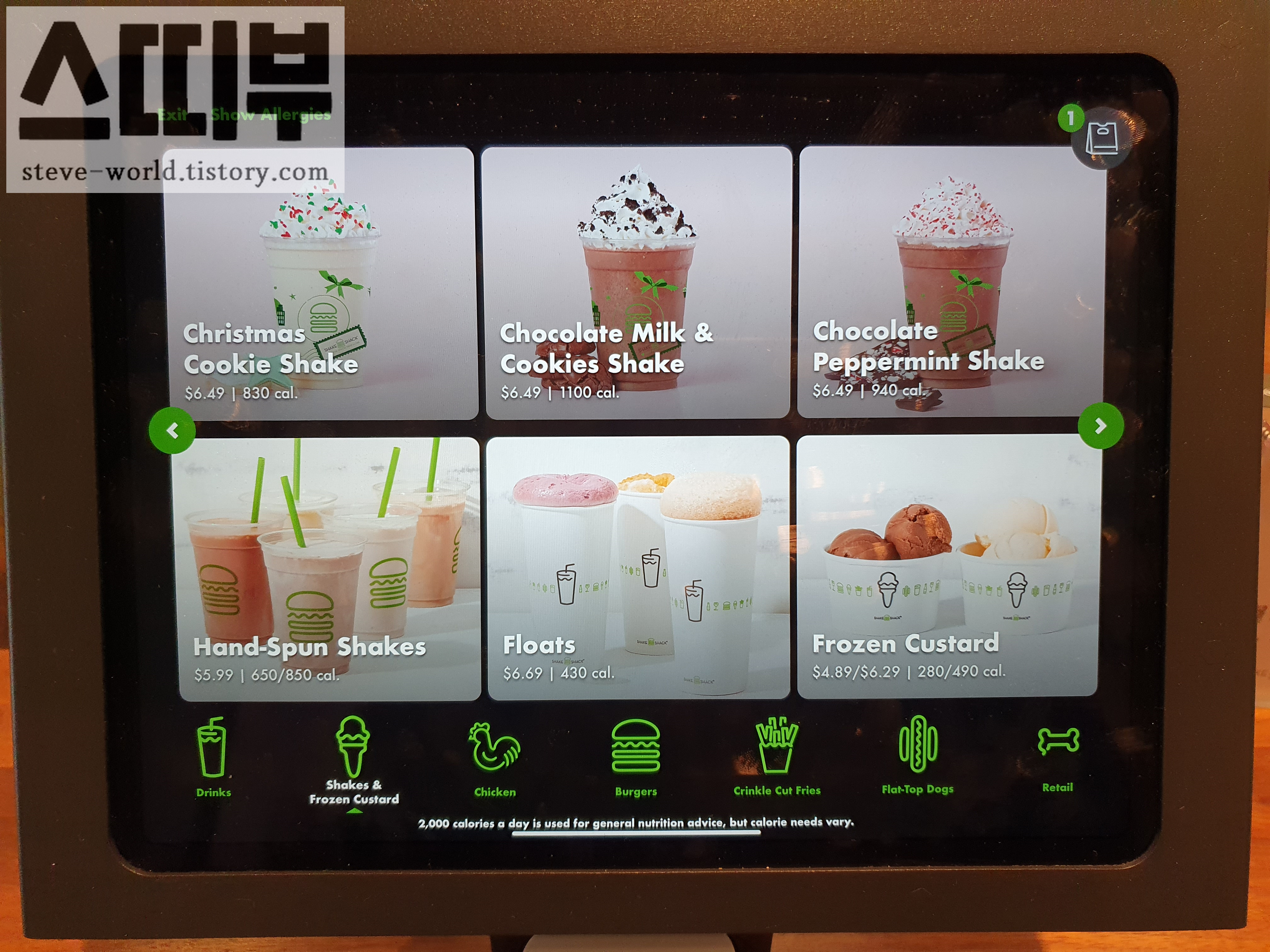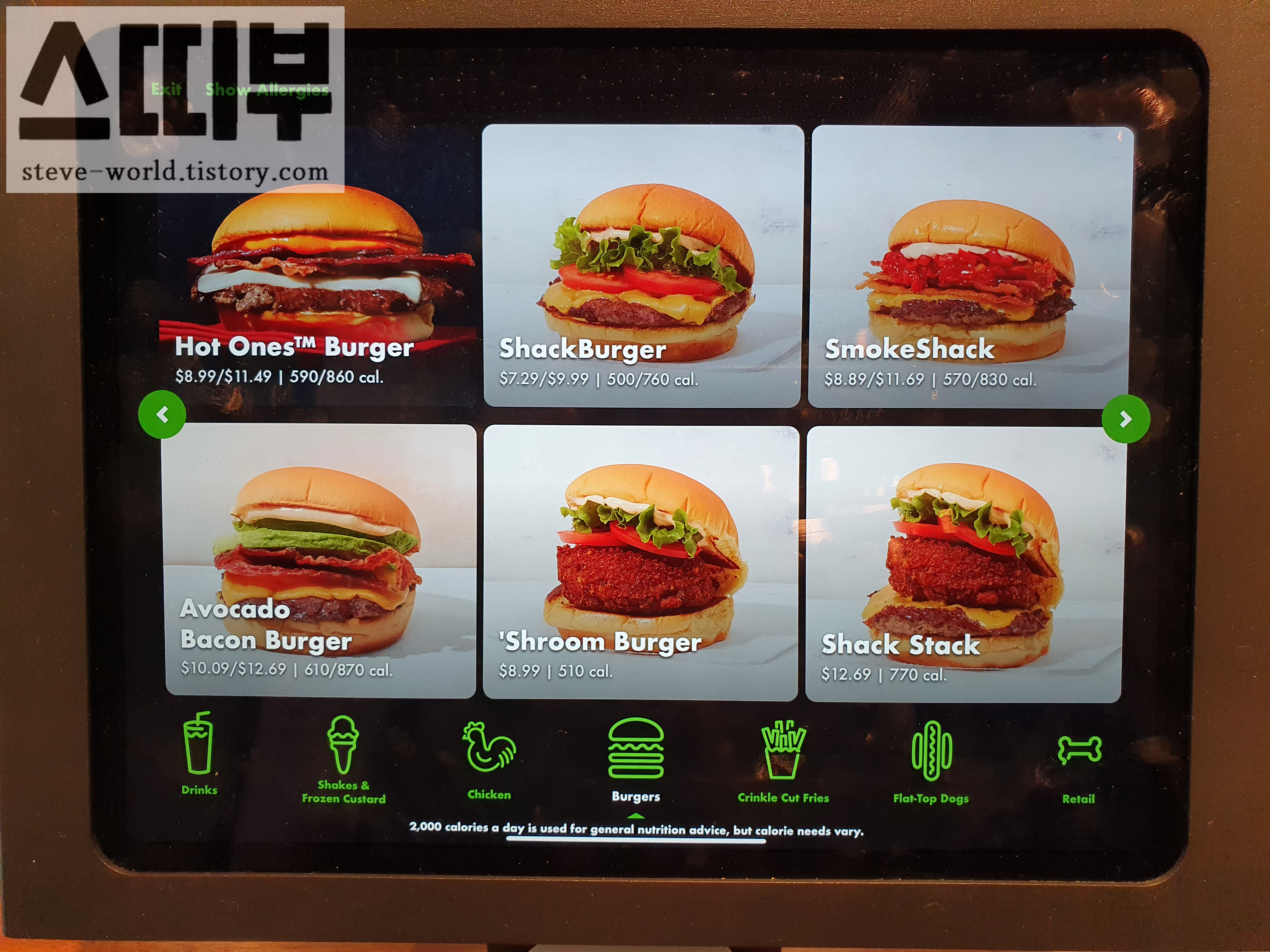 주문하는 패드의 화면입니다. 저는 가장 기본이라 할 수 있는 shack burger 작은 사이즈를 선택했습니다.
