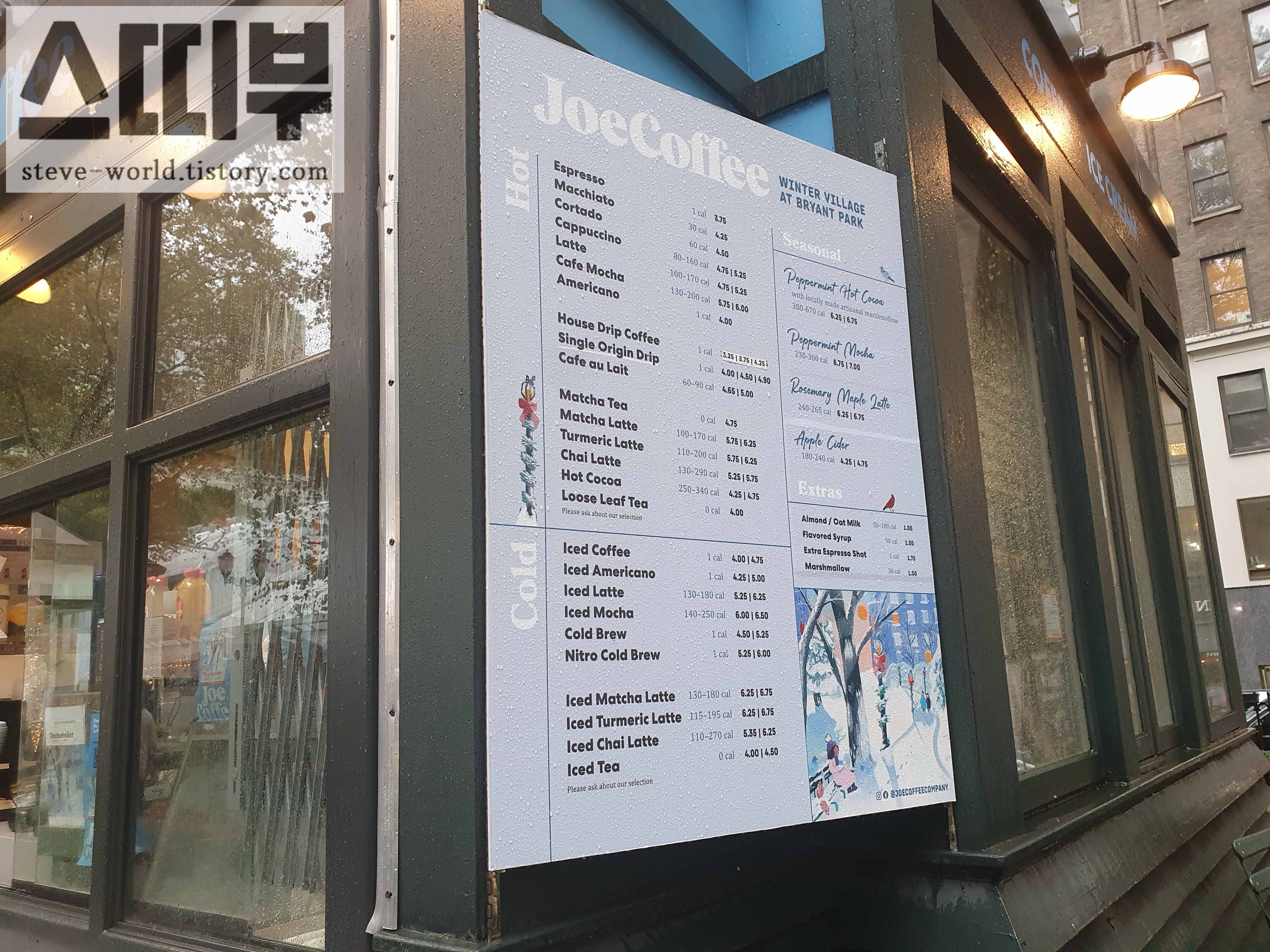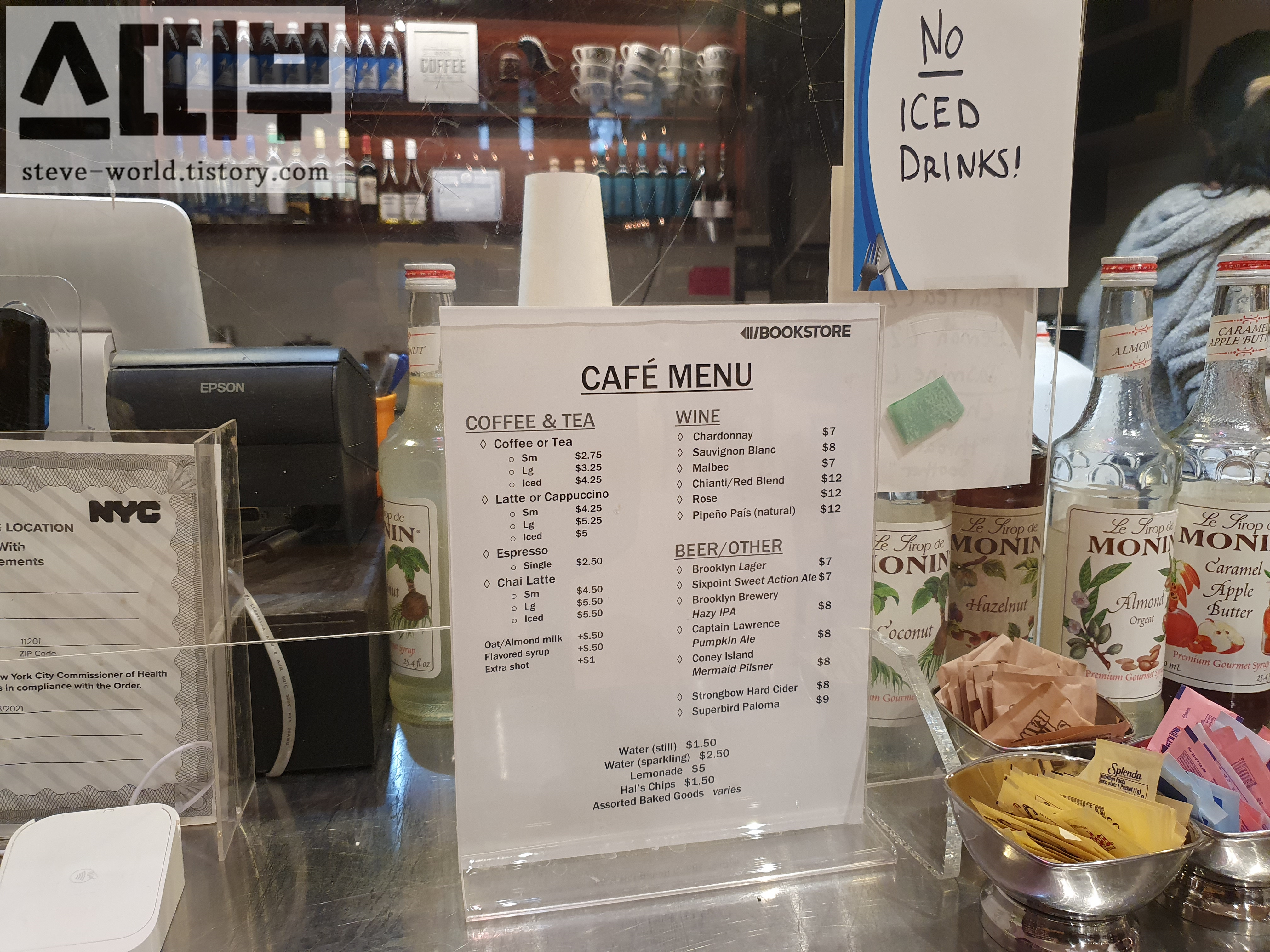 뉴욕 자유 여행, 뉴욕 맛집 2편, 뉴욕 카페, 뉴욕에서 마신 커피 모음해외 여행/2022 11월 뉴욕 2023. 2. 26. 13:06반응형뉴욕 자유 여행 후기, 뉴욕 맛집 2편은 스타벅스를 제외한 뉴욕에서 마신 커피 후기입니다. 2. 뉴욕에서 마신 커피 2-1. 블루 보틀 커피 Blue Bottle Coffee 미국에서 꼭 마셔보고 싶었던 블루 보틀 커피, 특히 라떼가 꼬숩다는 후기를 많이 접해서 라떼를 꼭 마셔보고 싶었습니다. 호텔과 가까운 거리에 있는 브라이언트 파크 지점의 블루 보틀을 찾았습니다. 블루보틀의 카페라떼는 6달러, tax 포함 6.53달러입니다.   작은 공간이지만 블루보틀만의 매력이 돋보이는 인테리어를 가지고 있습니다.   제가 주문한 카페 라떼가 나왔습니다. 종이컵에 꽉 채워주는 블루보틀 라떼입니다. 정말 우유가 고소하고 묵직해서 맛있었습니다.  브라이언트 파크 앞을 지나가면서 사진 한 장을 찍었습니다. 초록초록한 공원의 풍경과 블루보틀의 환경친화적인 종이컵이 잘 어울립니다.  다운타운행 탑뷰버스를 기다리면서 맛있게 마셨습니다. 2-2. 조 커피 컴퍼니 Joe Coffee Company 뉴욕 자유여행 후기를 보면 커피 맛집으로 조 커피를 추천하는 글들을 볼 수 있었습니다. 시차 적응이 안 되어 오후에 너무 졸려서 브라이언트 파크의 조 커피를 찾았습니다.  조 커피 브라이언트 파크 지점의 메뉴 입니다. 가장 작은 사이즈 기준으로 아메리카노는 4달러, 카푸치노와 라뗴는 4.75달러, 하우스 드립 커피는 3.25달러입니다.  오전에 커피를 한 잔 마셨기 때문에, 아메리카노보다 조금 연할 것 같은 하우스 드립커피를 주문했습니다. 조 커피는 산미 있는 원두를 쓰는 것 같습니다. 평소 산미 있는 커피를 별로 안 좋아하는데, 조 커피는 맛있었습니다. 춥고 비 오는 날이어서 더 맛있게 느껴졌을지도 모르겠습니다.     비 오는 날, 브라이언트 파크의 크리스마스 마켓을 구경하면서 따뜻한 조 커피를 마셨습니다. 매일 저녁 여행 일정이 끝나고 밤에 열린 화려한 크리스마스 마켓을 보다가, 밝은 오후의 크리스마스 마켓을 보는 것은 또 색달랐습니다. 녹색의 나무들이 보이는 풍경 덕에 공원이 생기 있게 느껴졌습니다. 2-3. 라 콜롬브 커피 로스터스 La Colombe Coffee Roasters 매그놀리아 컵 케이크와 바나나 푸딩을 포장해 호텔 가는 길에 마실 것이 필요해서 라 콜롬브에 들렸습니다. 역시나 호텔과 가까운 라 콜롬브 브라이언트 파크 지점으로 향했습니다. 오전에 많이 돌아다닌 탓에 갈증이 나서, 아주 시원한 라떼를 마시고 싶었습니다. 라 콜롬브는 드래프트 라떼가 유명하다는 후기를 접한 적이 있습니다. 11월 여행이라 따뜻한 음료를 많이 먹을 것 같아 못 마셔보나 싶었는데, 마침 시원한 커피가 마시고 싶어서 라 콜롬브로 직진했습니다.   오트밀크 드래프트 라떼도 많이 주문하던데, 저는 기본 드래프트 라떼를 선택했습니다. 드래프트 라지 사이즈, Whole milk, 너무 목이 말라서 얼음도 넣어달라고 했습니다. 가격은 tax포함 6.8달러입니다.  생맥주처럼 미세한 거품이 잔뜩 있는 라 콜롬브 드래프트 라떼입니다. 스푼으로 한번 휙 젓고 뚜껑을 닫았습니다. 빨간 비둘기 로고가 새겨진 컵이 예쁩니다.  나가기 전에 카페에서 사진 한 잔 찍었습니다.   카페에서 나오자마자 벌컥벌컥 마셨더니, 호텔 도착과 동시에 거의 다 마셨습니다. 목마를 땐, 라지사이즈도 부족하게 느껴집니다. (매그놀리아 컵케이크랑 같이 먹으려고 사 왔더니, 이미 다 뱃속에 들어갔어요.) 라 콜롬브 드래프트 라떼를 주문할 땐, 얼음을 빼고 주문하는 것이 드래프트 라떼만의 미세 거품을 좀 더 잘 느낄 수 있을 것 같습니다. 저는 너무 갈증 나서 얼음 추가를 했는데, 얼음 부피만큼 양도 적어진 것 같고, 얼음과 닿아있는 컵의 아래쪽 라떼는 거품이 많이 죽어서 조금 아쉬웠습니다. (하지만, 얼음 추가하면 더 시원해져서 여름에는 얼음을 꼭 추가해야 할 것 같기도 합니다.) 드래프트 라떼의 거품이 얼마나 부드러운지, 마시면 온몸으로 커피가 바로바로 흡수되는 기분입니다. 뉴욕 여행 중 부드럽고 시원한 라떼가 드시고 싶으시다면, 라 콜롬브 드래프트 라떼 강력 추천합니다. 2-4. 하우징 웍스 북 스토어 내 카페 Housing Works Bookstore 저는 뉴욕 soho를 여행할 때, 주로 서점을 방문했습니다. 쇼핑에 크게 관심이 없기도 하고, 제가 뉴욕을 방문했던 22년 11월이 달러가 고점을 찍었을 때라.. (여행 한 달 전인 1400원대에 현금 환전을 하고, 여행할 때 환율은 1340원이었습니다.) 뉴욕 시내에서는 소소한 기념품정도만 구입하고 여행에 집중한 것 같습니다. 뉴욕 시내에서는 tax가 별도로 붙기 때문에 더 비싸게 느껴지더라고요. 쇼핑에 큰 흥미가 없는 분들은 뉴욕 서점투어를 하는 것도 좋은 여행 계획일 것 같습니다. 다녀온 서점 중 한 군데였던 Housing Works Bookstore입니다.   하우징 웍스는 중고 의류, 가구를 운영하는 재단인데, 이 북스토어에서는 중고책과 음반을 판매하고 있습니다. BAR라는 간판이 있는 곳에서 음료를 판매하고 있습니다.  커피, 차, 와인, 맥주를 판매하고 있고, 아이스 음료는 안된다고 합니다. 그리고 테이블에서 노트북을 하는 것 안된다고 되어있습니다.     좋은 공간