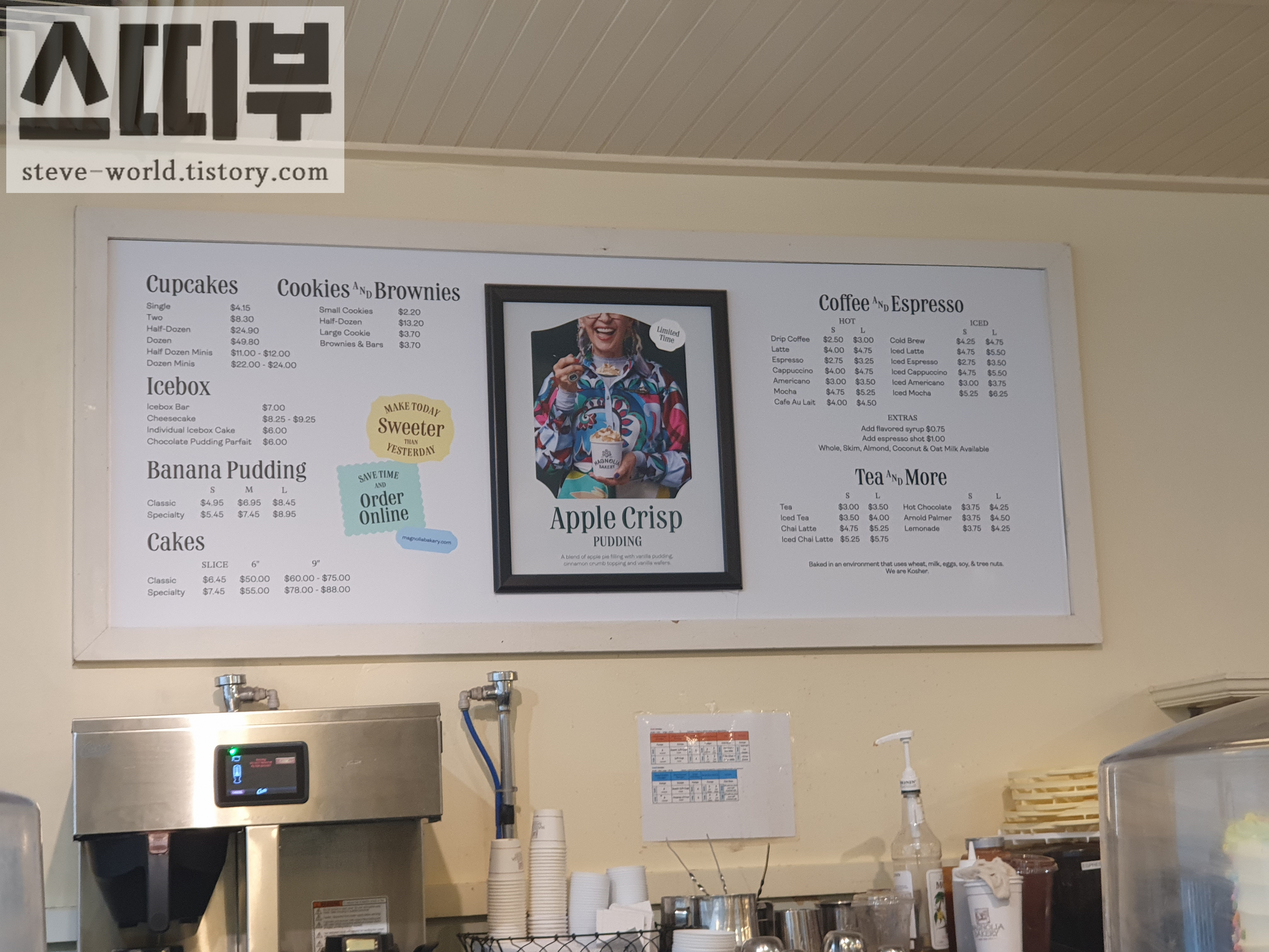 위치 : 뉴욕 내 지점이 정말 많습니다. 센트럴파크 지점, 록펠러 센터 지점, 그랜드 센트럴 터미널 지점, 모이니한 열차 홀 지점, 허드슨 야드 지점, 섹스 앤 더 시티의 캐리 브래드쇼 아파트와 가까운 그리니치 빌리지에 있는 블리커 스트리트 지점 등 뉴욕 여행하면서 한 번은 꼭 마주하게 됩니다. 저는 라디오시티 뮤직홀 가까이 있던 록펠러 센터의 매그놀리아 베이커리를 방문했습니다.