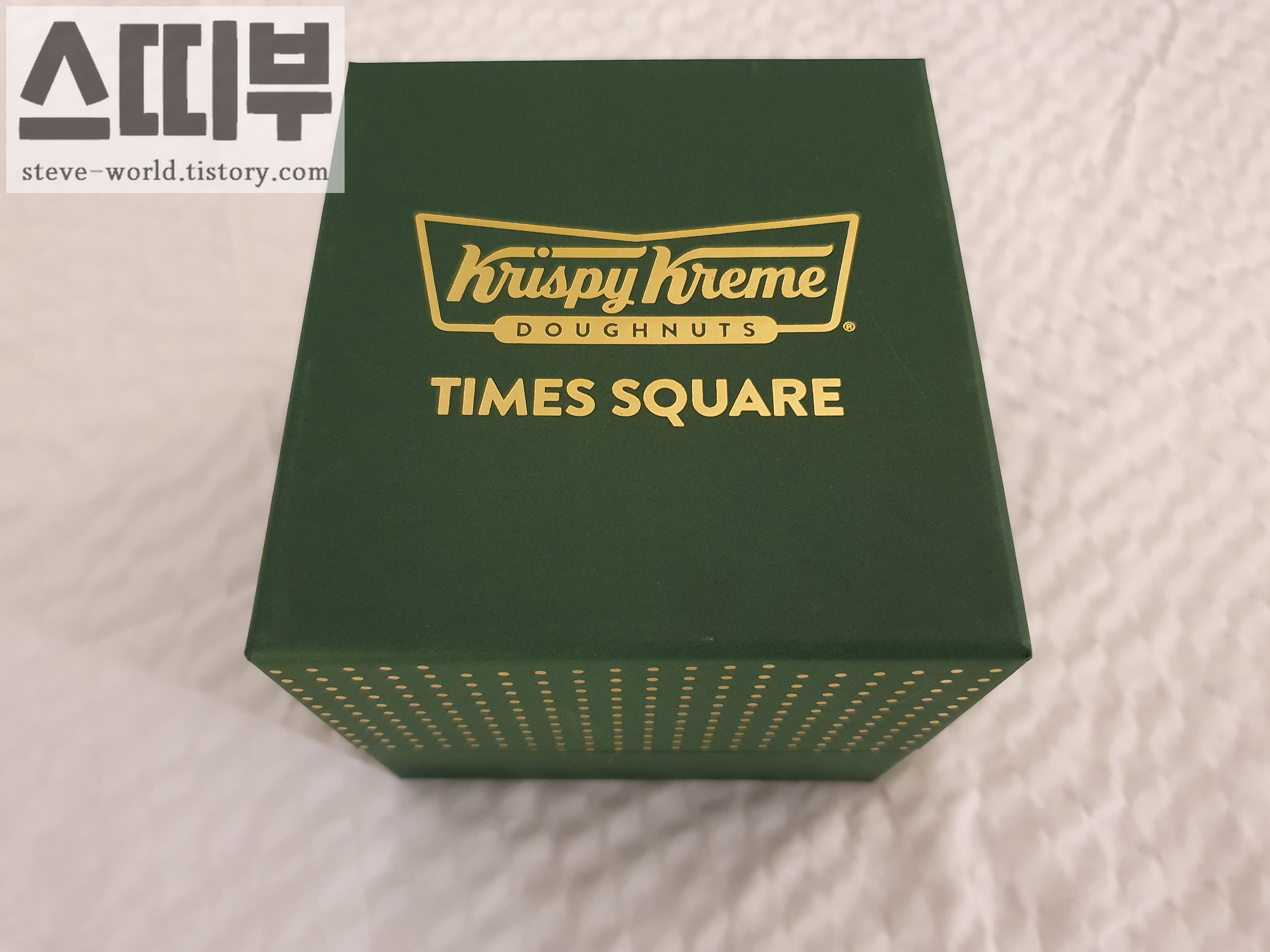 상자가 상당히 멋있습니다. 보석이 들어있을 것 같은 단단한 녹색 상자입니다. 금장으로 새겨진 크리스피 크림 도넛 로고도 멋있고요, 타임스퀘어에서만 판매하는 것이라서 time square도 새겨져 있습니다.