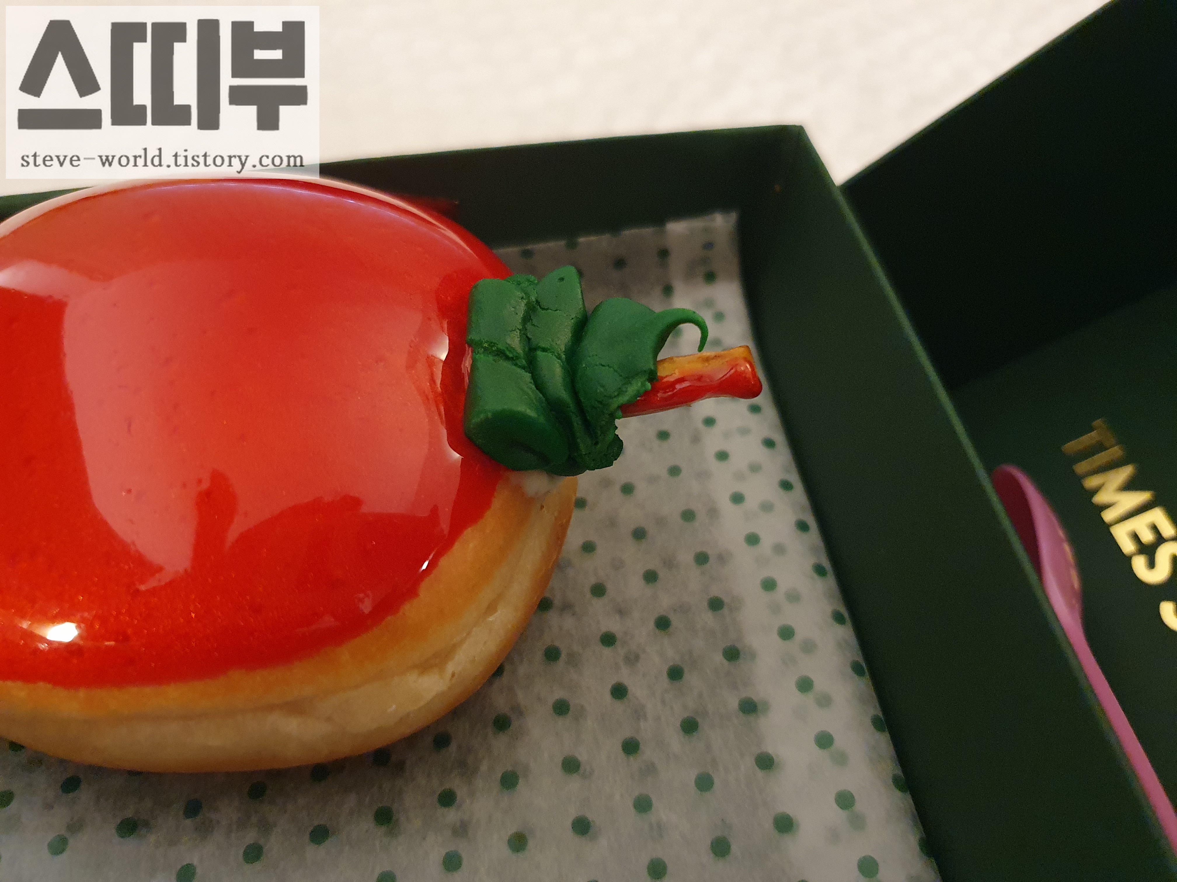 그러던 참에 한 줄로 나열되어 있던 사과 도넛이 눈길을 사로잡았습니다. 붉은 시럽이 올라가 입체적인 사과를 잘 표현한 도넛이었습니다.